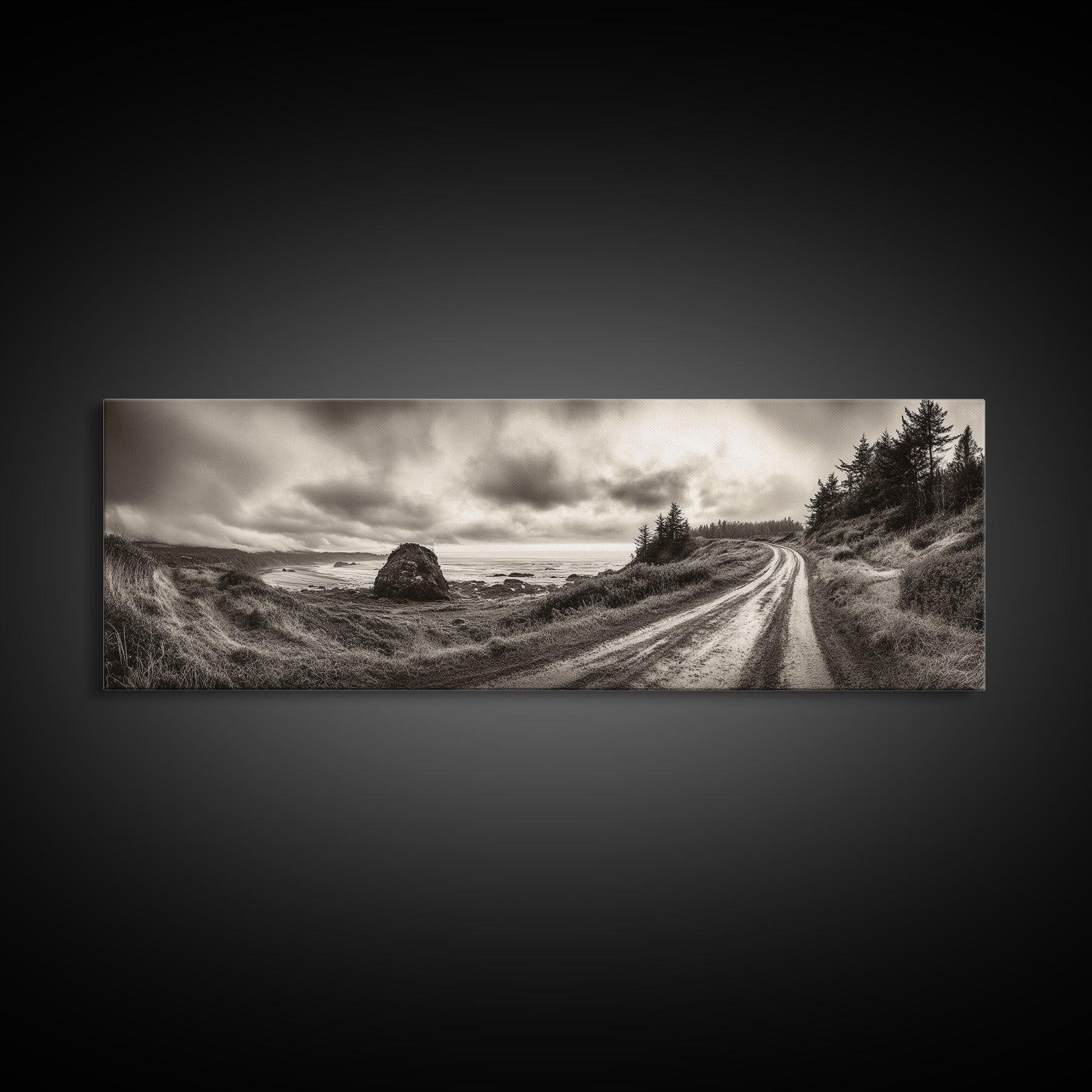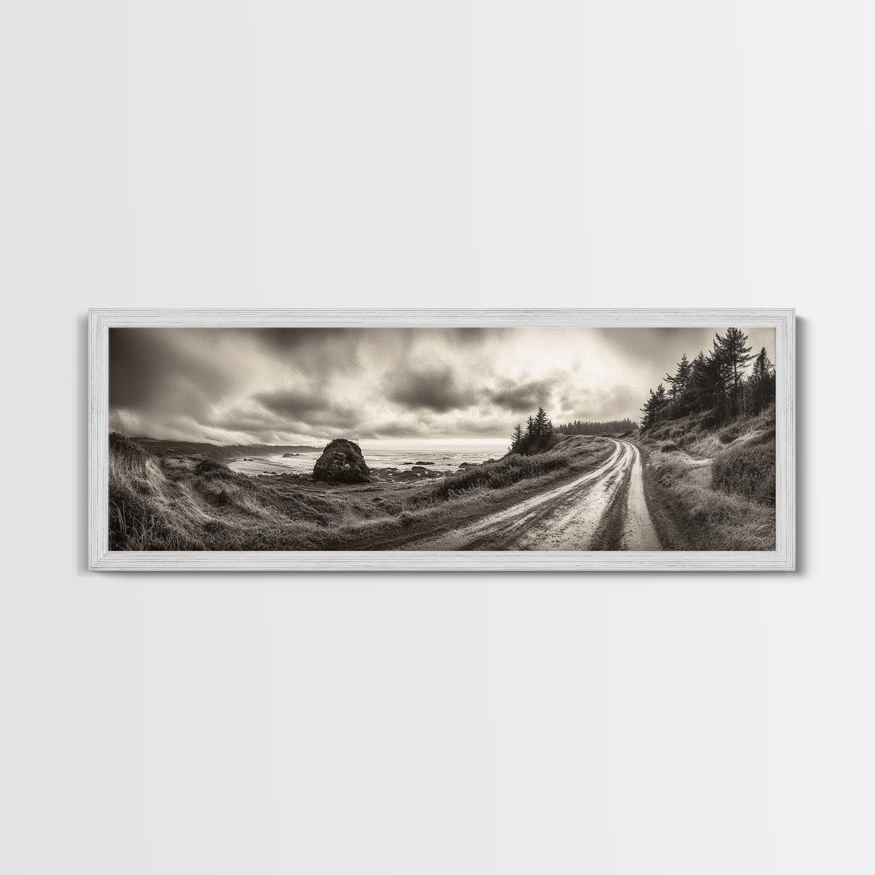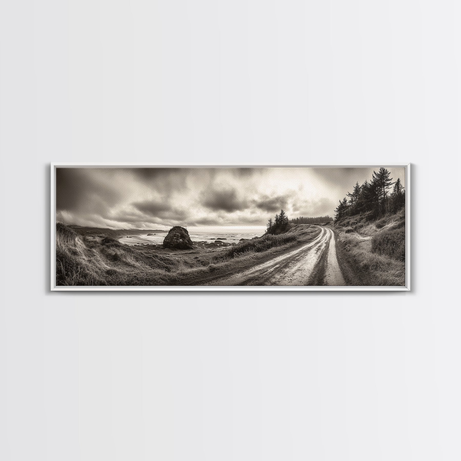Coastal Road Journey, Overcast Ocean View, Scenic Drive Art, Framed Canvas Print, Fall Landscape Wall Art, Nature Lover, Living Room Decor