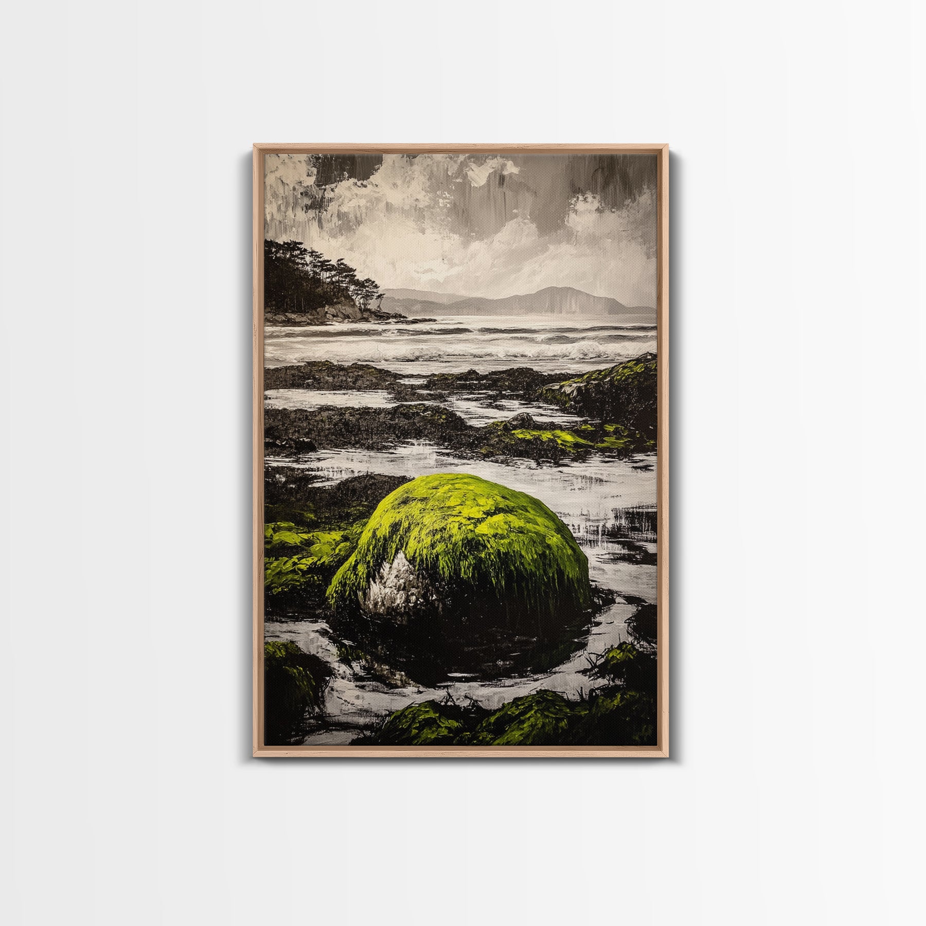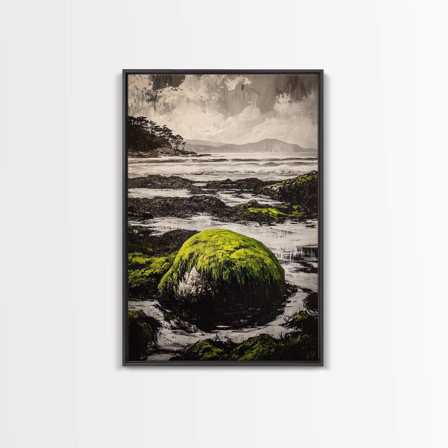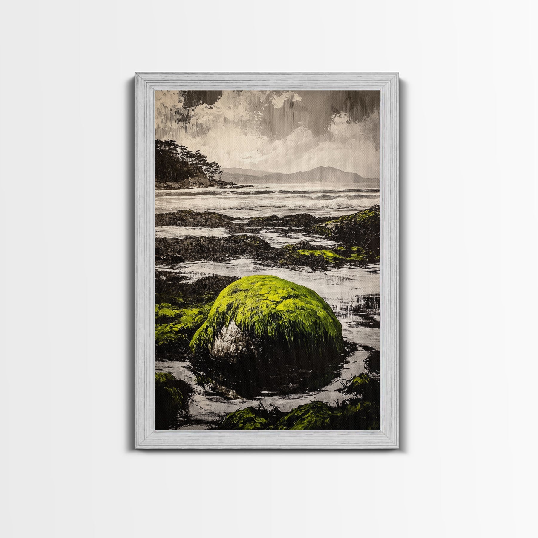 Coastal Rocks, Mossy Shore, Framed Canvas Print, Ocean Landscape, Beach House Wall Art, Nautical Decor, Green Nature, Relaxing Art