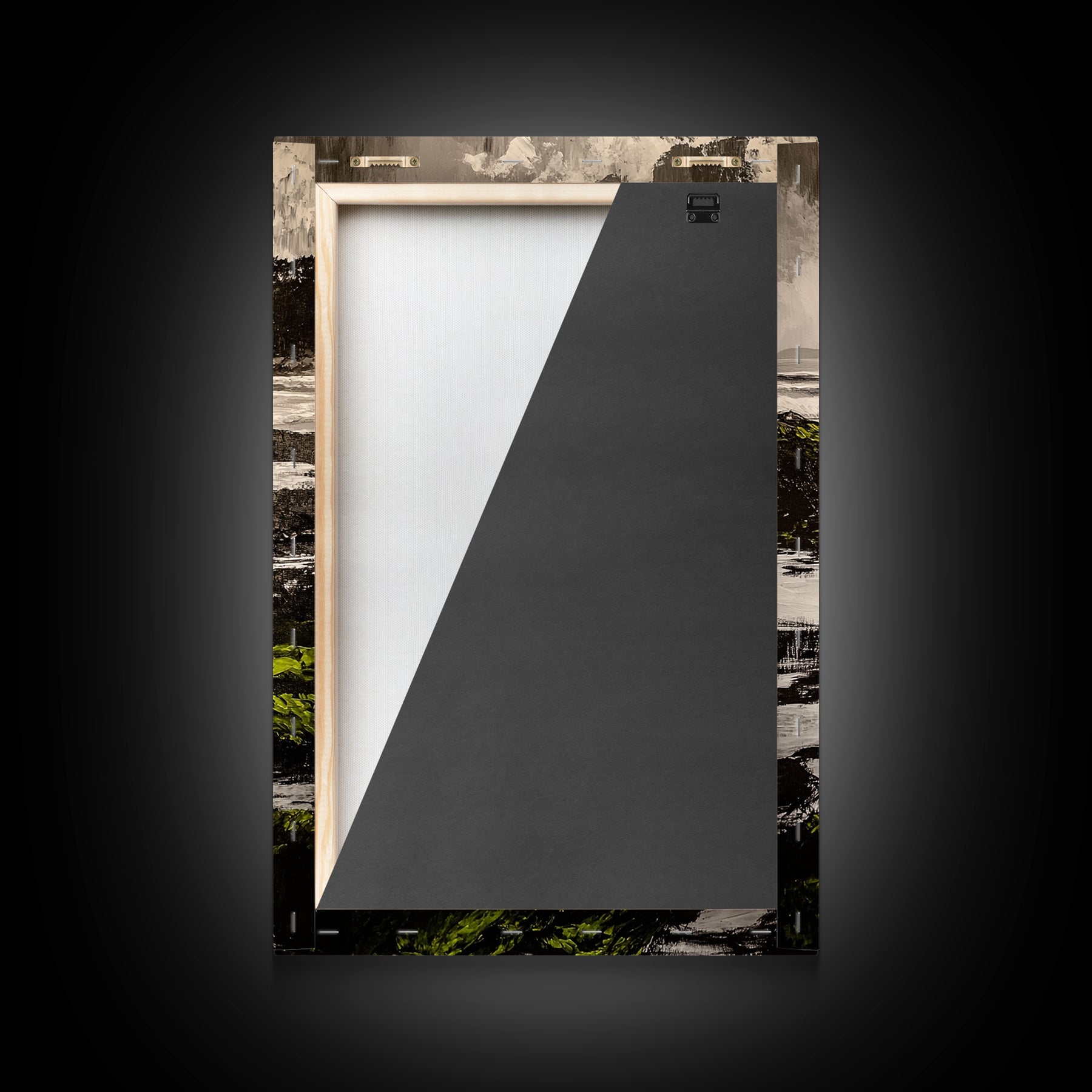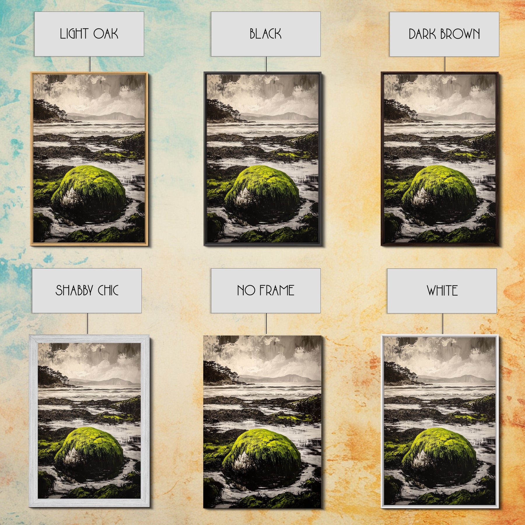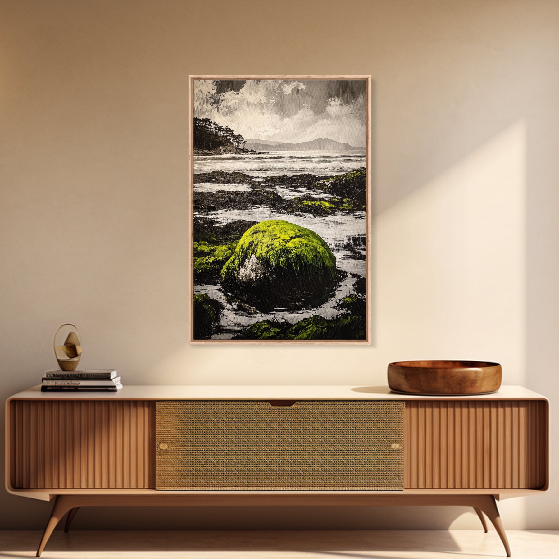 Coastal Rocks, Mossy Shore, Framed Canvas Print, Ocean Landscape, Beach House Wall Art, Nautical Decor, Green Nature, Relaxing Art