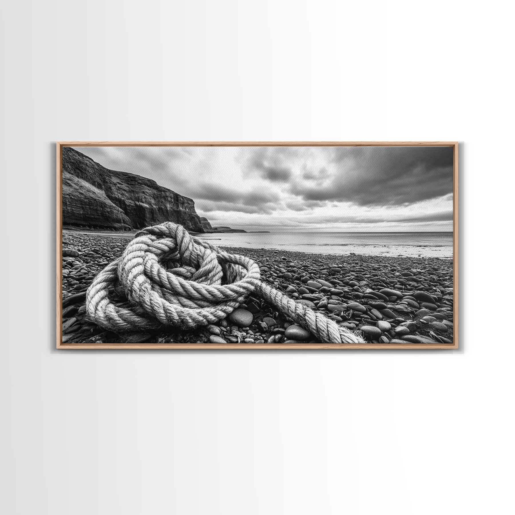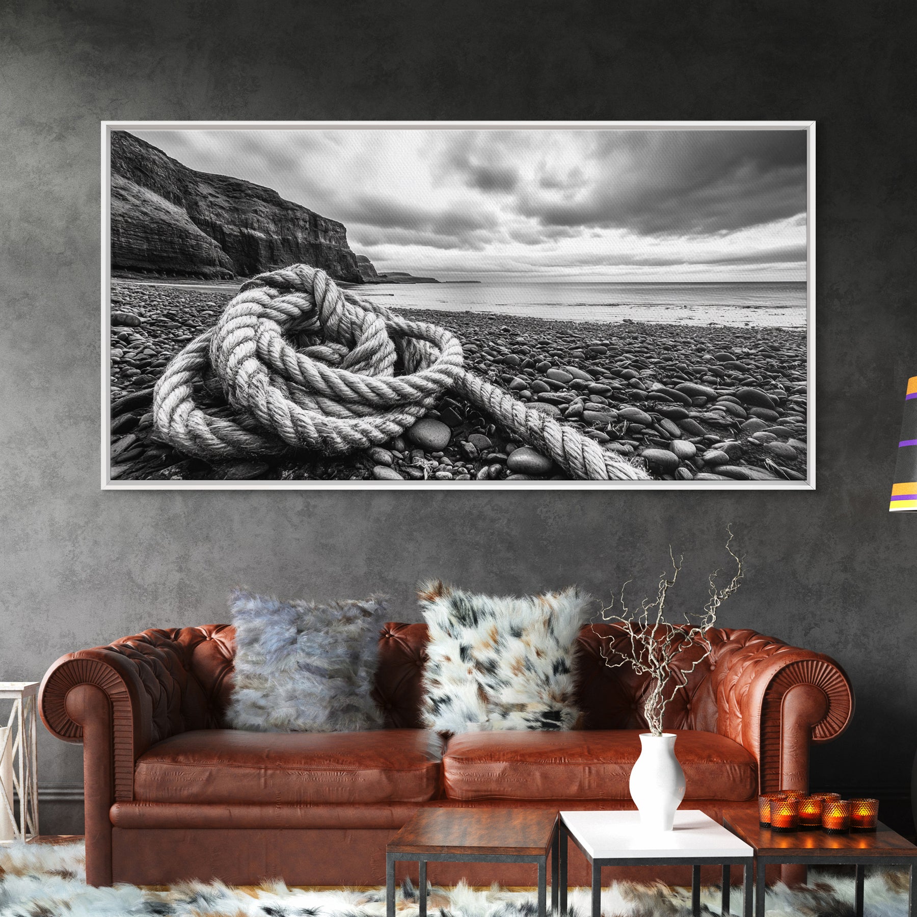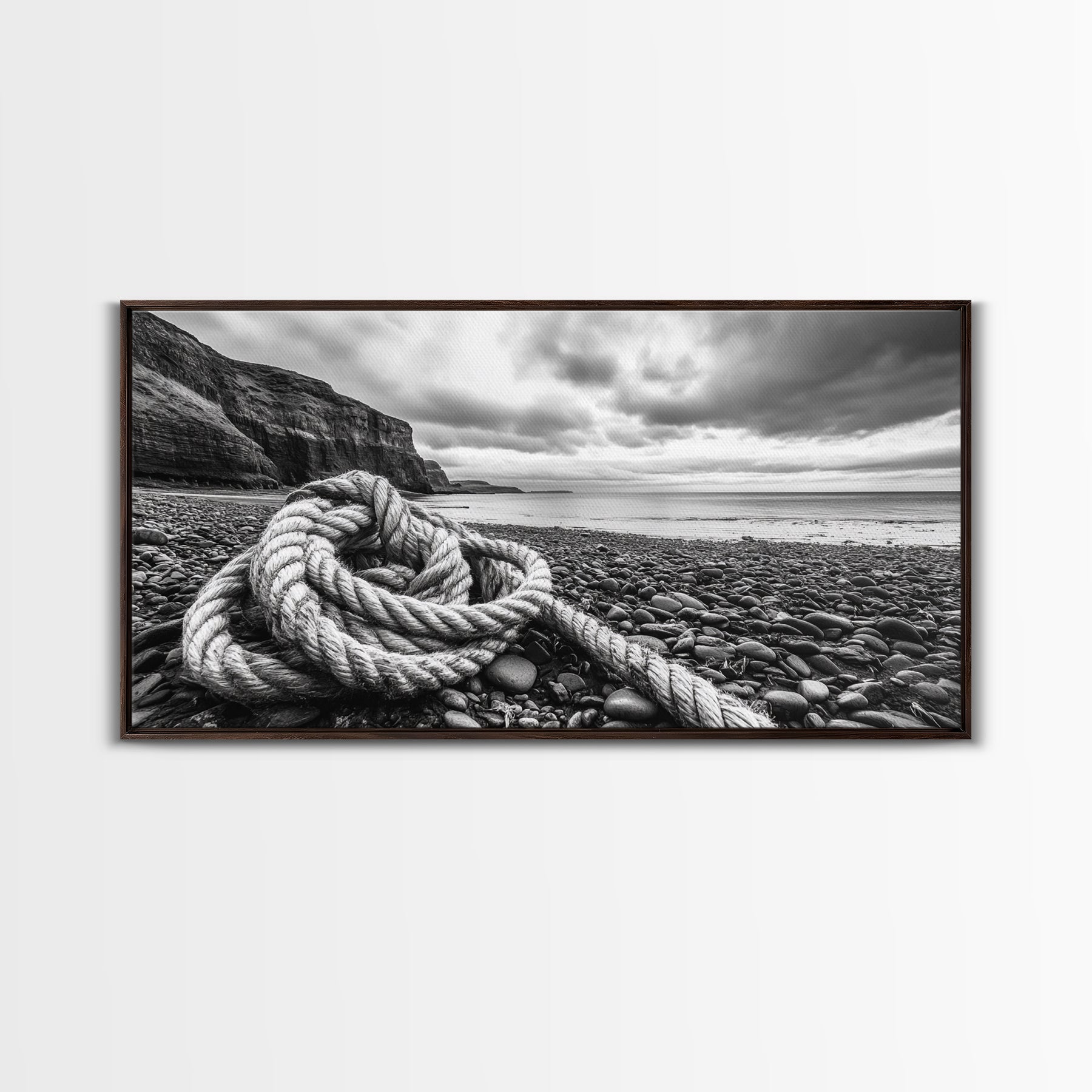 Coastal Rope, Pebble Shore, Nautical Texture, Rugged Seascape, Canvas Print, Bathroom Wall Art, Beach House Style, Moody Ocean Decor