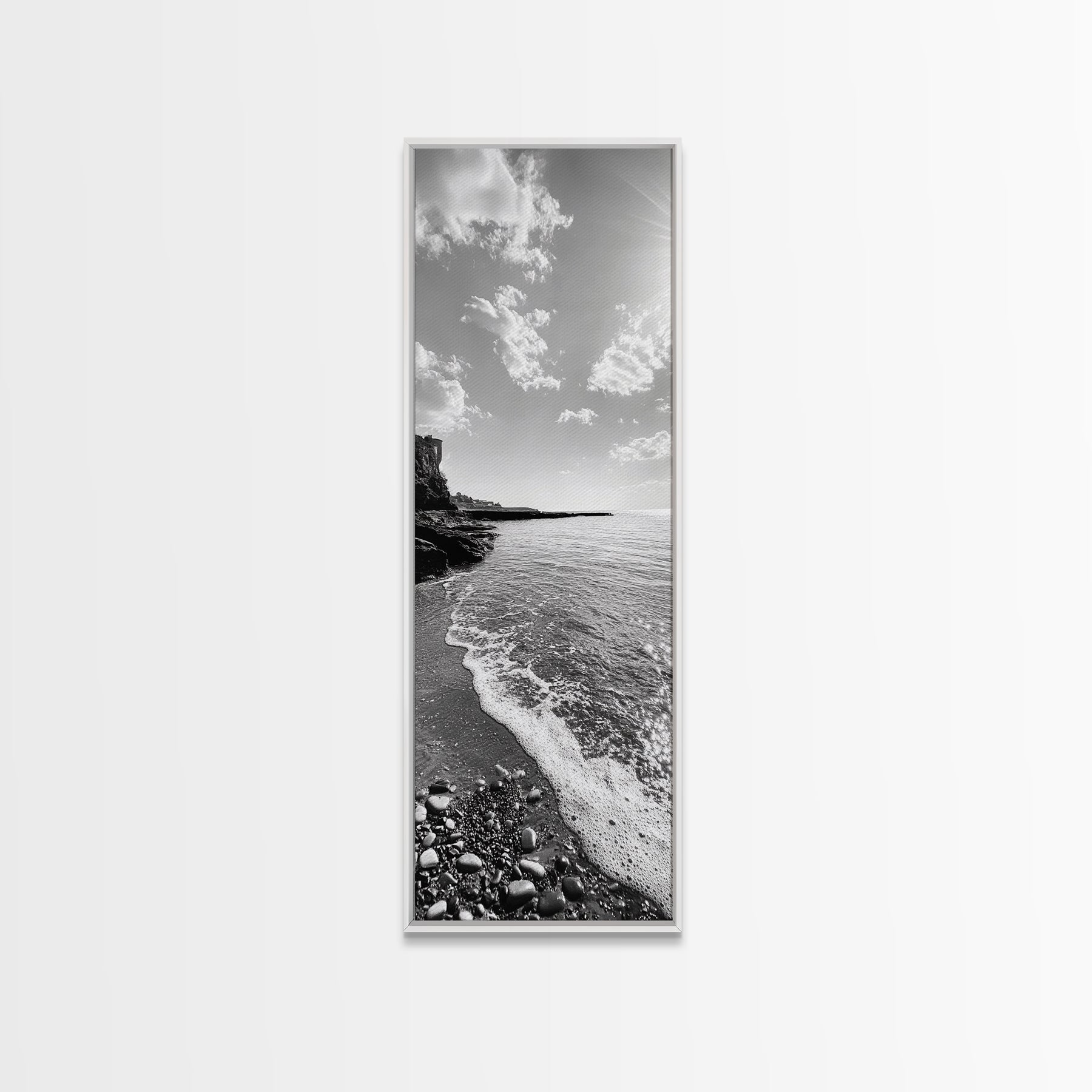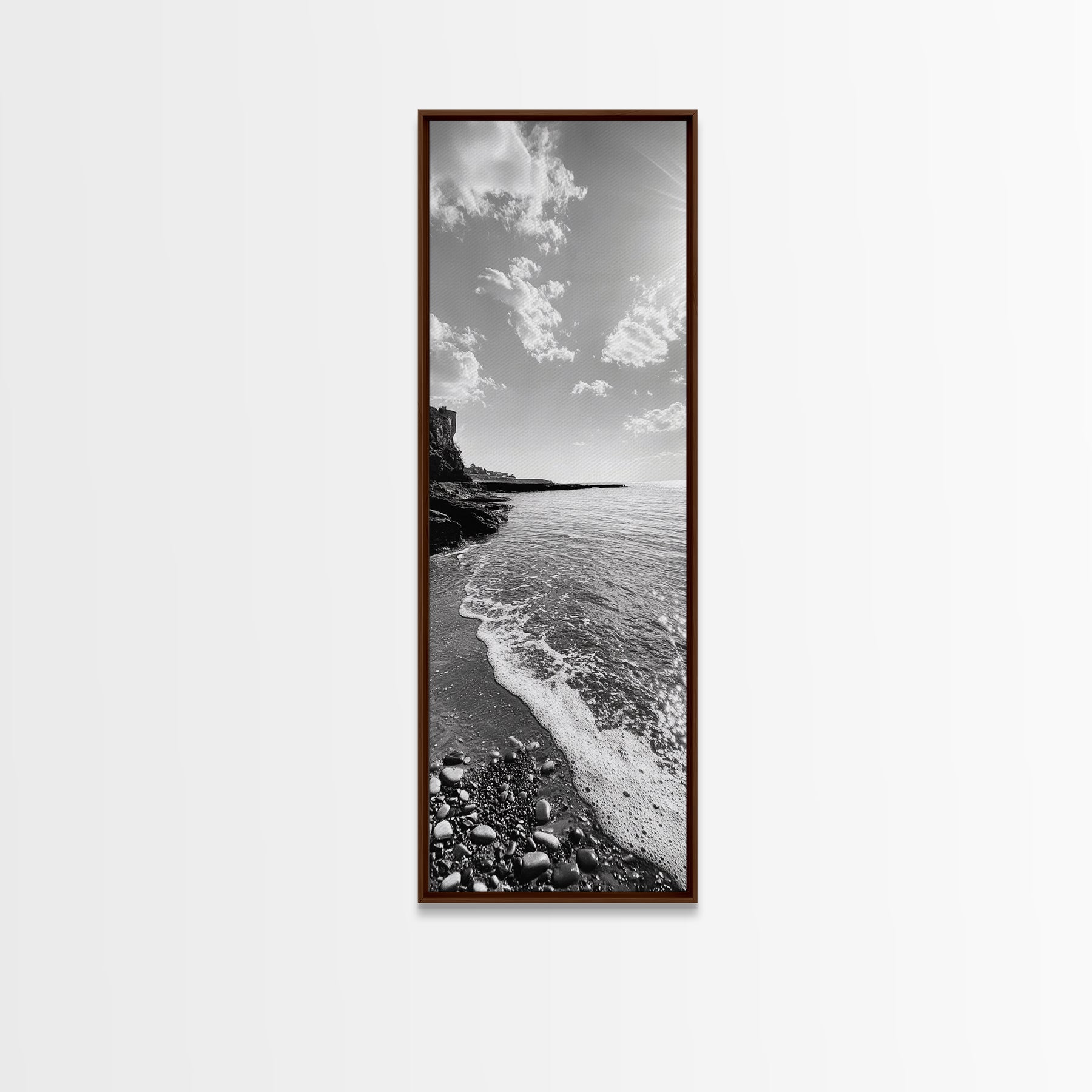 Coastal Shoreline, Pebble Beach, Ocean Breeze, Canvas Print, Bathroom Wall Art, Minimalist Decor, Black White Photography, Seaside Vibe