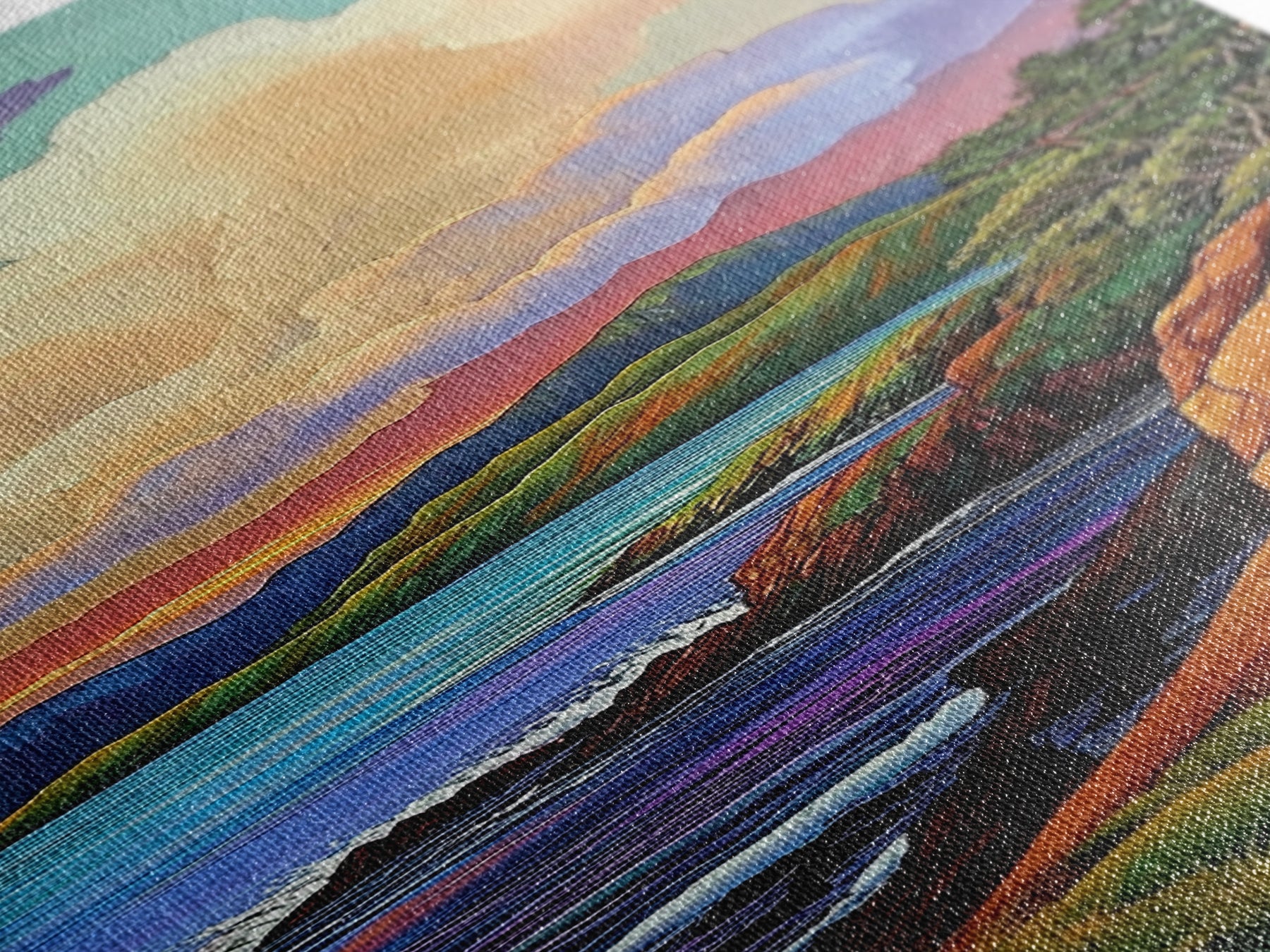 Most of our canvases are made in the USA, with the exception of canvases ordered with the light oak unstained frames, and any large canvases (24x48, 30x60, 16x48 and 20x60) ordered WITH a frame. These are temporarily made in and shipped from Europe, while we try to find a more consistent supplier in the USA.