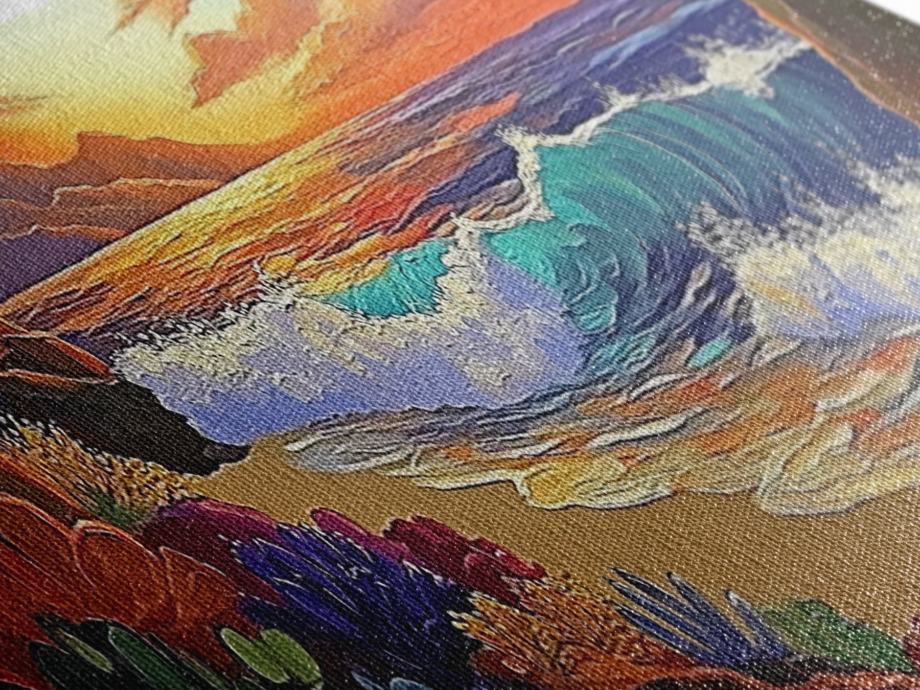 Most of our canvases are made in the USA, with the exception of canvases ordered with the light oak unstained frames, and any large canvases (24x48, 30x60, 16x48 and 20x60) ordered WITH a frame. These are temporarily made in and shipped from Europe, while we try to find a more consistent supplier in the USA.
