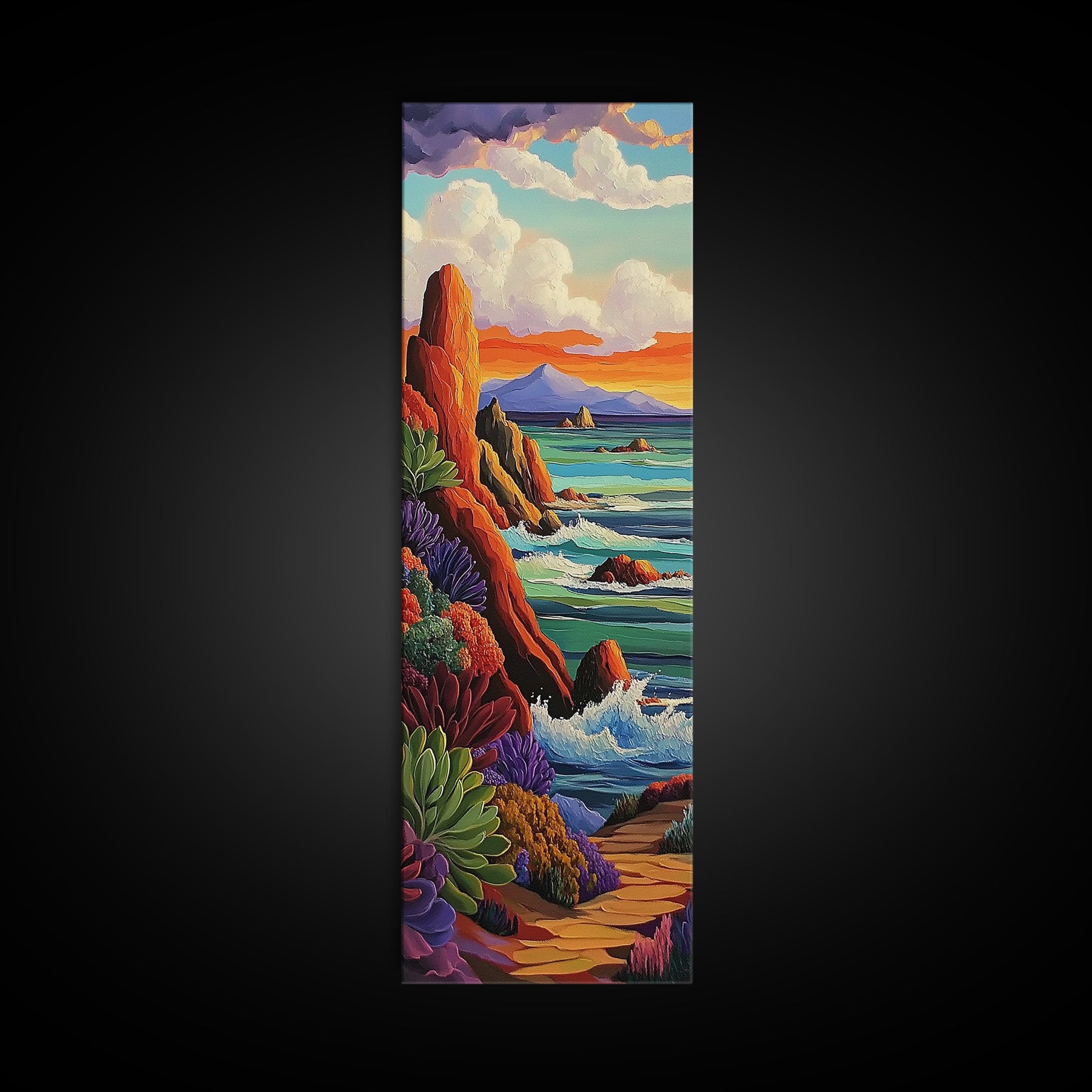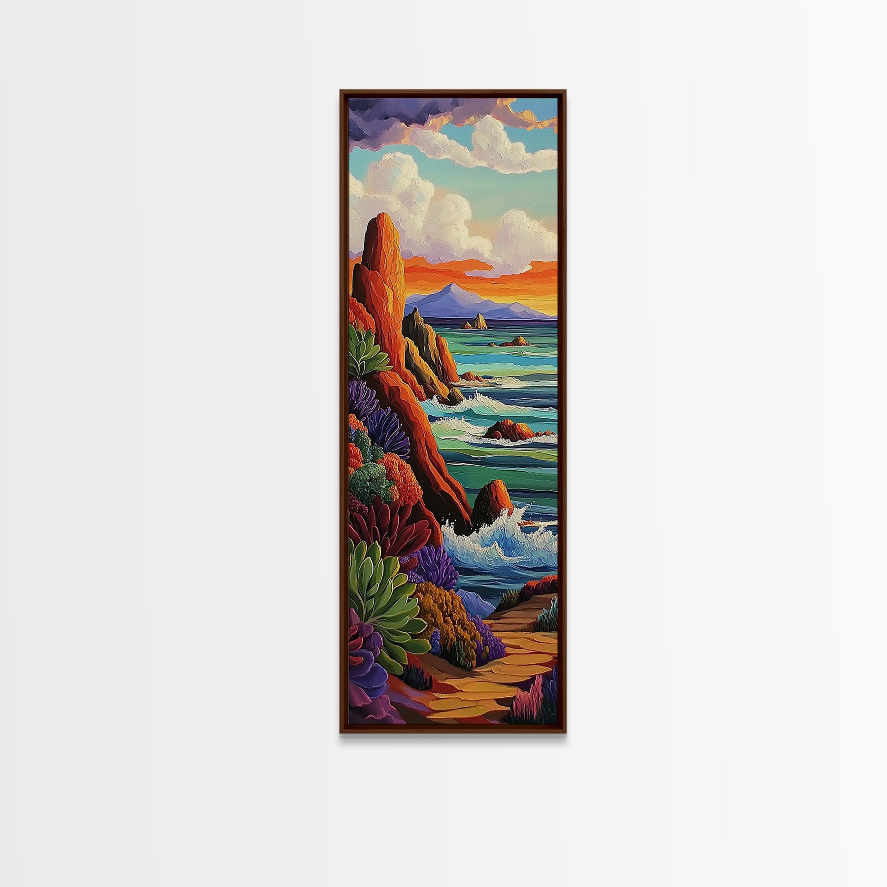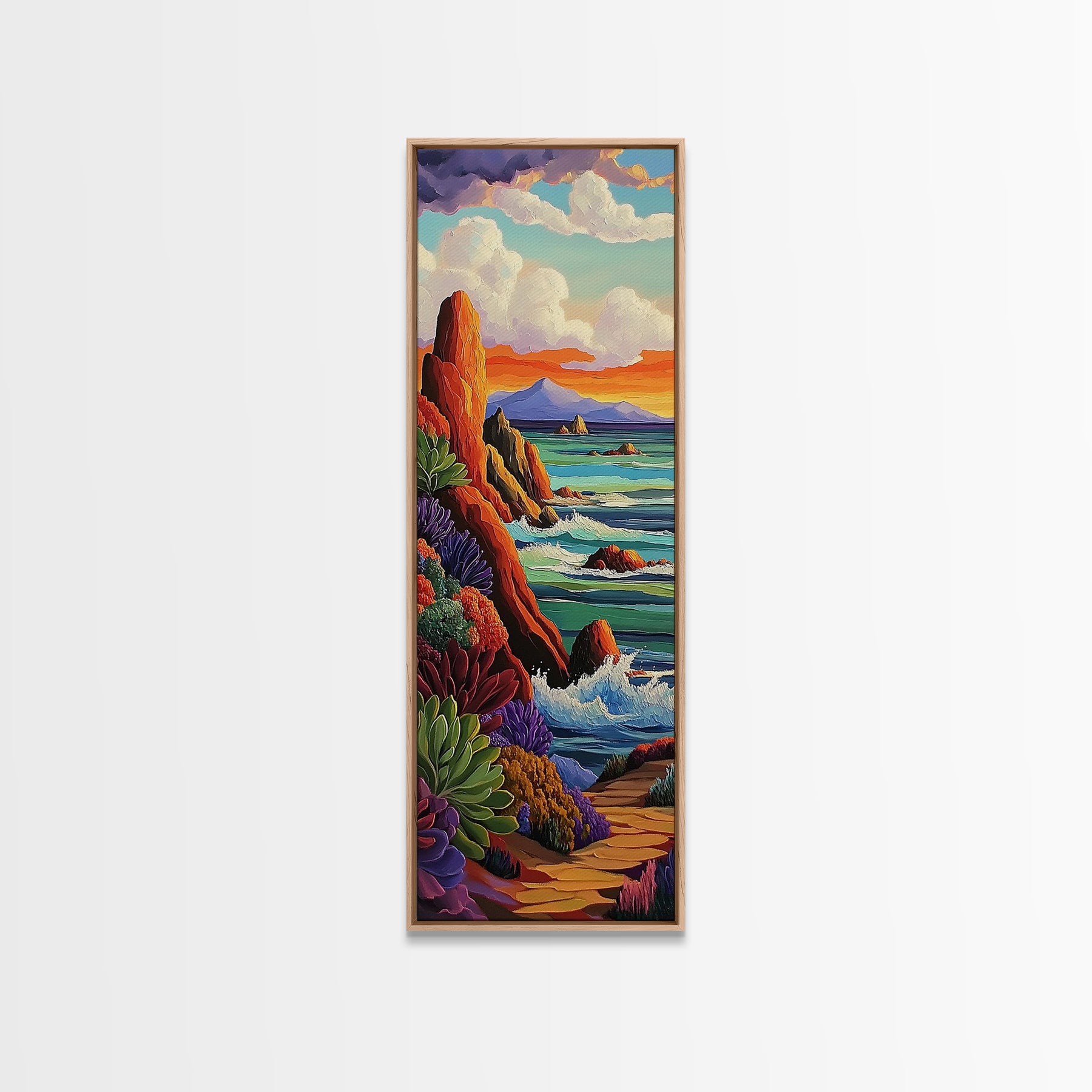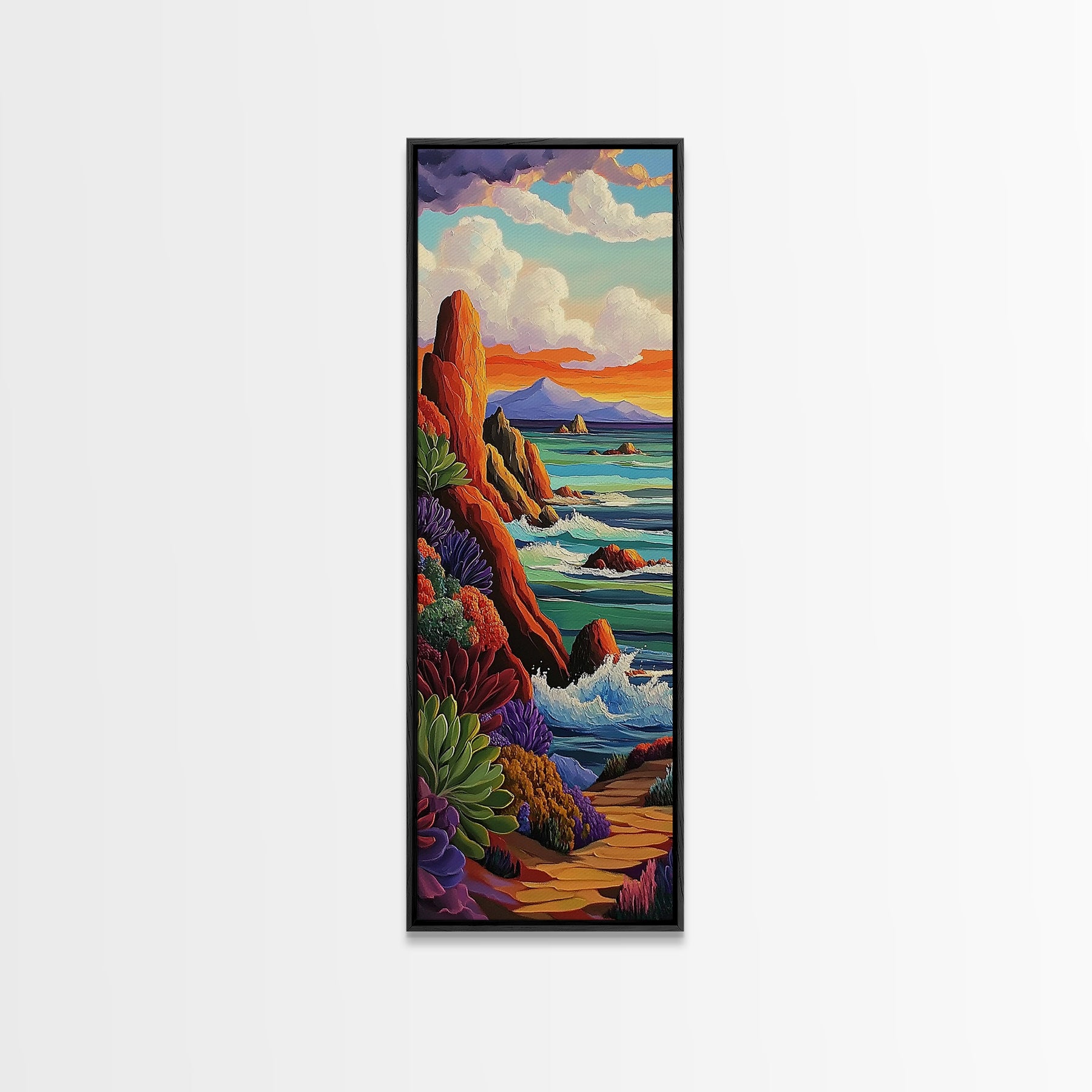 Coastal, Sunset, Seascape, Vibes, Framed Canvas Print of ocean cliffs and crashing waves, modern coastal wall art, beach house decor