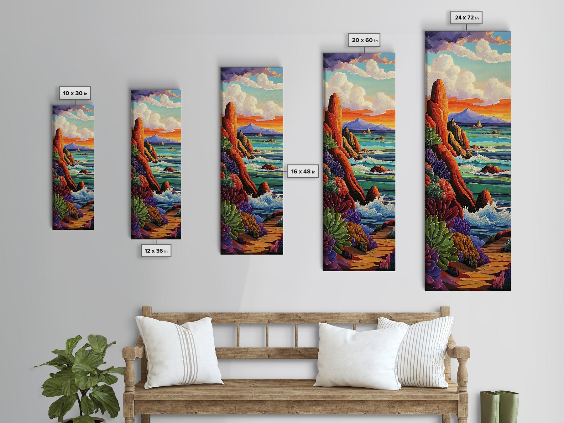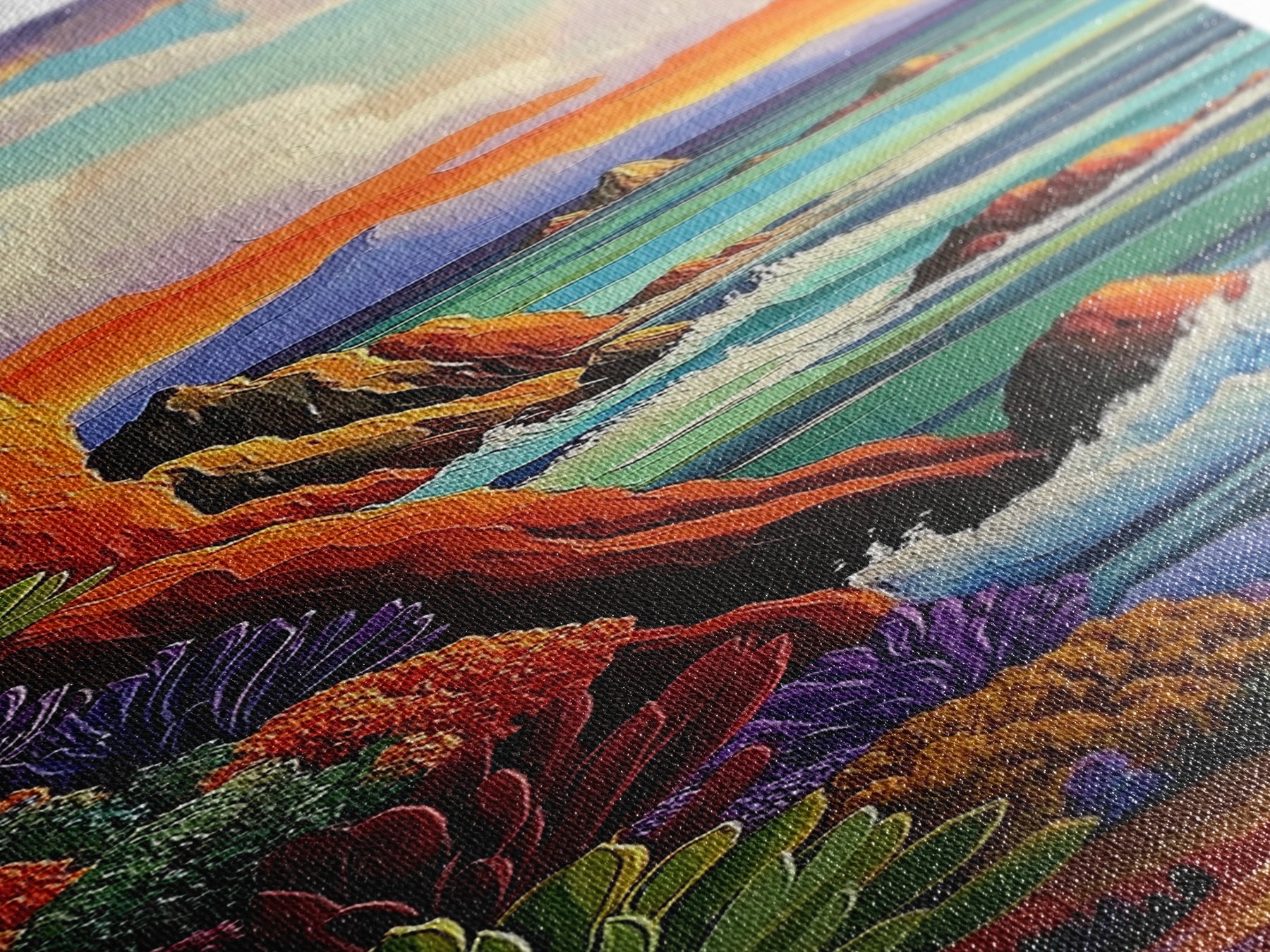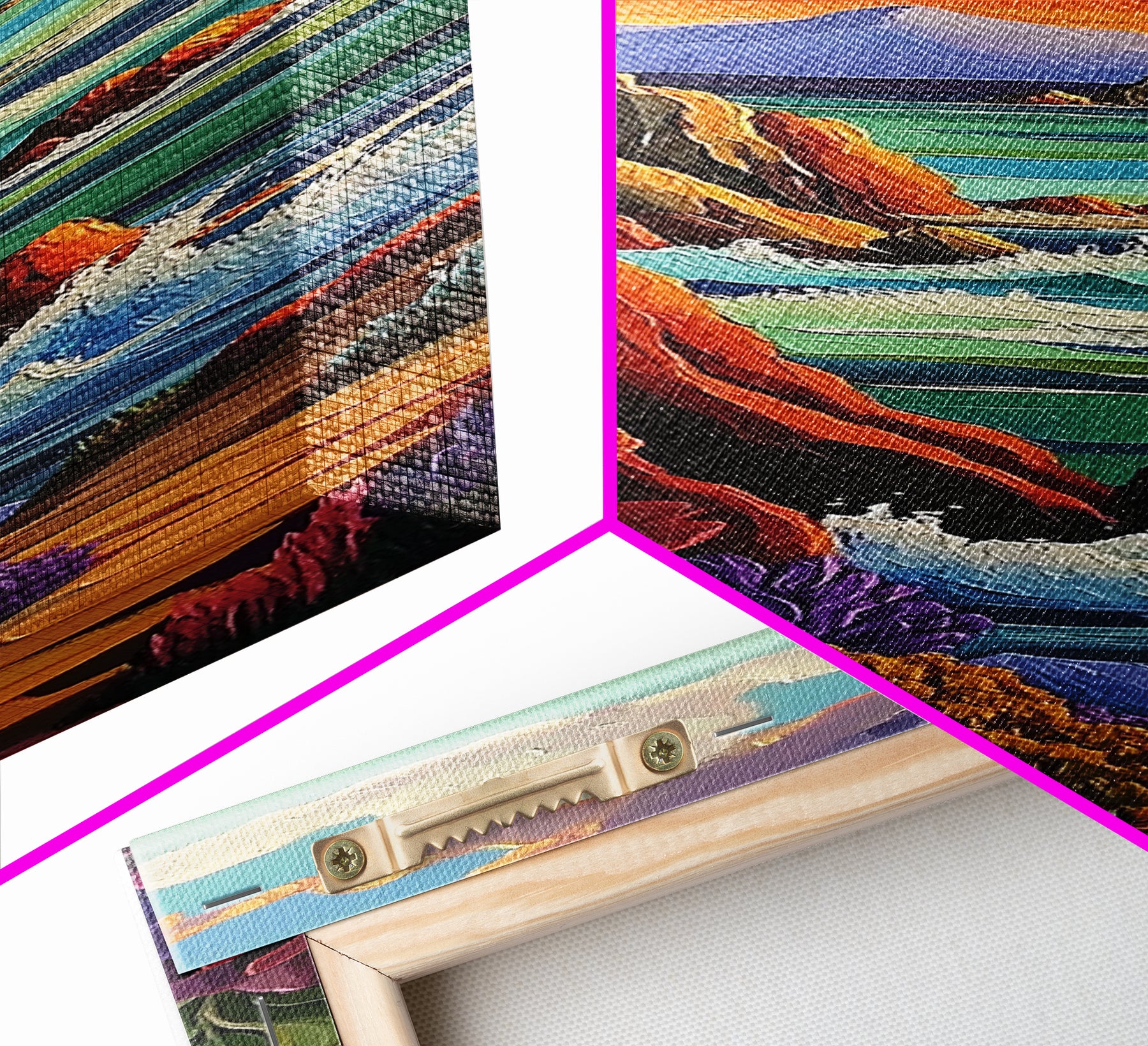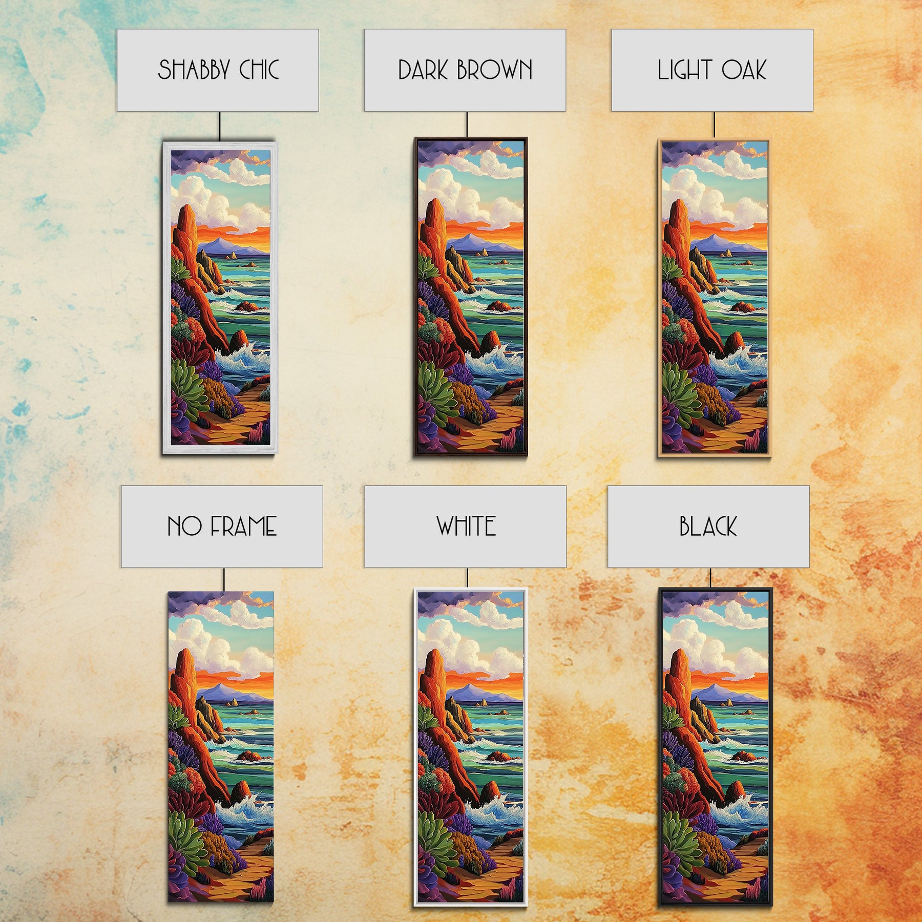 Coastal, Sunset, Seascape, Vibes, Framed Canvas Print of ocean cliffs and crashing waves, modern coastal wall art, beach house decor