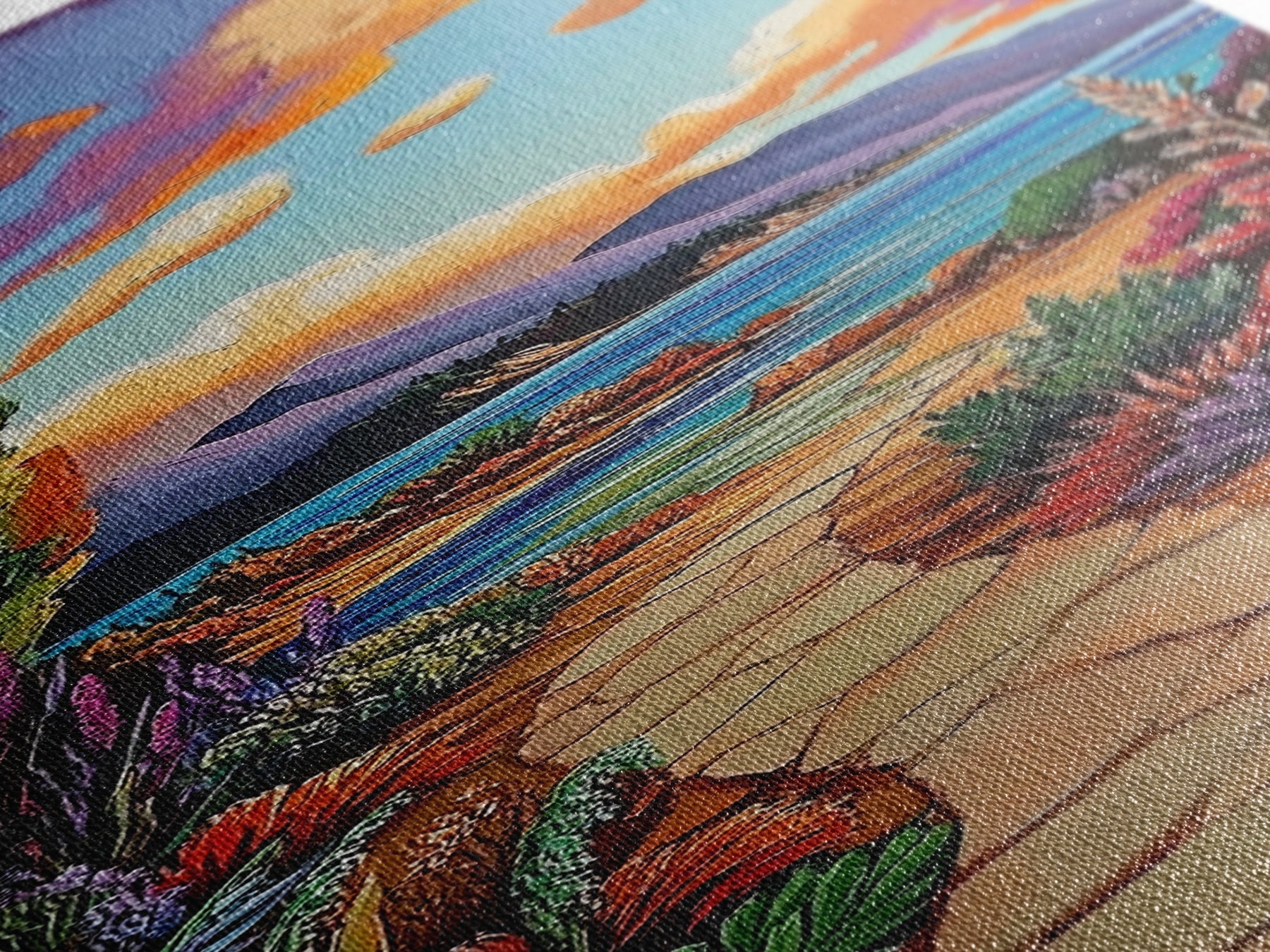 Most of our canvases are made in the USA, with the exception of canvases ordered with the light oak unstained frames, and any large canvases (24x48, 30x60, 16x48 and 20x60) ordered WITH a frame. These are temporarily made in and shipped from Europe, while we try to find a more consistent supplier in the USA.
