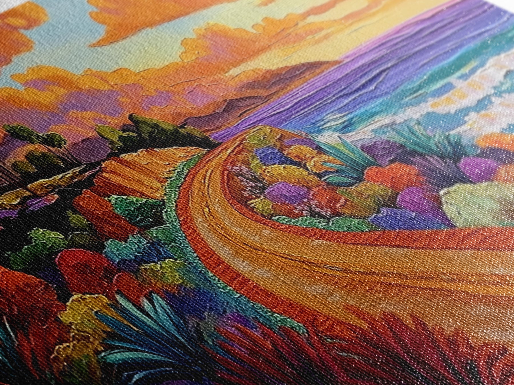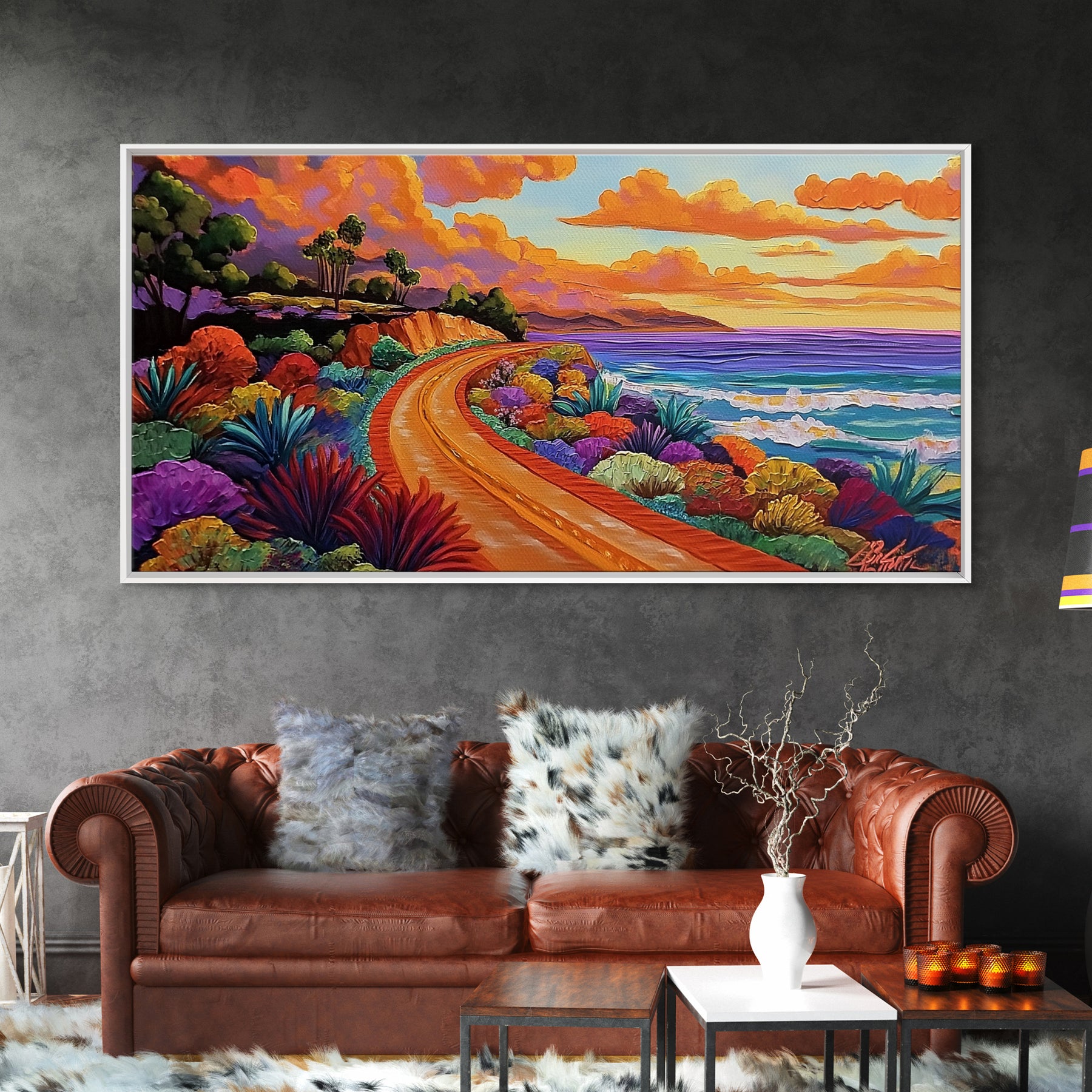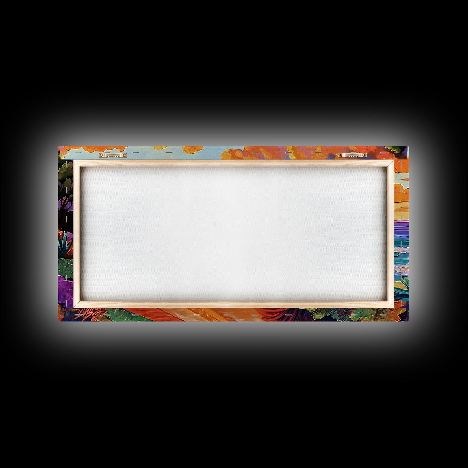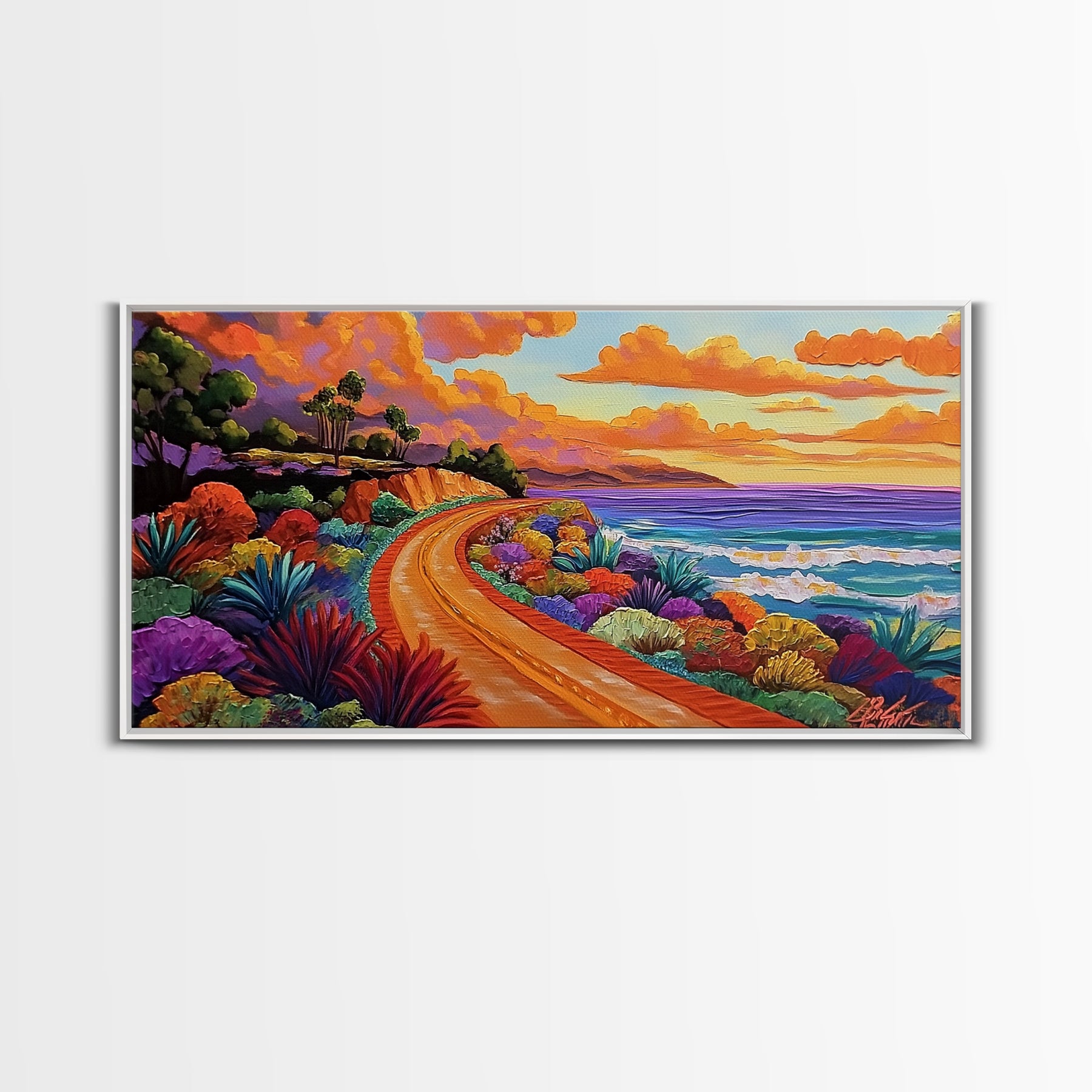 Coastal Train, Sunset, Framed Canvas Print, Vibrant coastal sunset railway painting, Colorful beachscape boho art, Hallway Wall Art