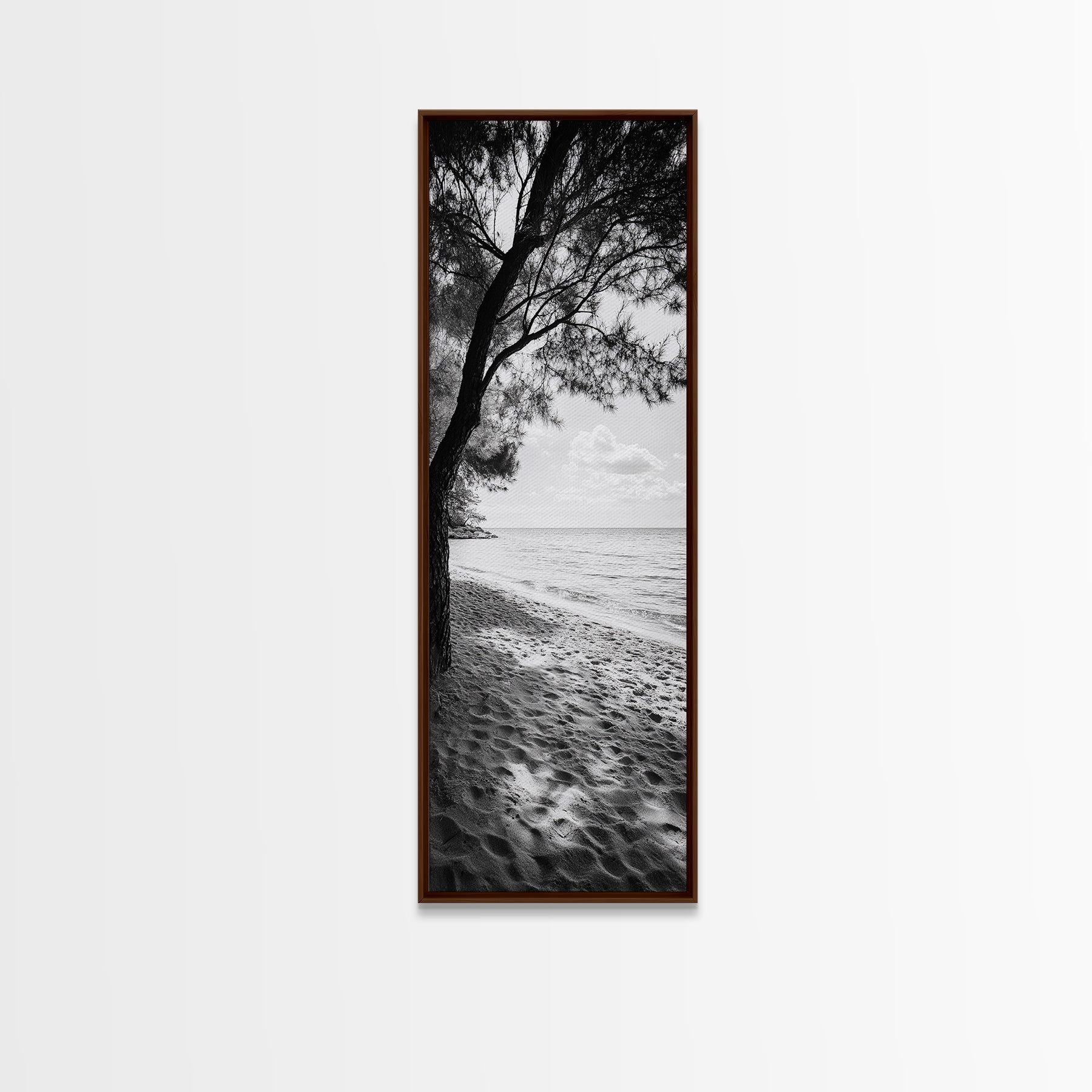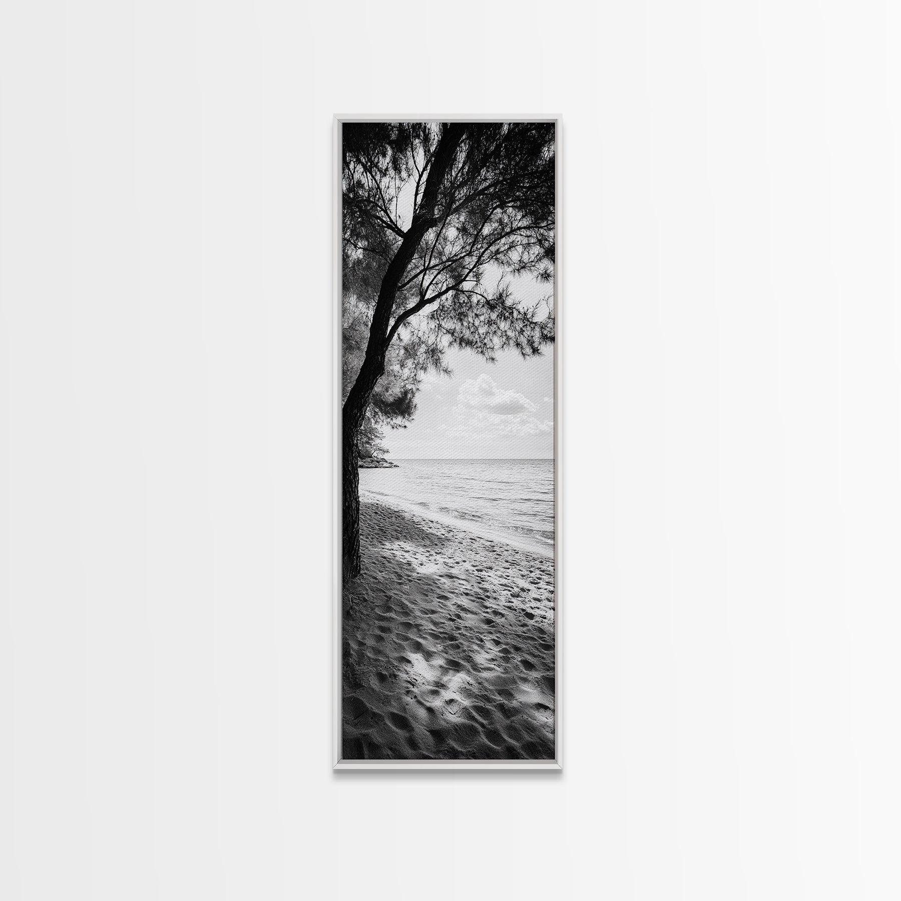 Coastal Tree Shade, Beach Sand Path, Seaside Serenity, Nature Retreat, Framed Canvas Print, Bathroom Wall Art, Neutral Tones, Calm Ocean Art