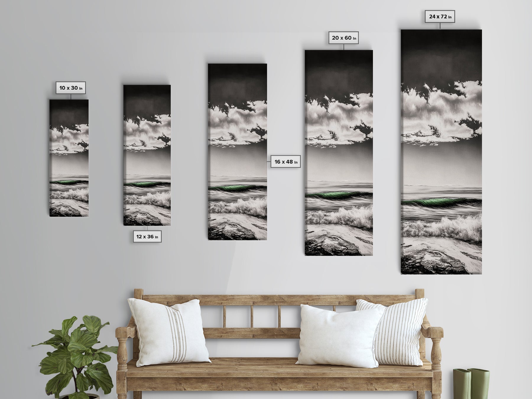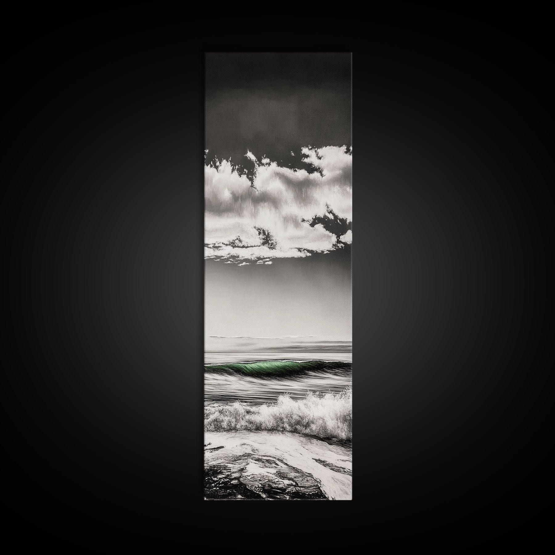 Coastal Waves, Black and White, Green Wave, Framed Canvas Print, Modern Beach Wall Art, Minimalist Ocean Decor, Living Room Art