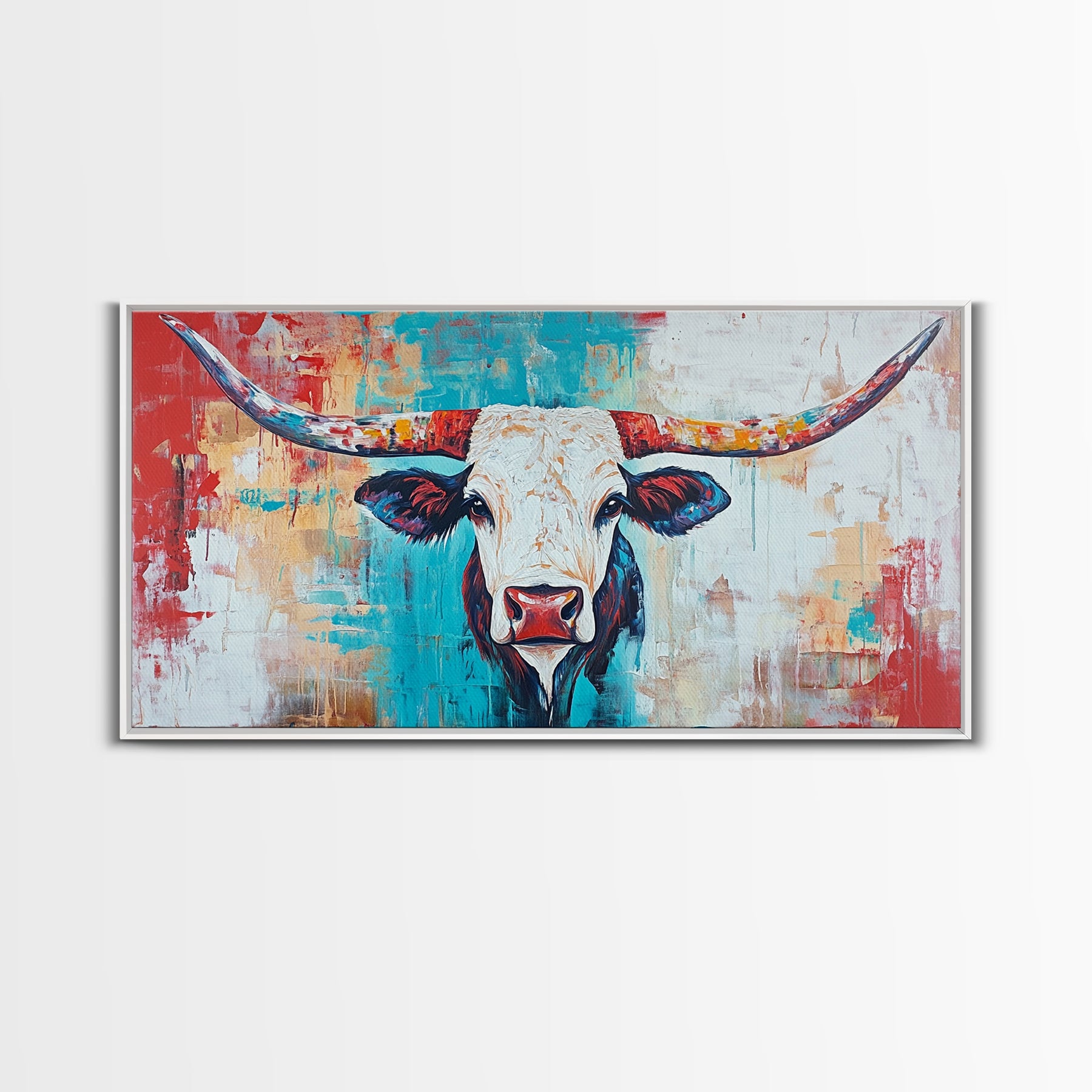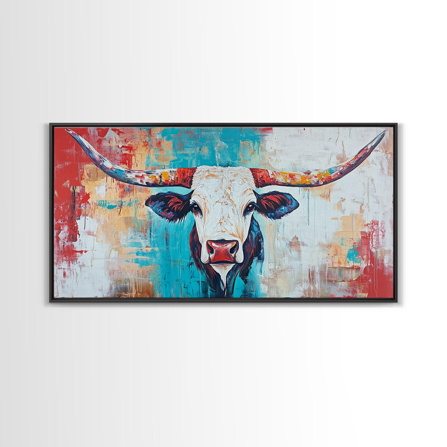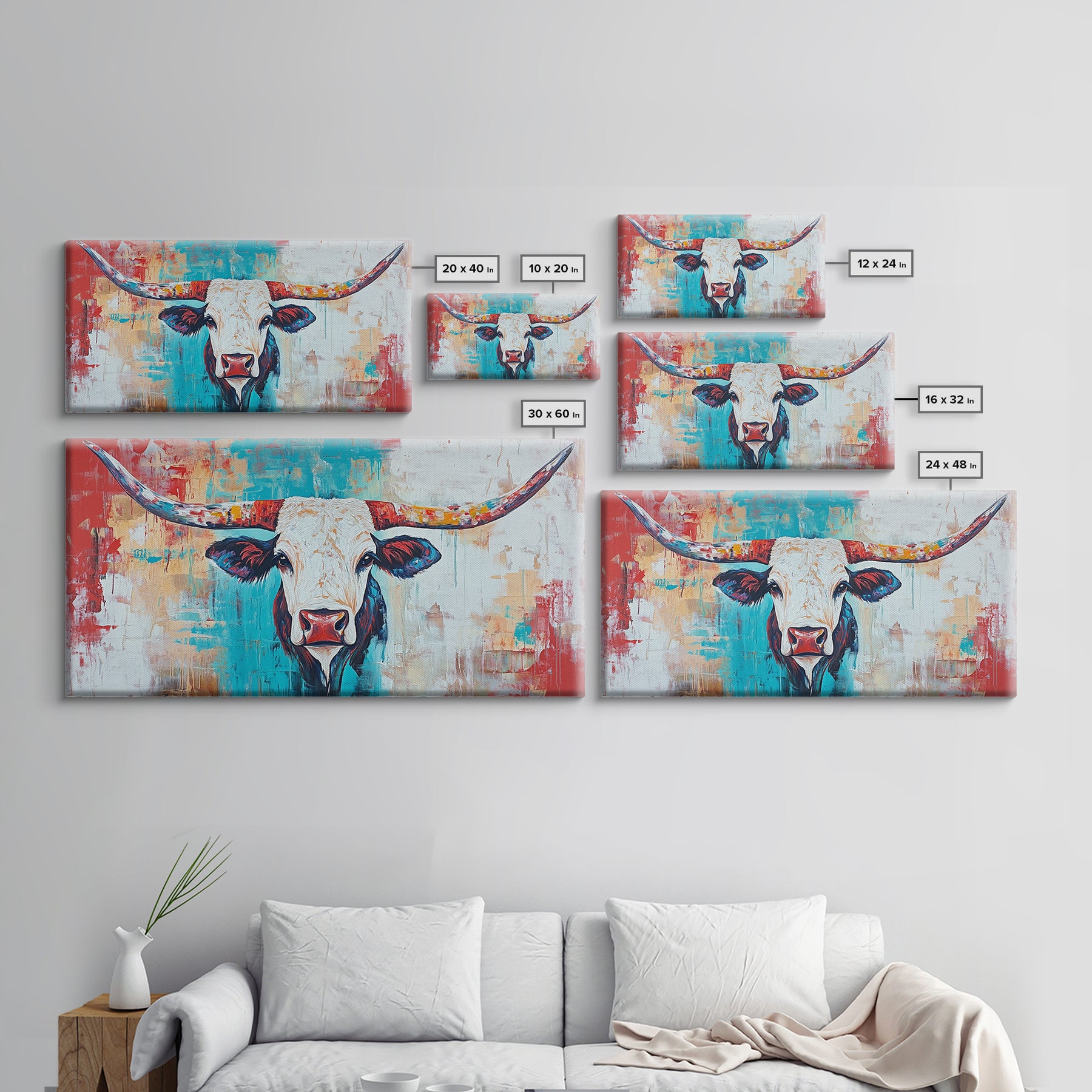 Colorful Longhorn Art, rustic wall art, farmhouse art, southwest wall art, bold animal painting, extra wide art, canvas print, wabi sabi art