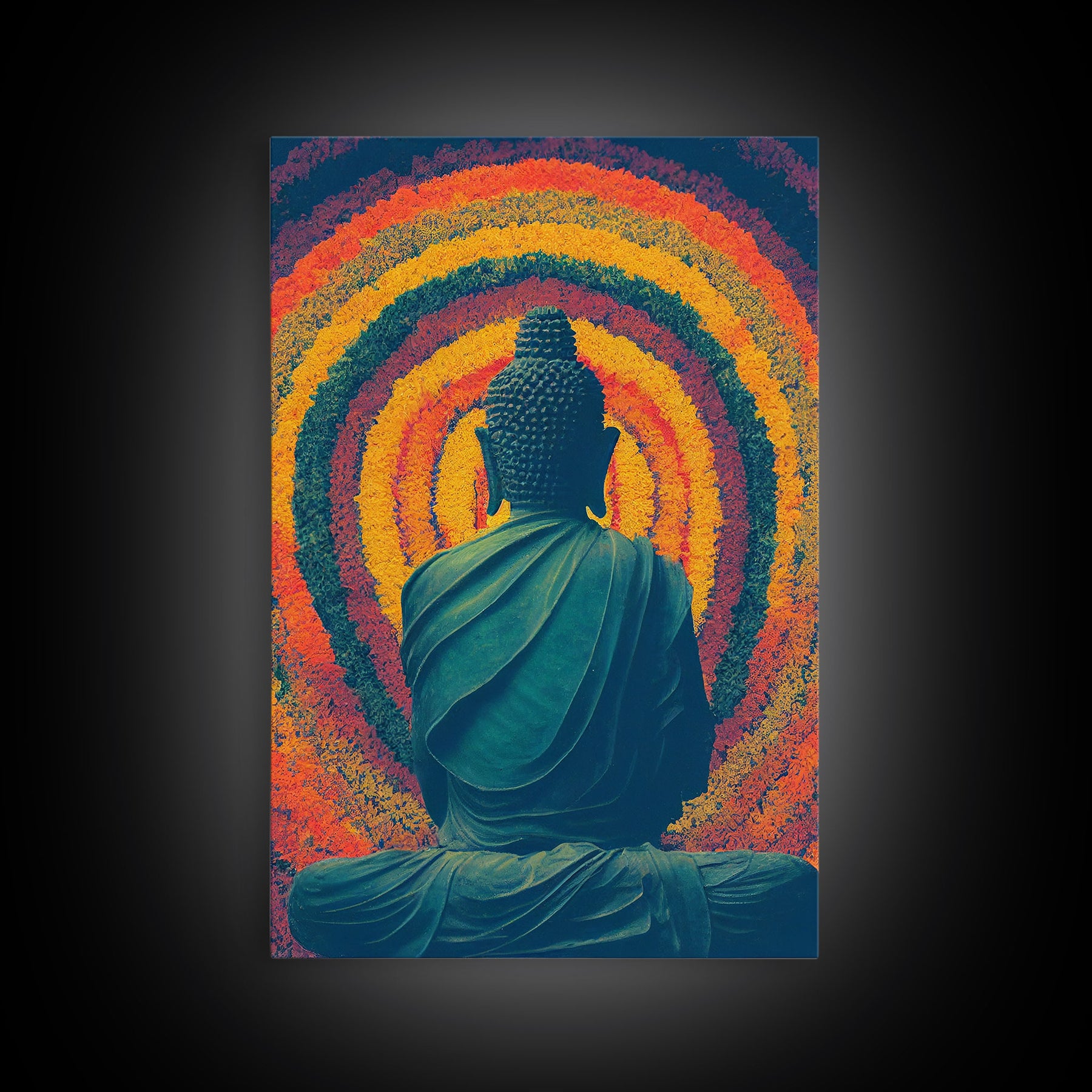 Colorful rainbow Buddha facing a ring of flowers, framed canvas print, yoga studio art