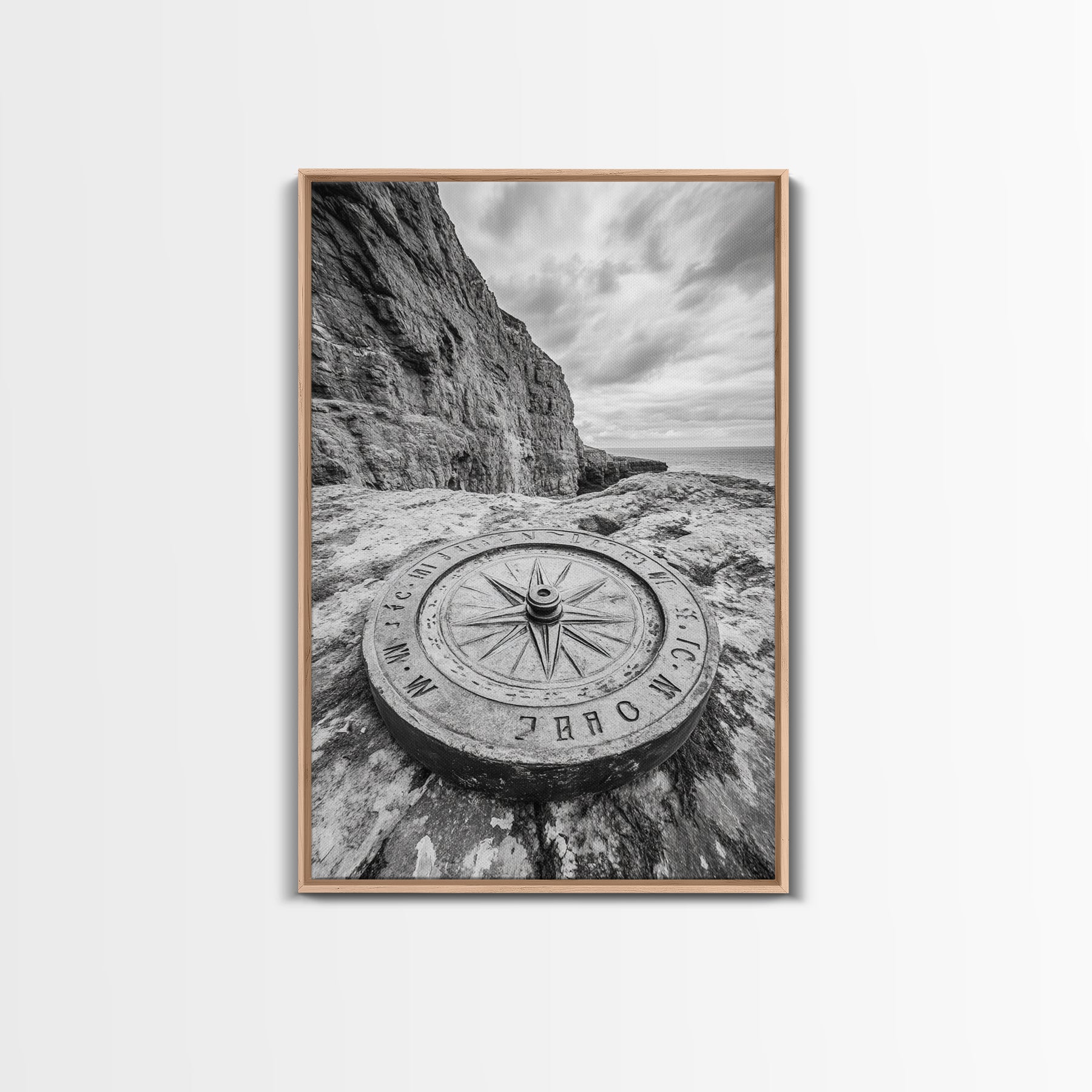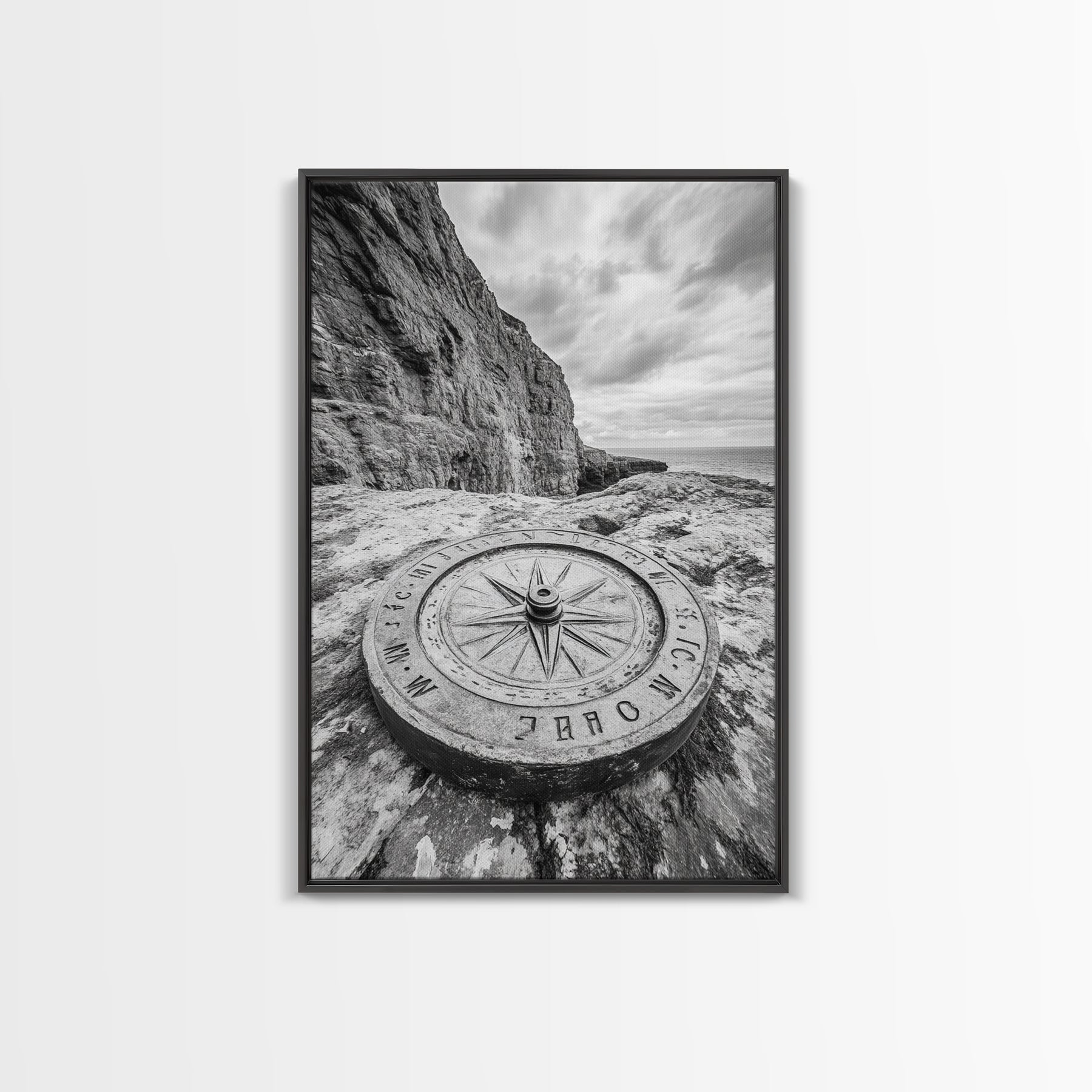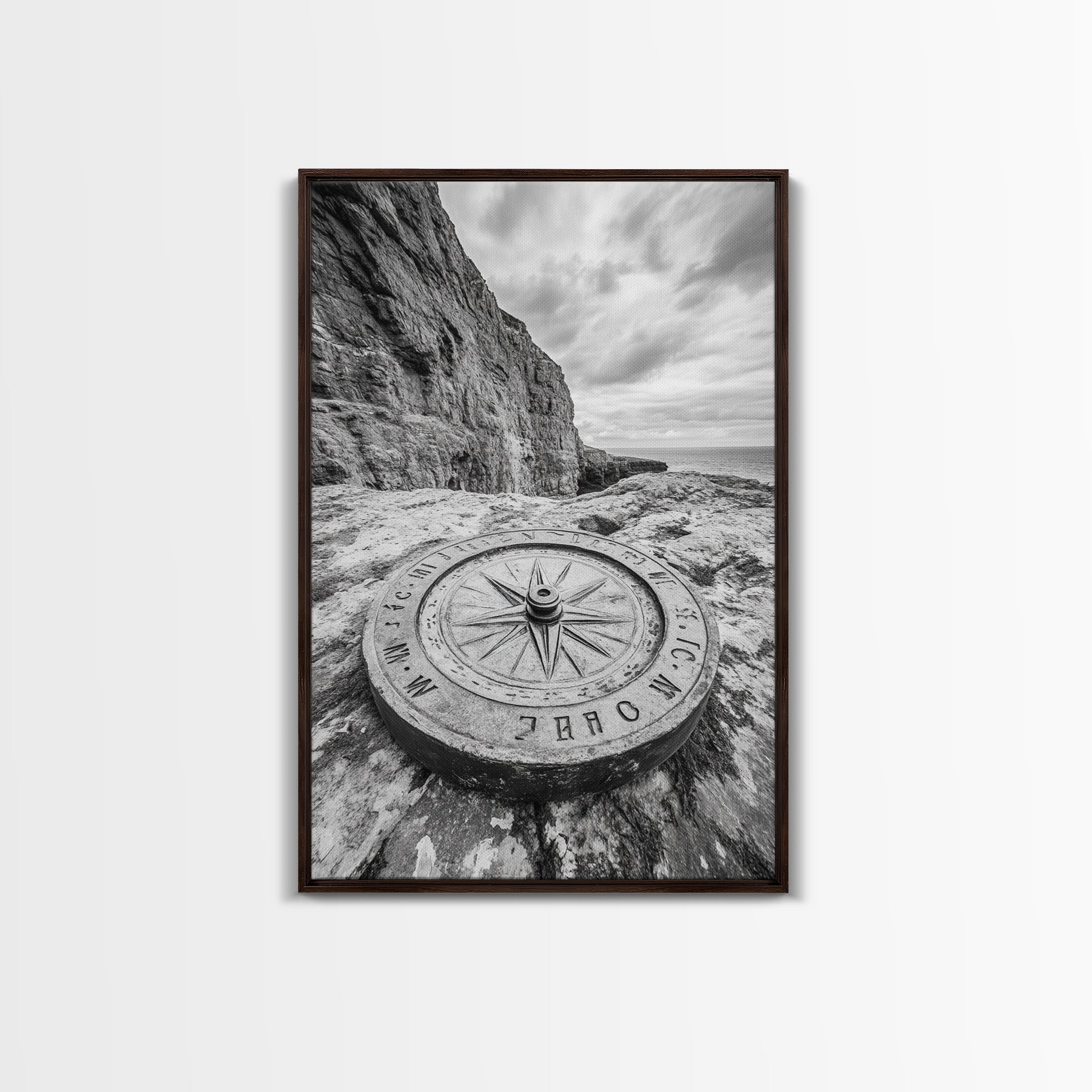 Compass On Cliff, Adventure Travel Art, Nautical Wall Decor, Framed Canvas Print, Rustic Office Art, Nature Explorer Gift Idea