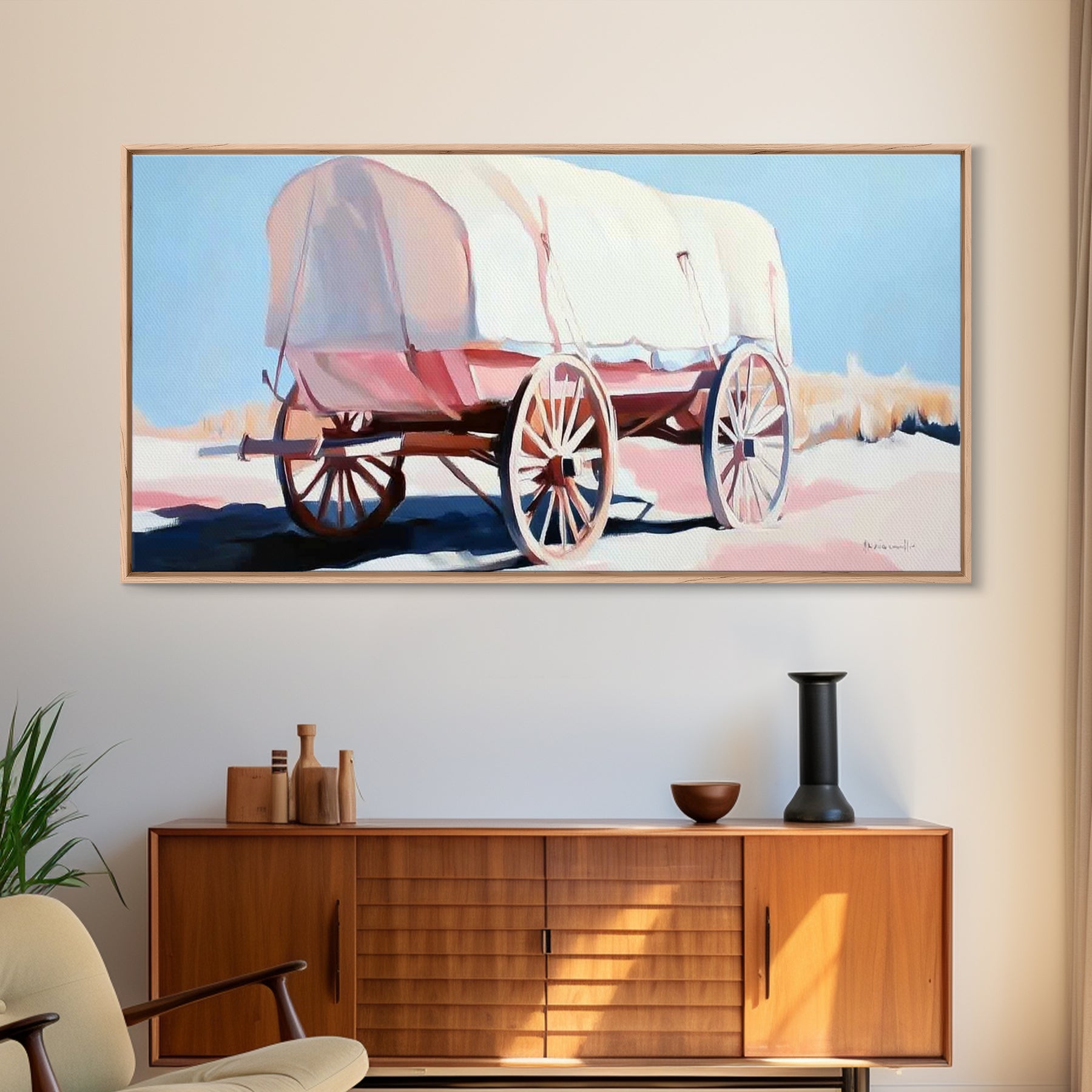 Covered Wagon, Vintage Western Art, Rustic Wall Art, Farmhouse Art, Coastal Cowgirl Wall Art, Light Pink Wall Art, Framed Canvas Print, Extra Wide Art