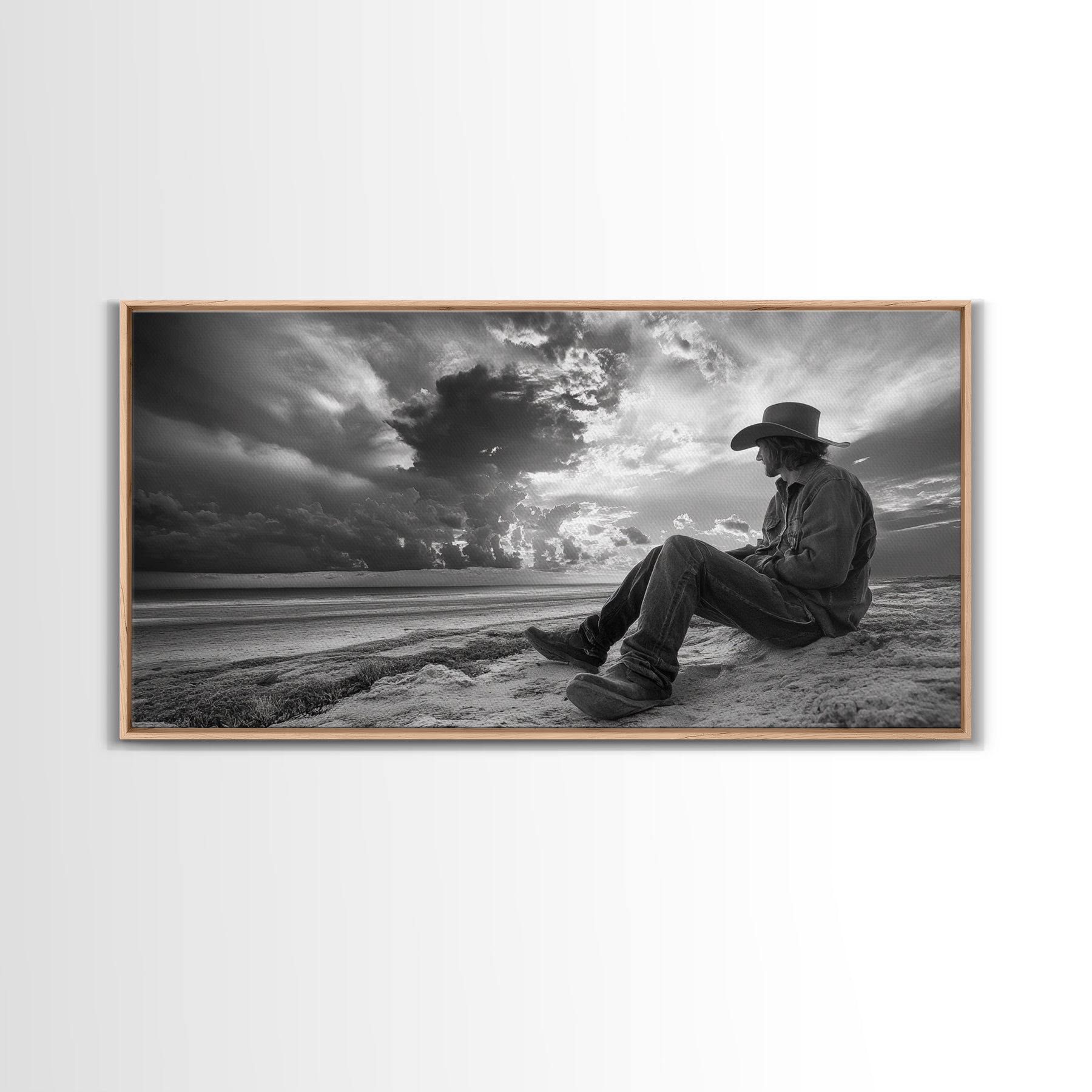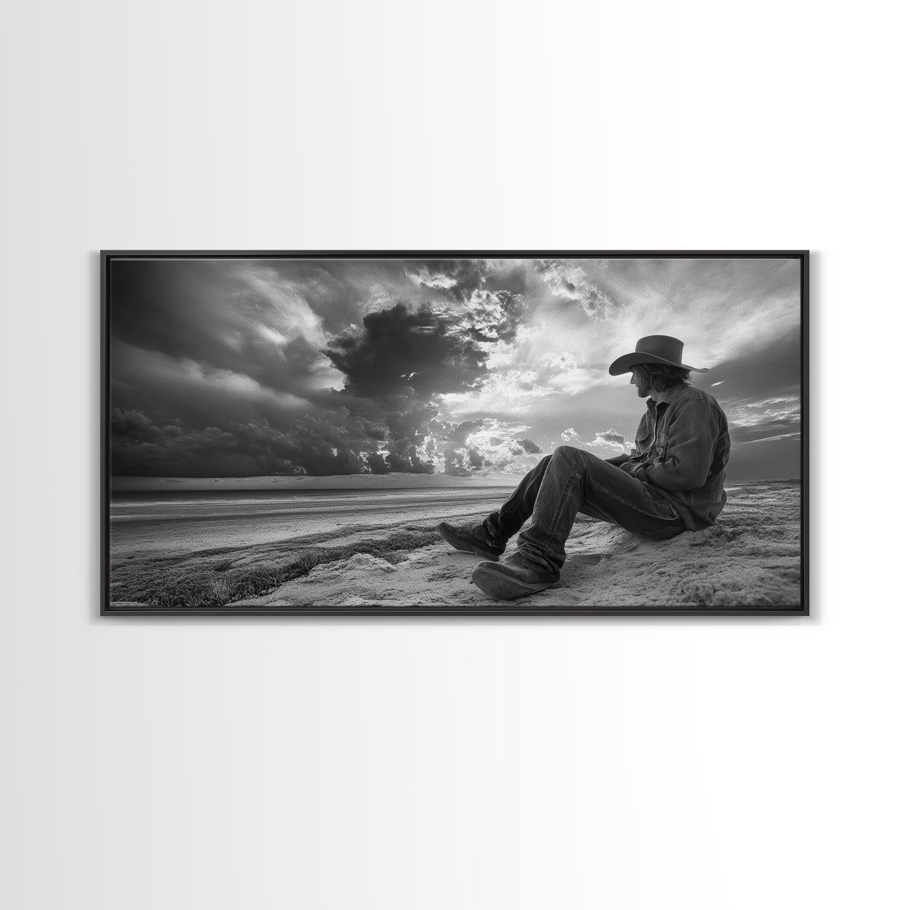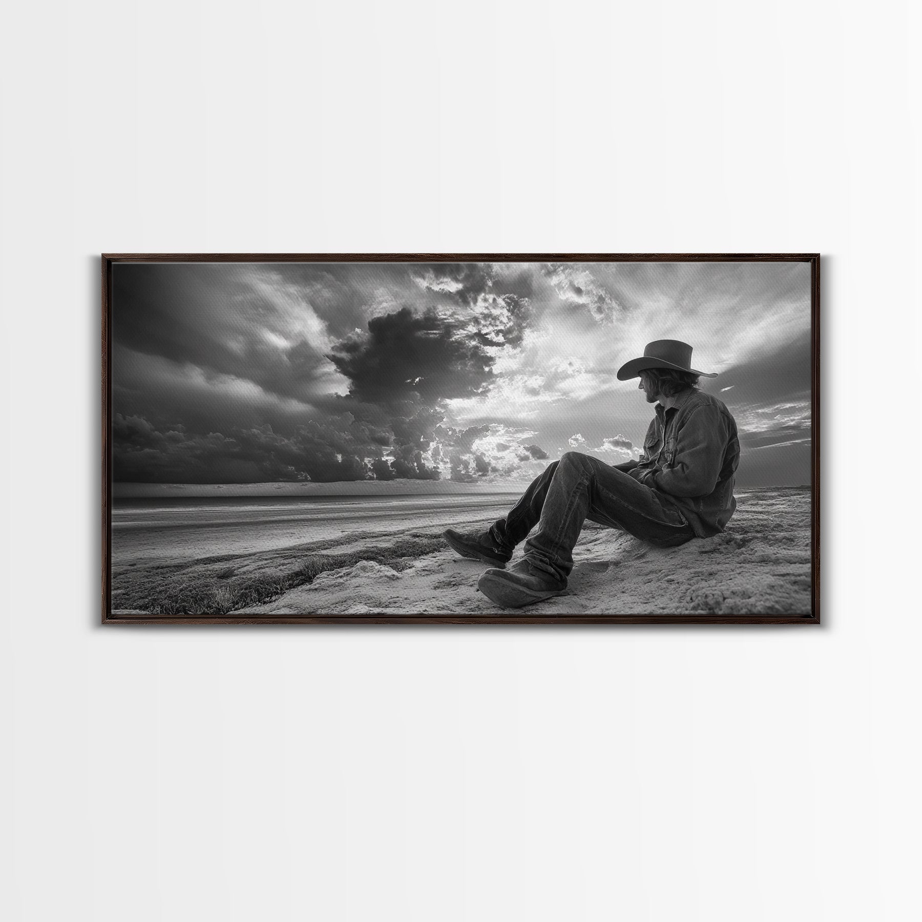 Cowboy on Beach, Moody Art, Western Wall Art, Dramatic Sky Print, Rustic Decor, Coastal Cowgirl Aesthetic, Framed Canvas Print, Scenic View