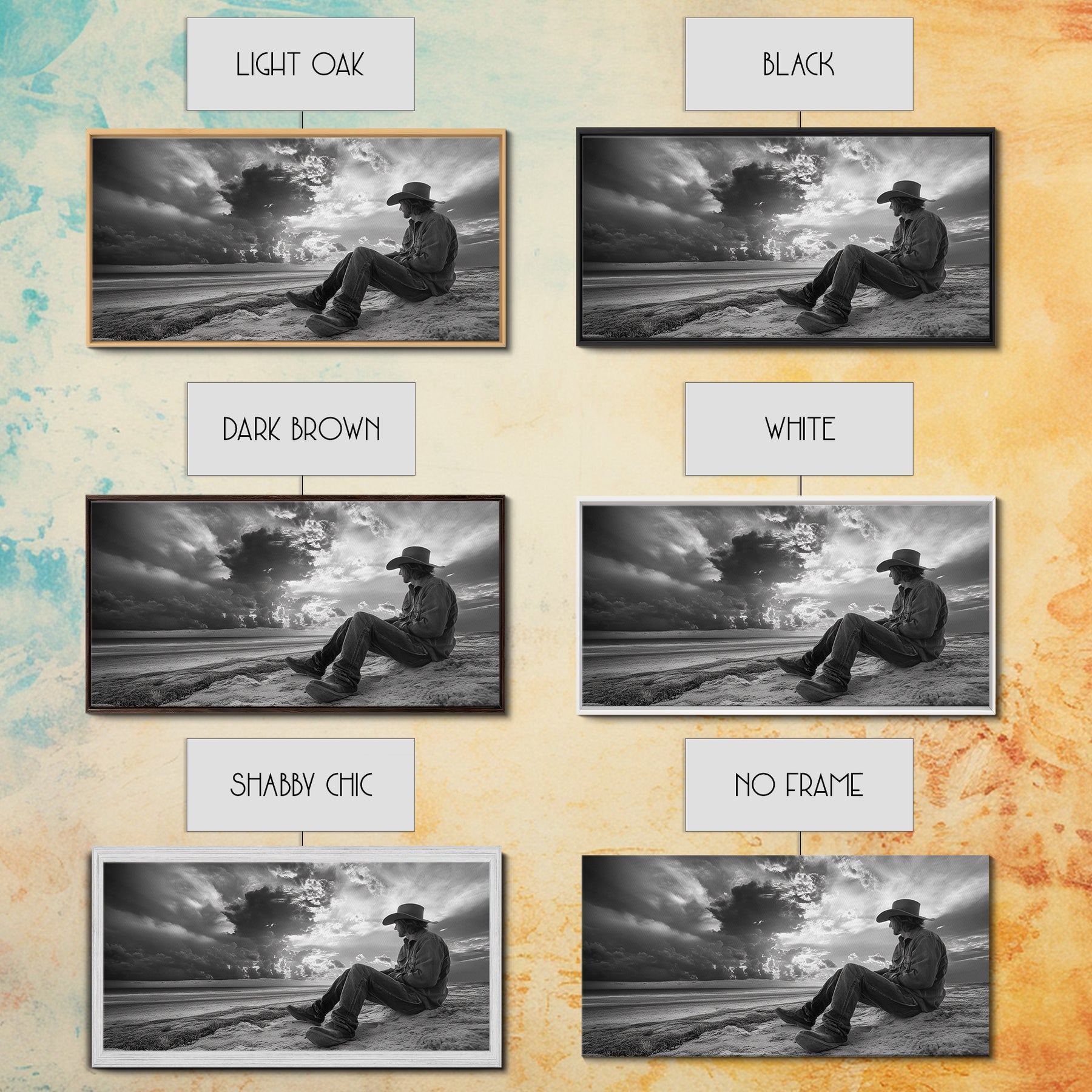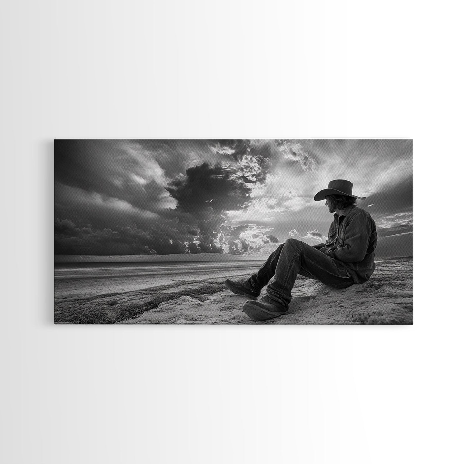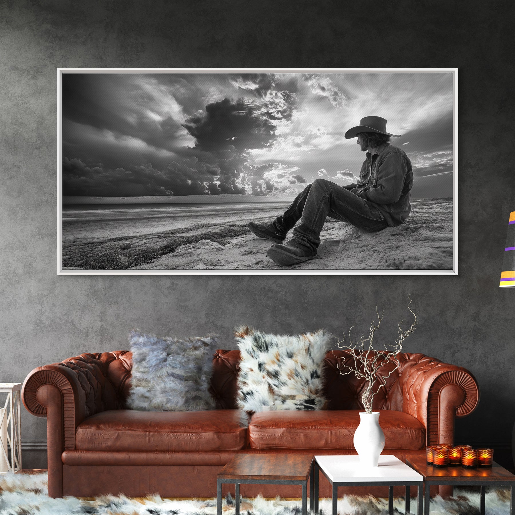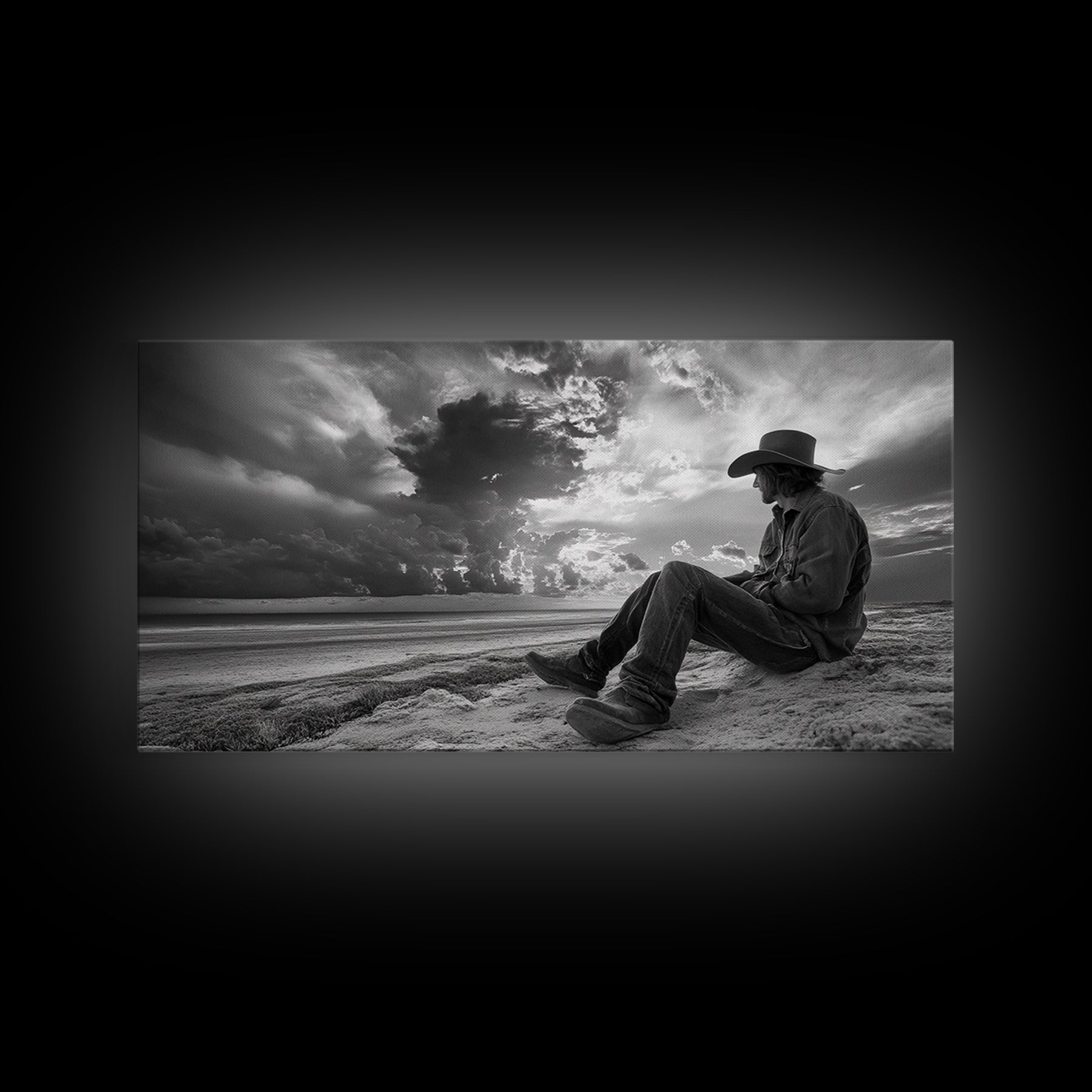 Cowboy on Beach, Moody Art, Western Wall Art, Dramatic Sky Print, Rustic Decor, Coastal Cowgirl Aesthetic, Framed Canvas Print, Scenic View