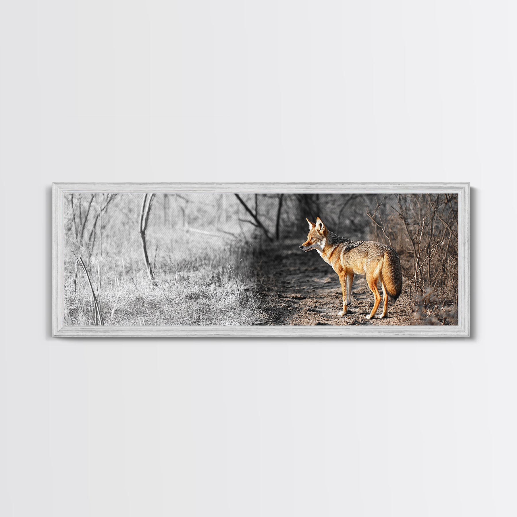 Coyote in Forest, Wildlife Wall Art, Rustic Decor, Nature Art, Moody Art, Extra Wide Art, Panoramic Art, Framed Canvas Print