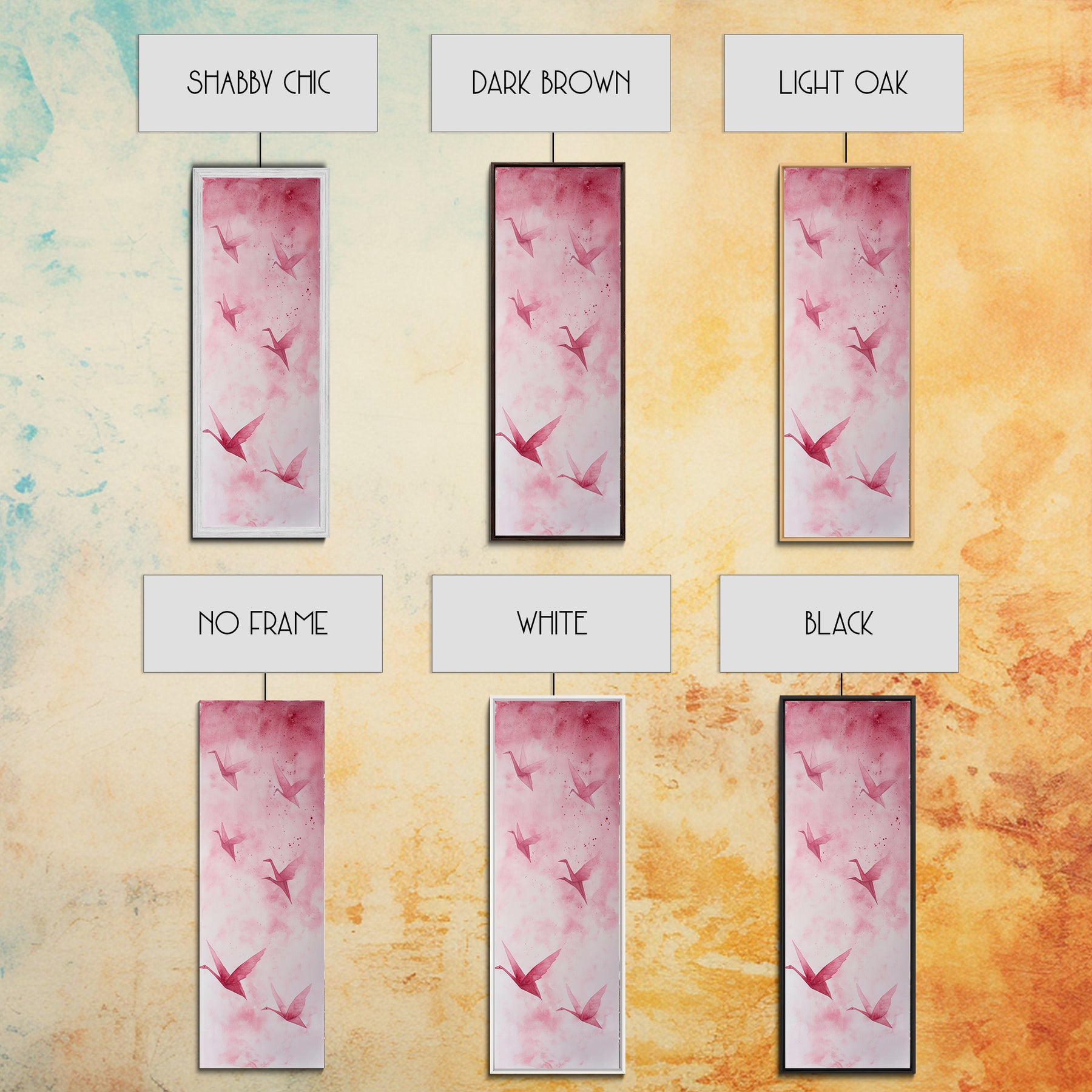 Crane Flight Canvas Print, ethereal origami bird painting in pink abstract hues, tall narrow wall art with zen minimalist aesthetic.
