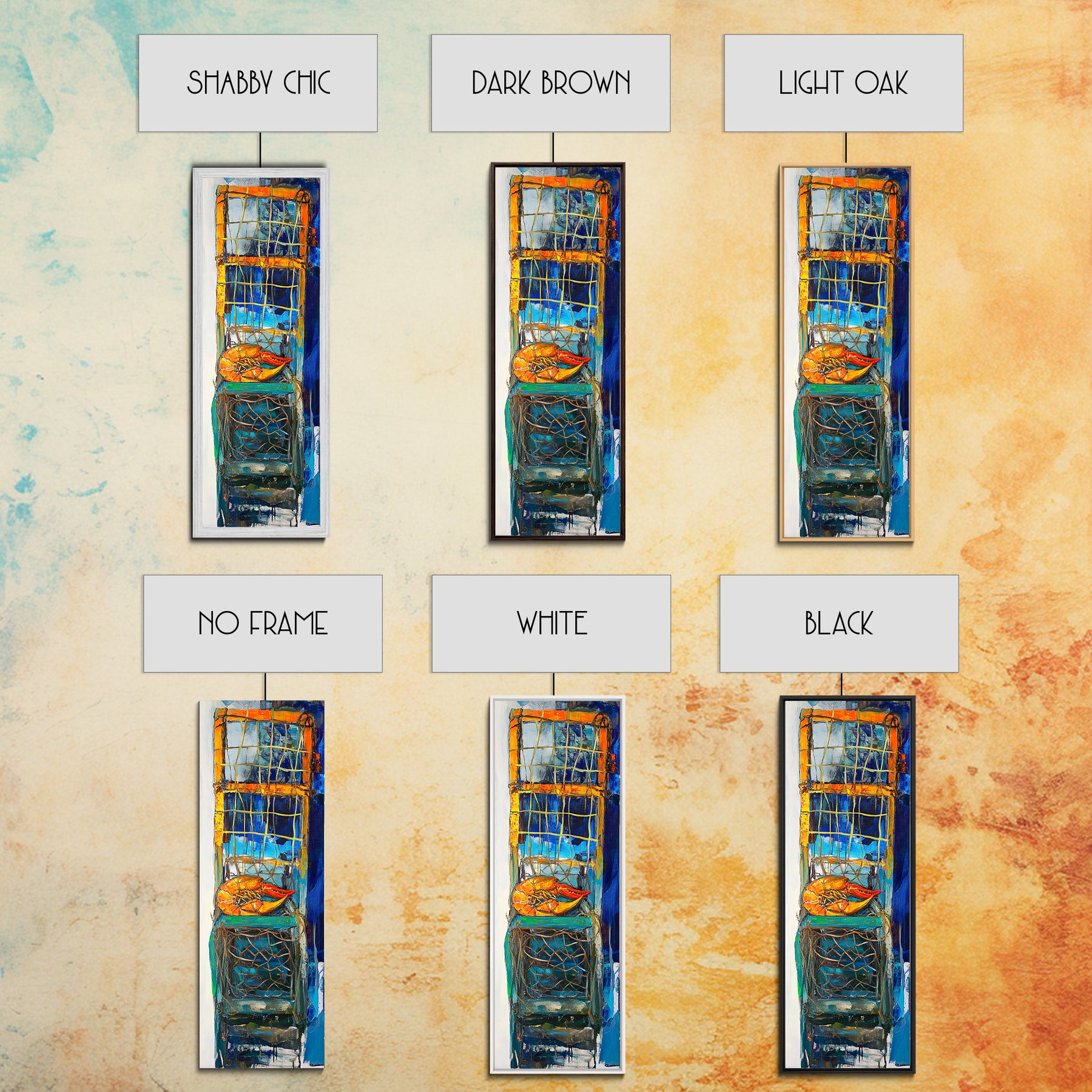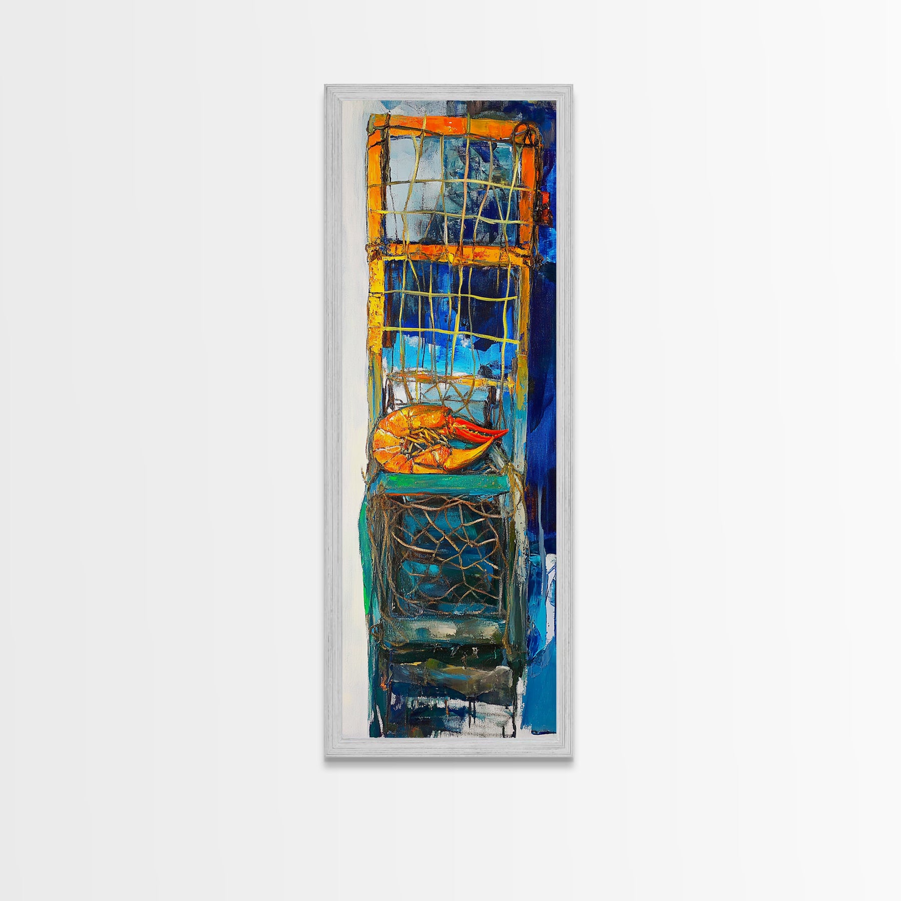 Crayfish painting, nautical wall art, rustic art, kitchen decor, fisherman painting, blue and orange, framed canvas print, gift idea