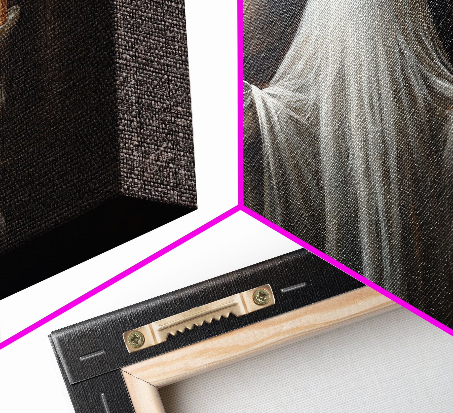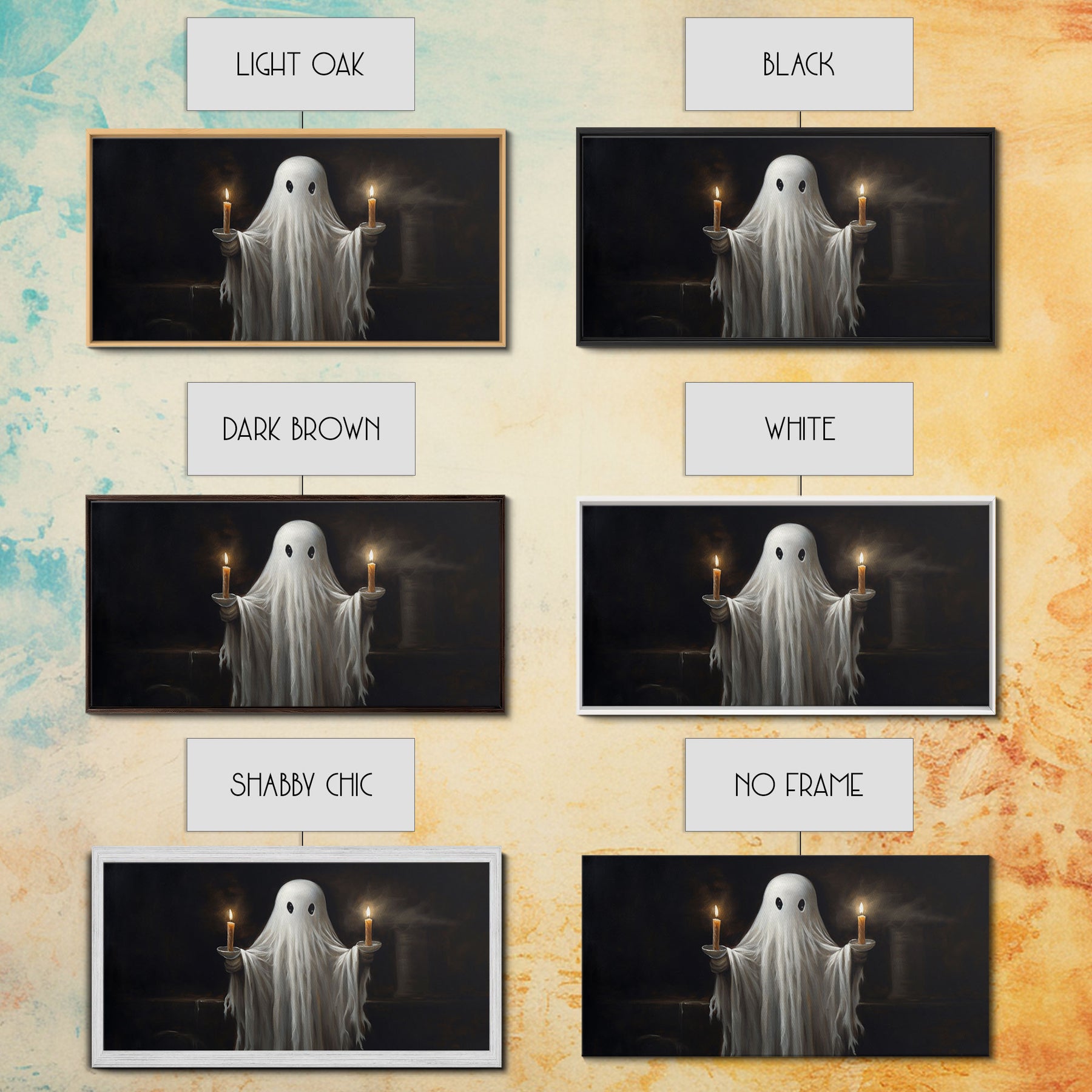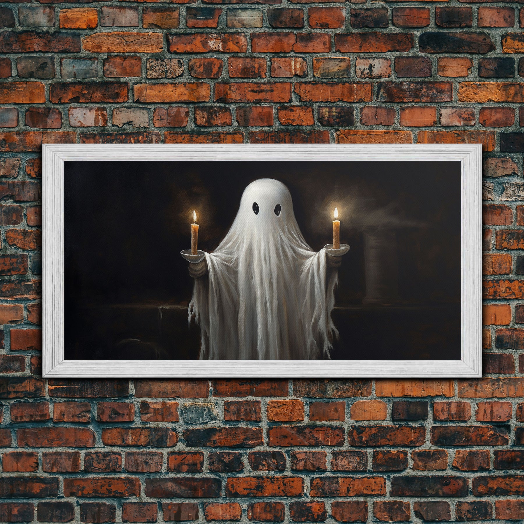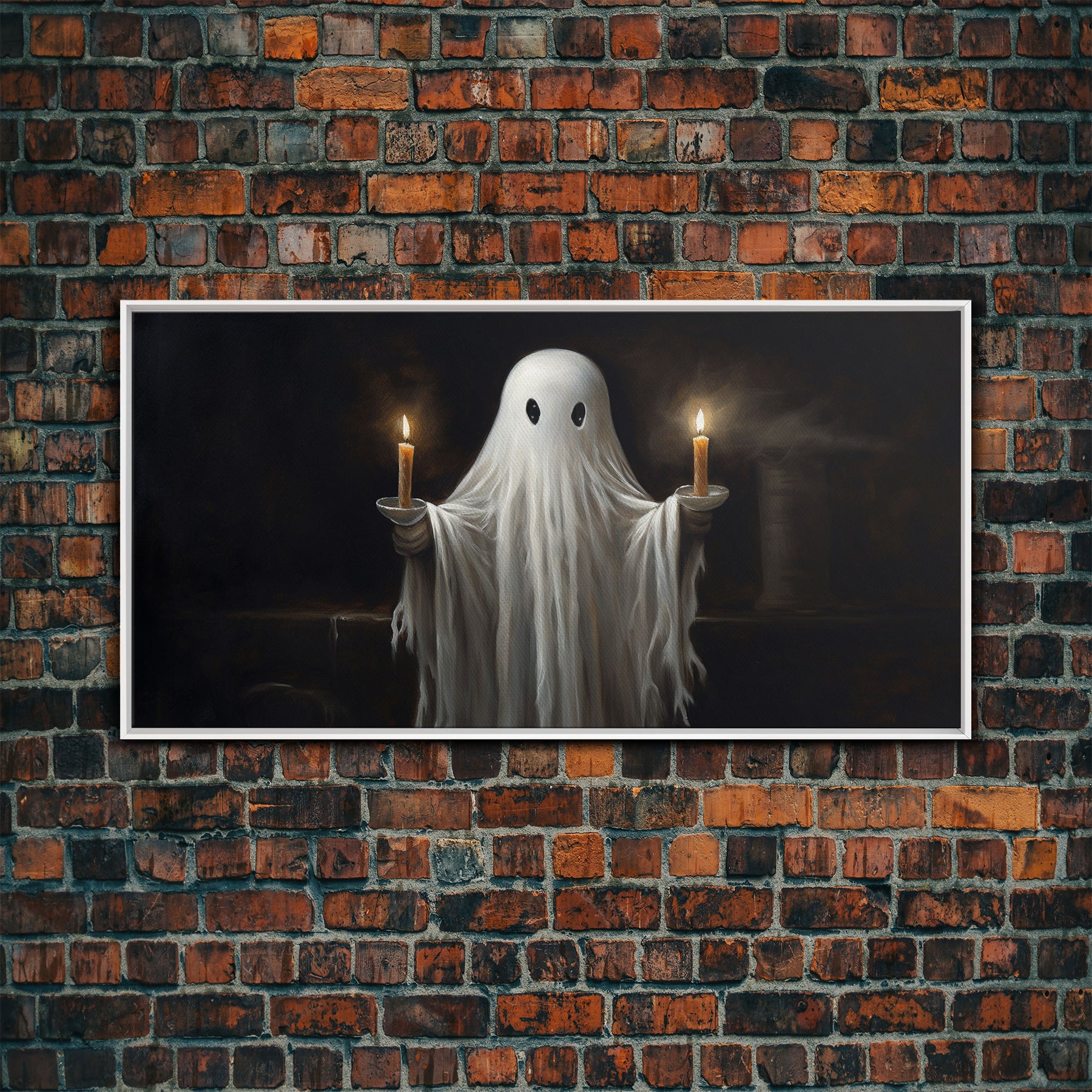 Cute Ghost Holding Candles, Framed Canvas Print, Dark Academia Wall Art, Victorian Oil Painting Style Halloween Wall Art, Ghost Print