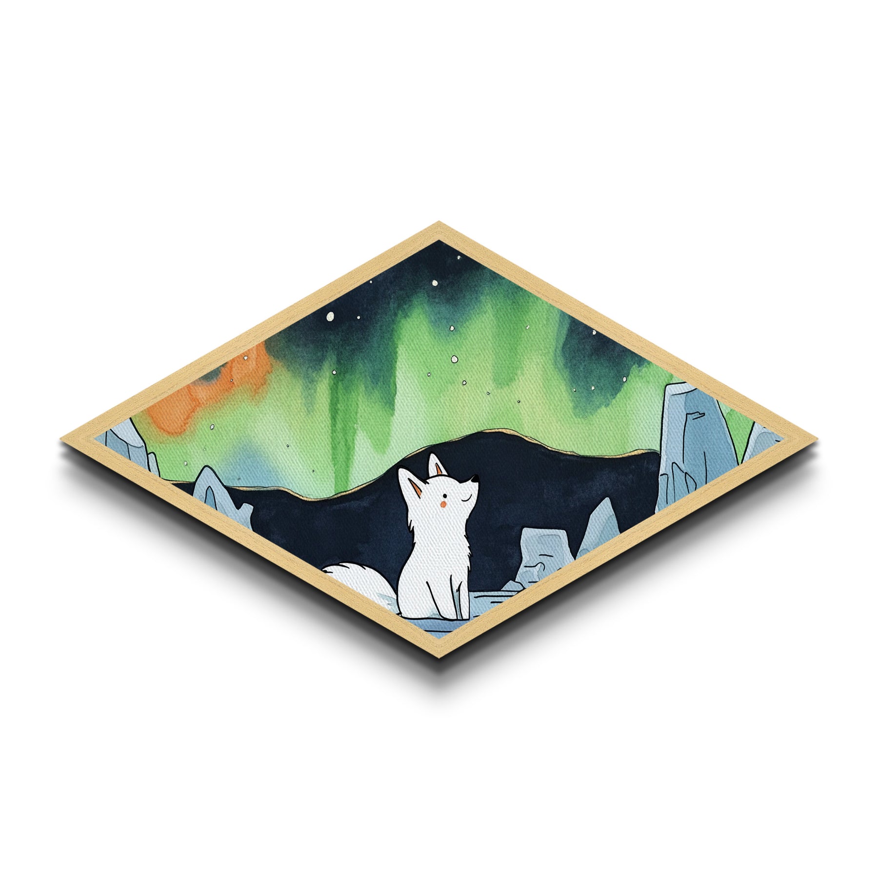 Cute Wolf Cub Under The Northern Lights, Diamond Shaped Canvas Texture Art Print, Coastal Boho Decor