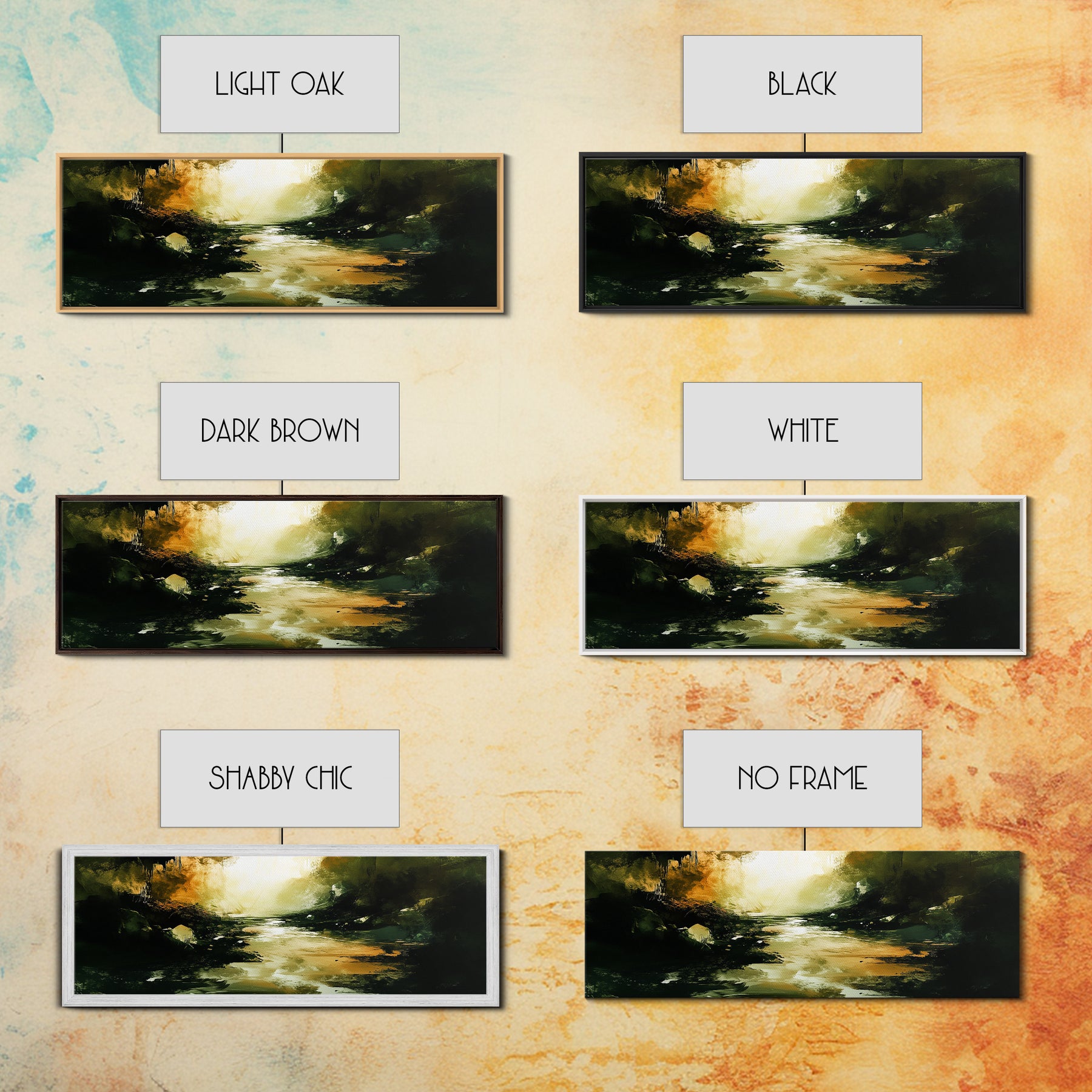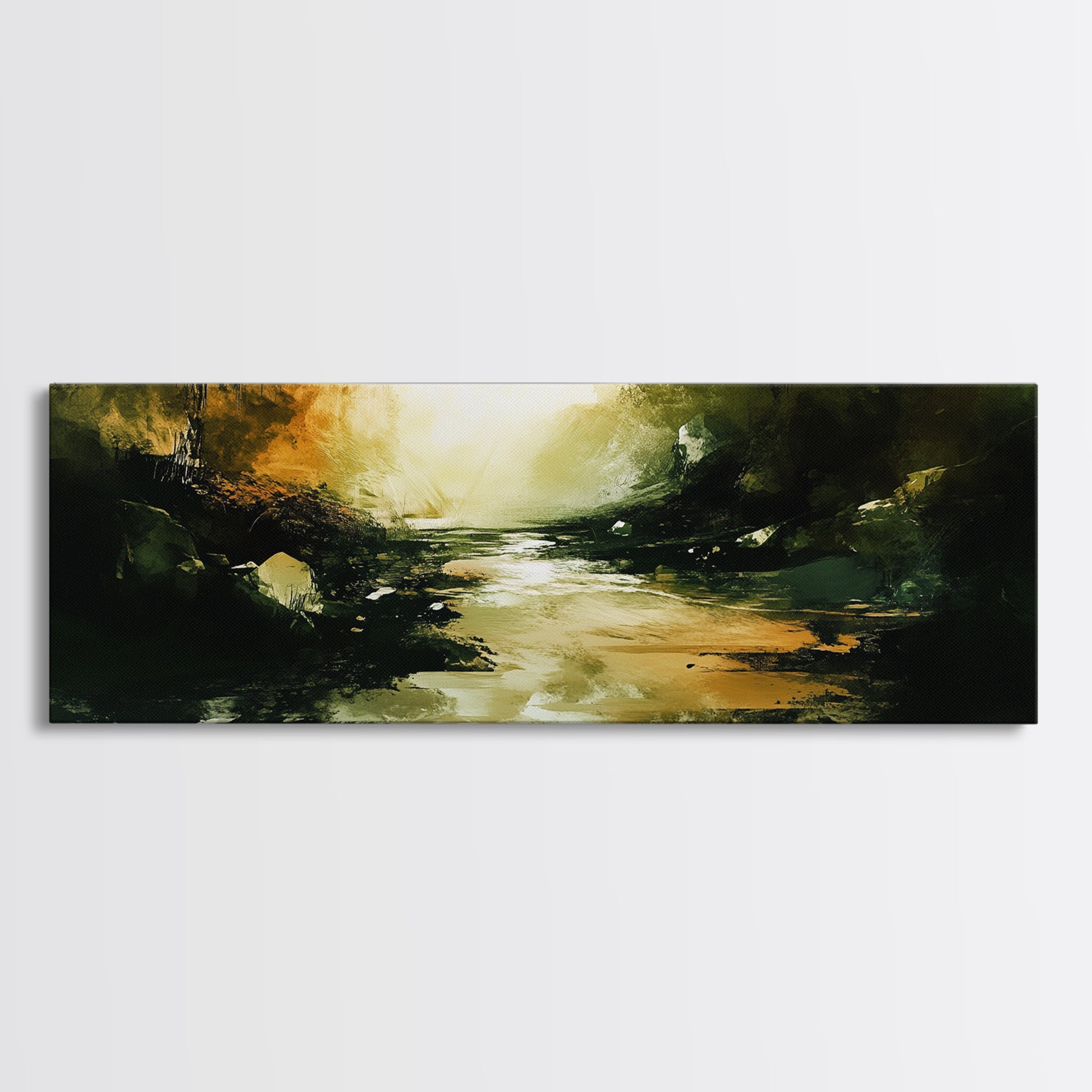 Dark Fantasy River Painting, Moody Abstract Landscape, Green and Gold Mystical Wall Art, Mysterious Hallway Decor, Framed Canvas Print
