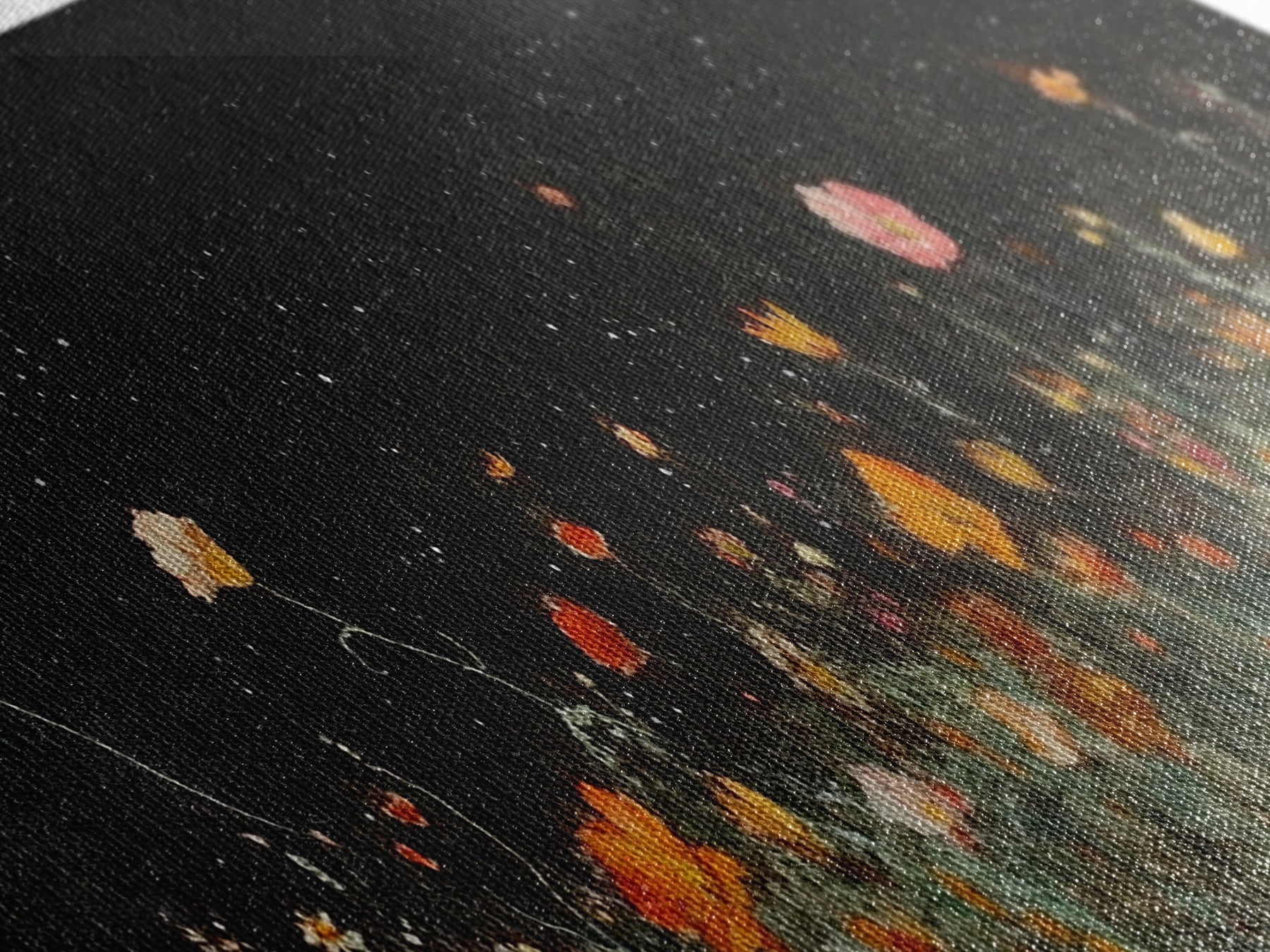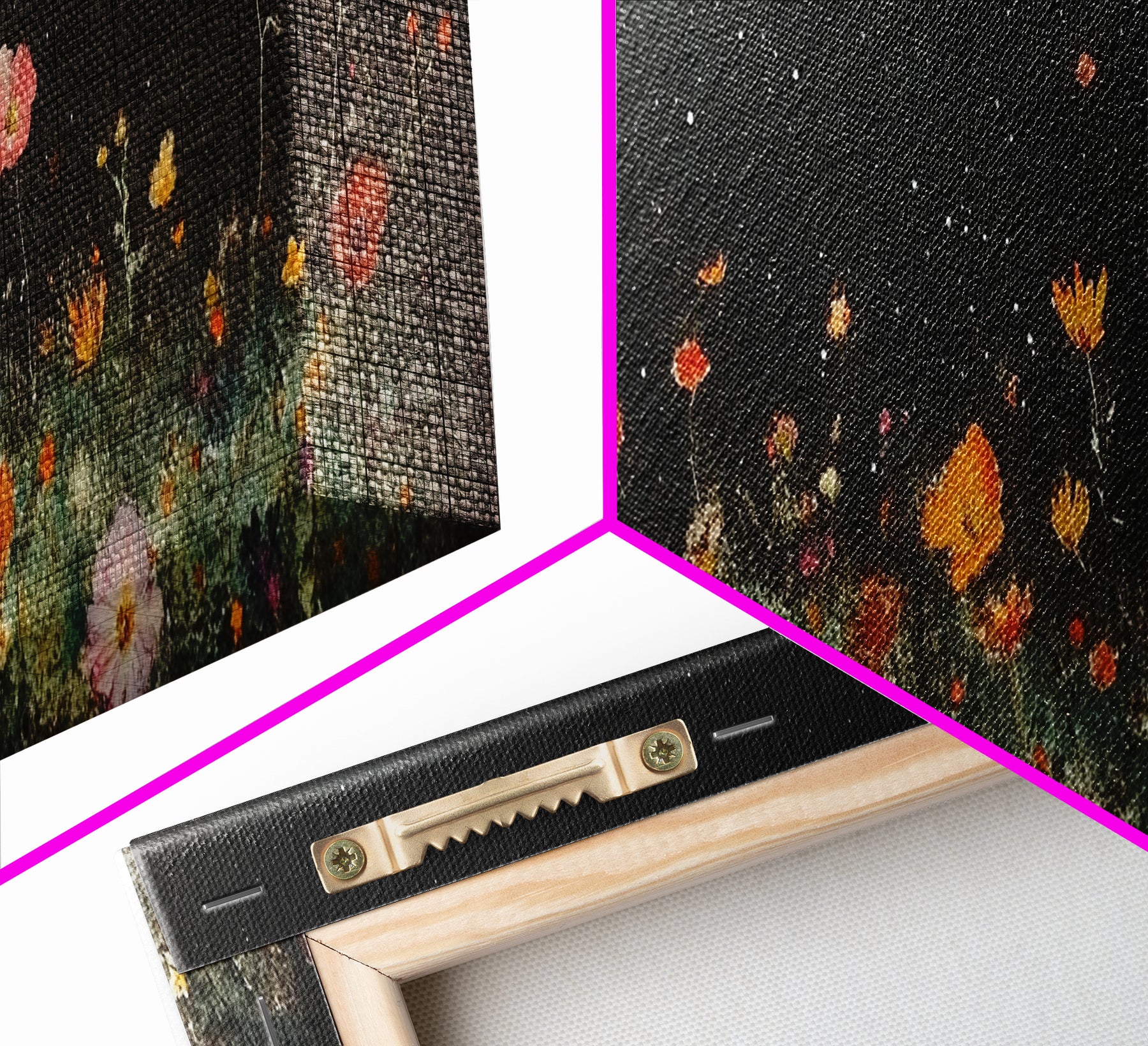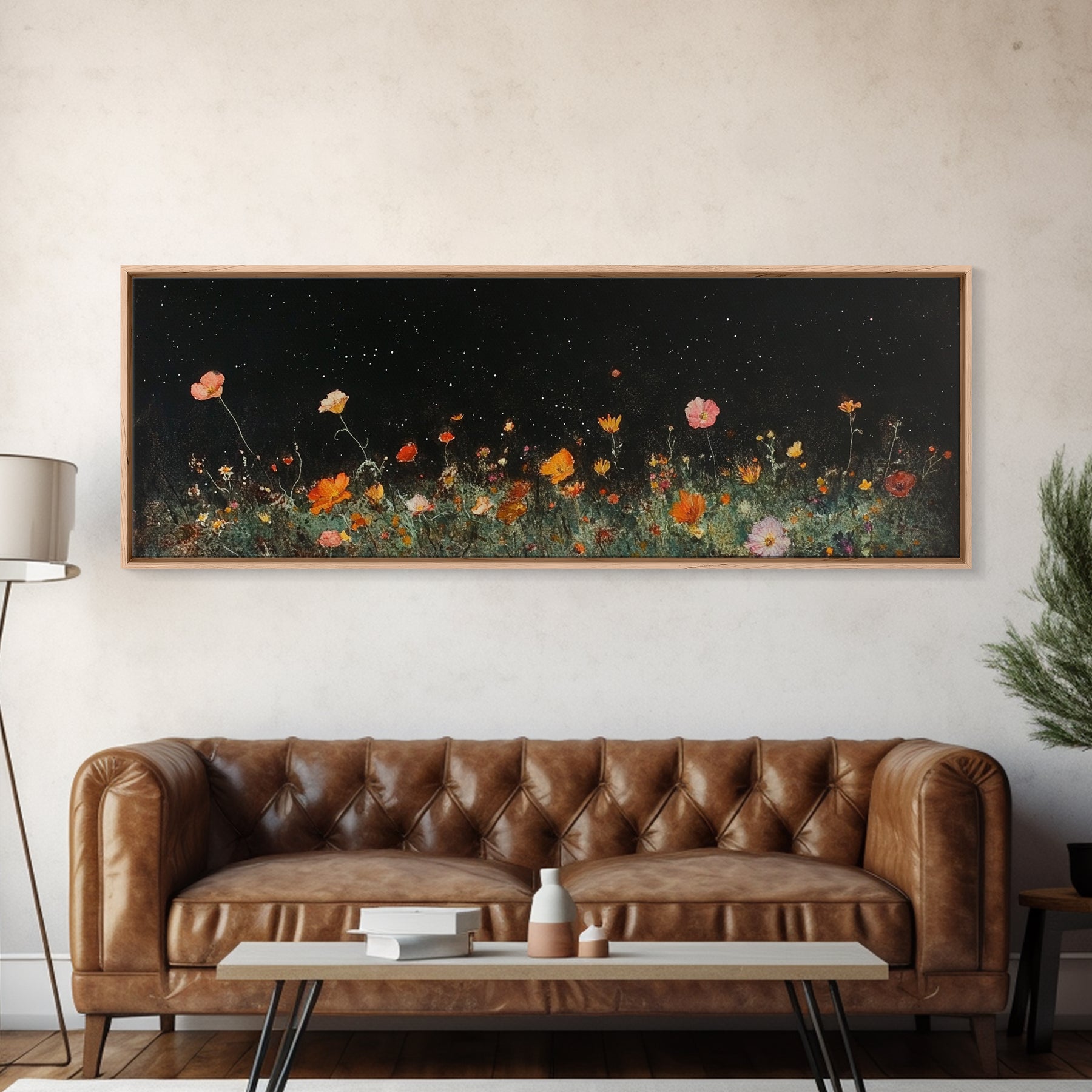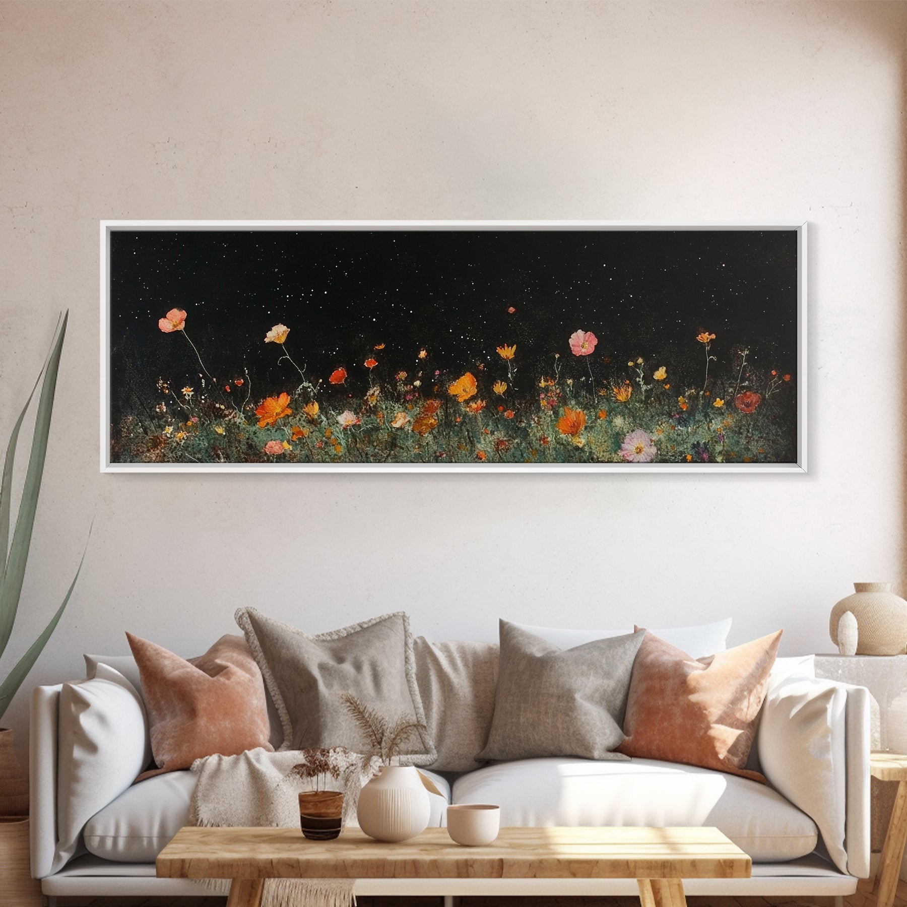 Dark & Moody Wild Flowers Under a Full Moon, Framed Canvas Print, Panoramic Extra Wide Wall Art, Oversized Home Decor, Modern Farmhouse Art