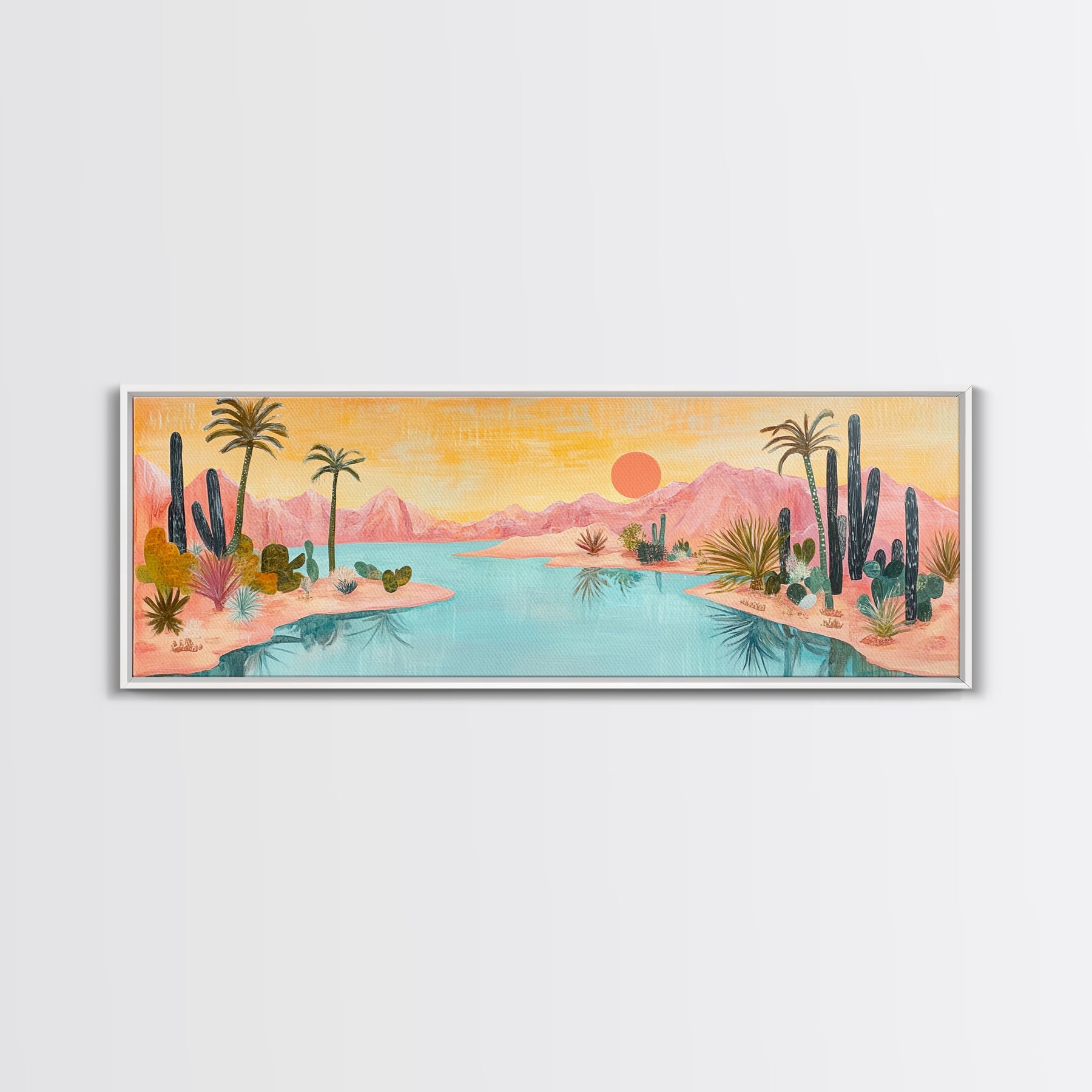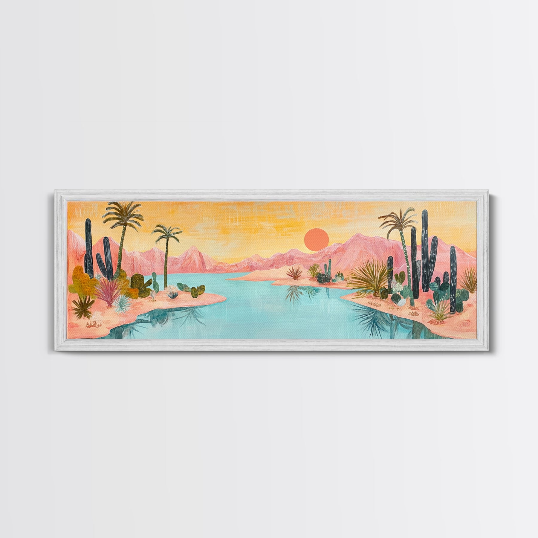 Desert Oasis Landscape Wall Art, Cactus and Palm Trees Painting, Boho Sunset Artwork, Southwest Home Decor, Warm Pink Art