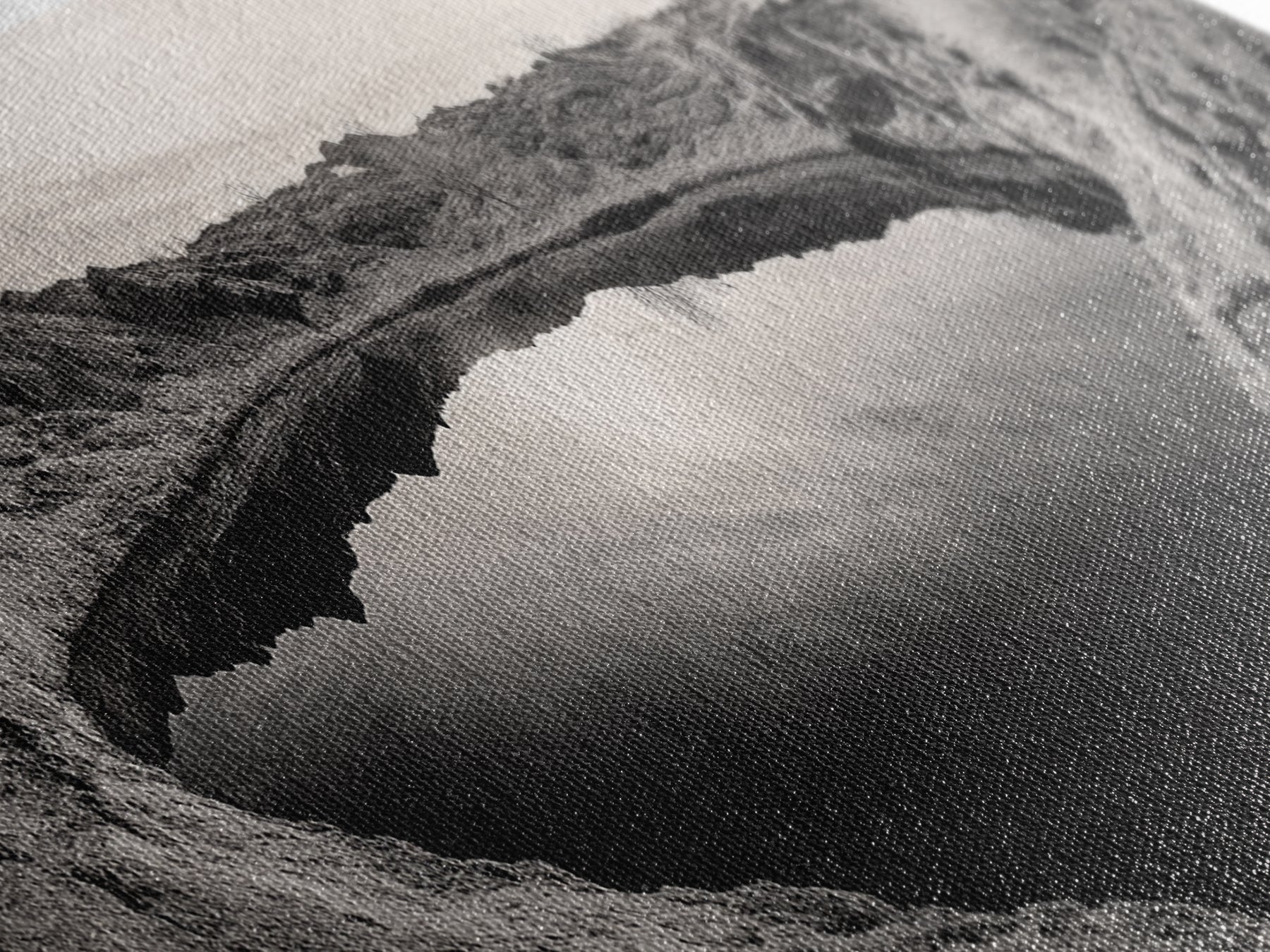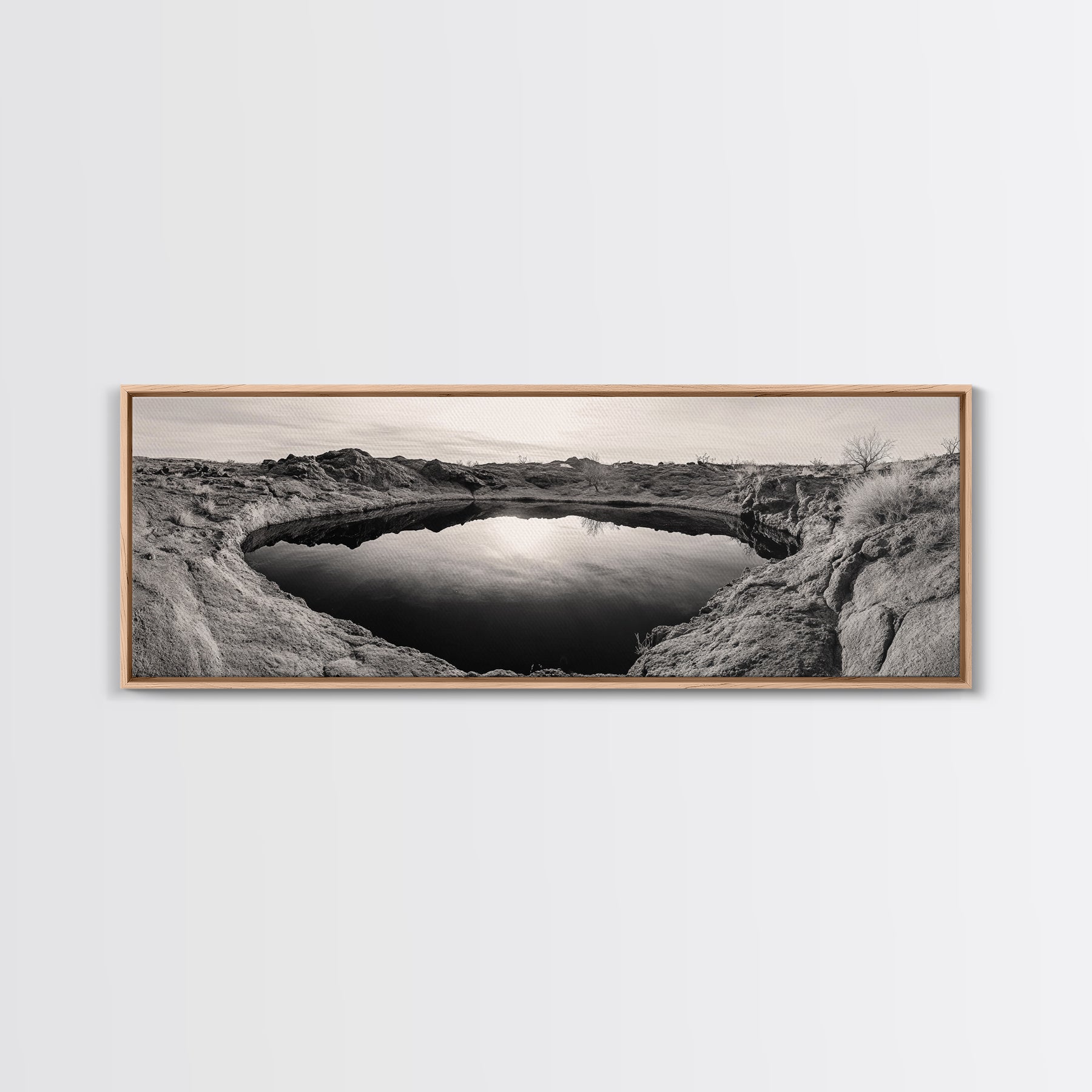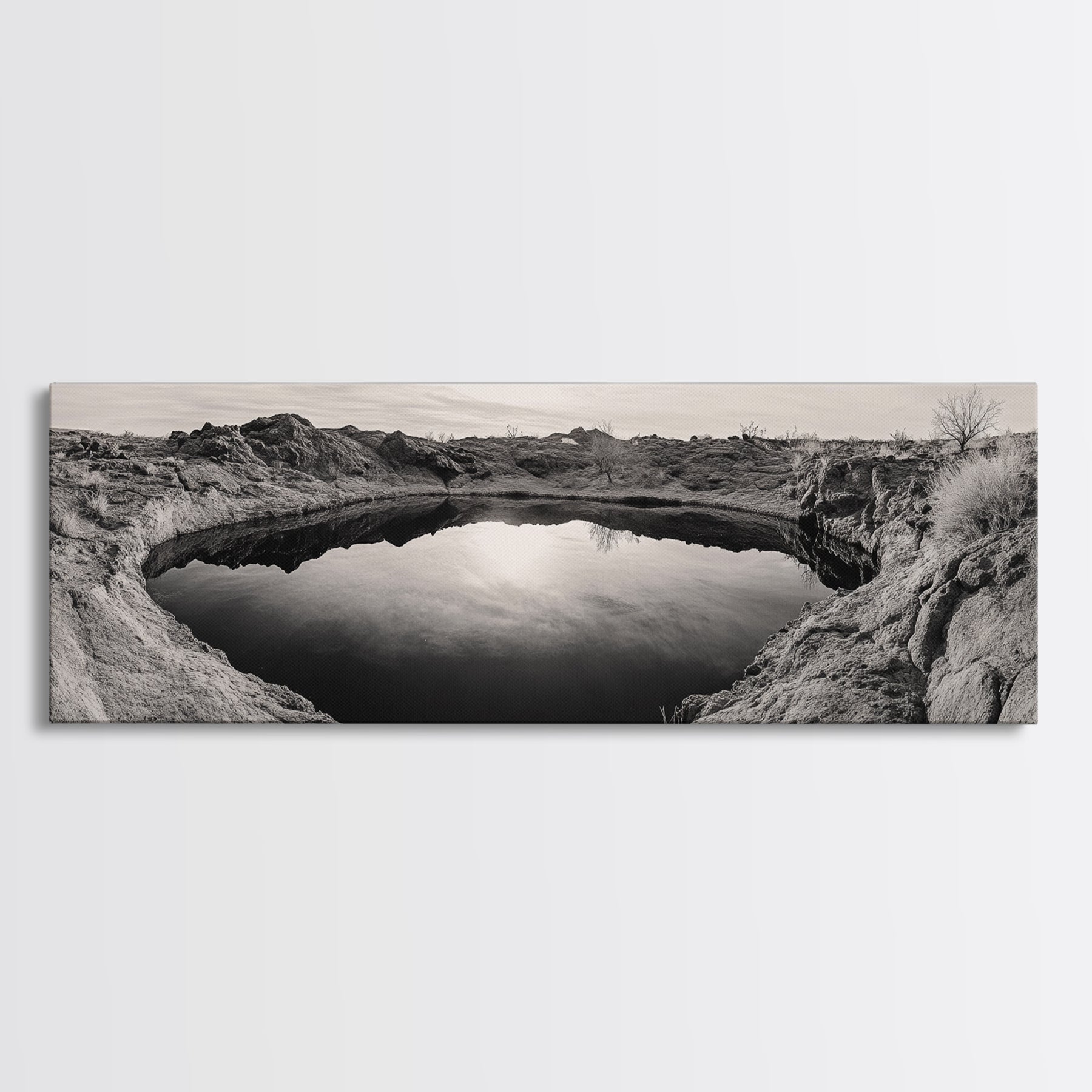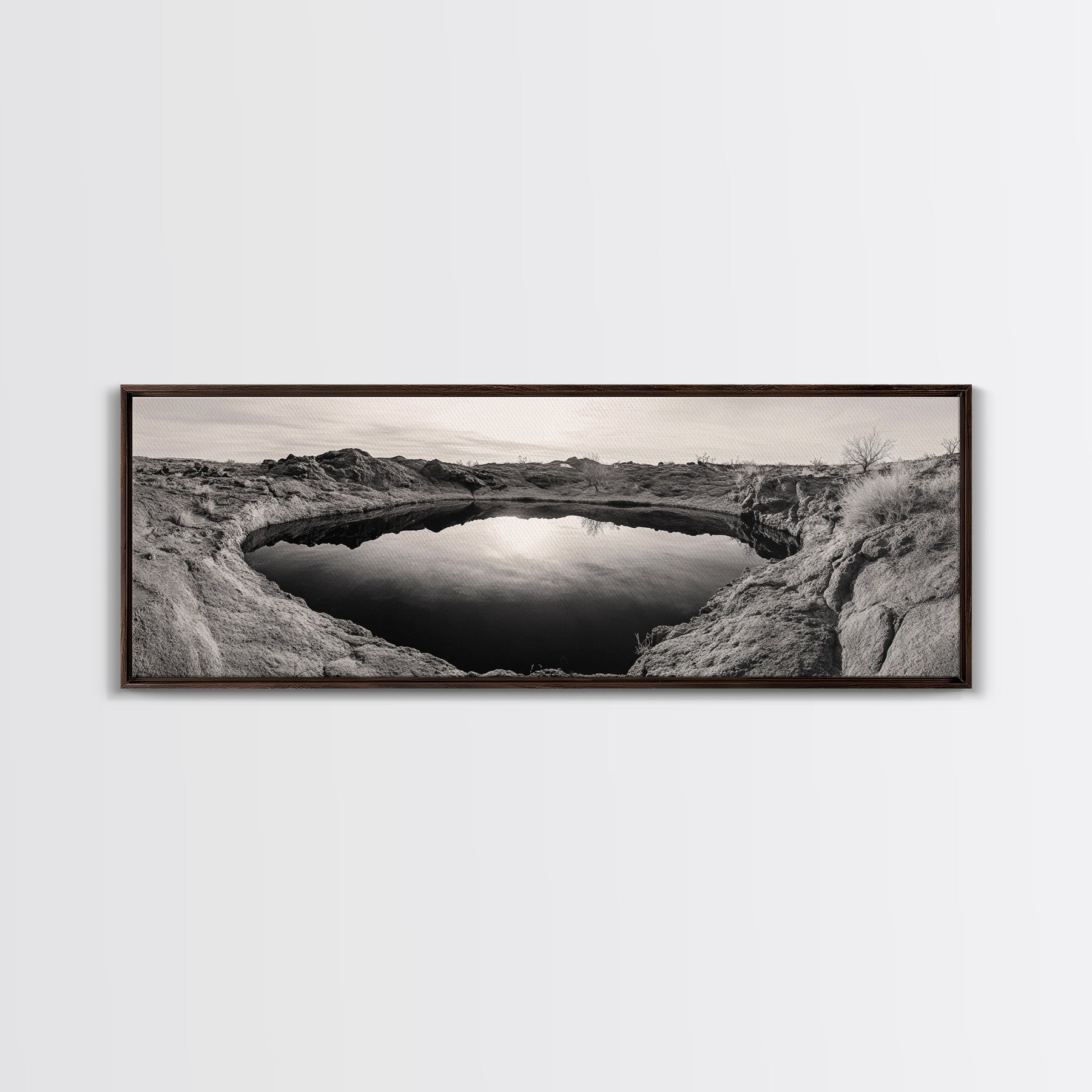 Desert Pool, Reflected Sky, Rugged Terrain, Monochrome Minimalism, Framed Canvas Print, Earthy Wall Art, Neutral Bedroom Decor