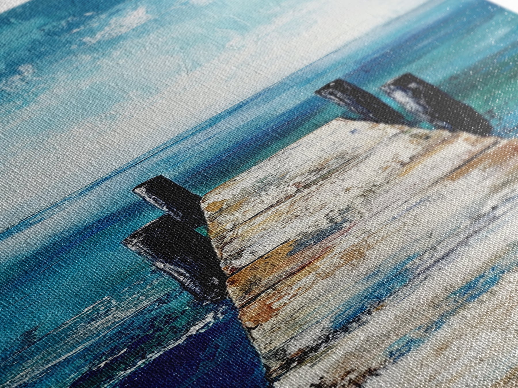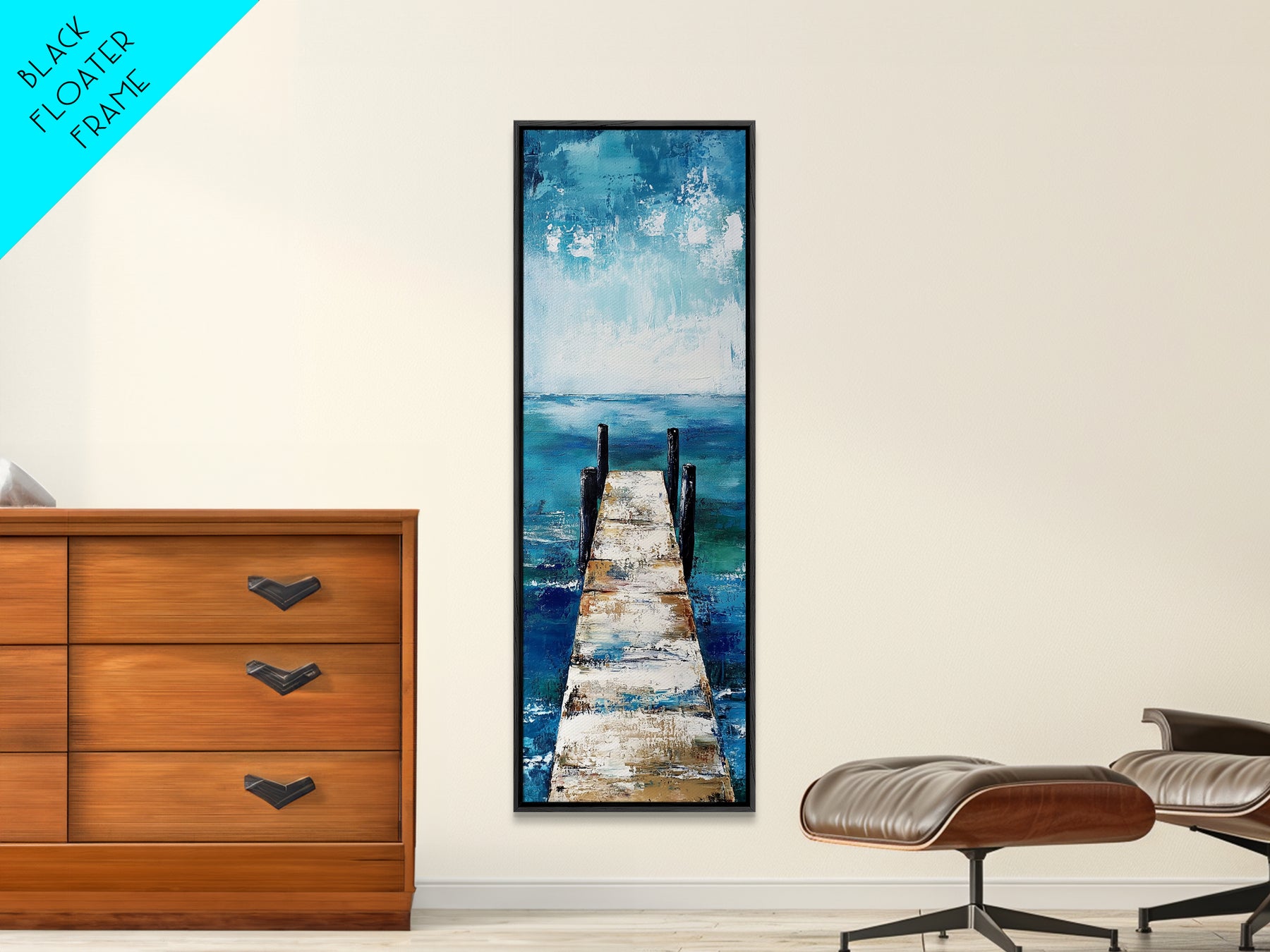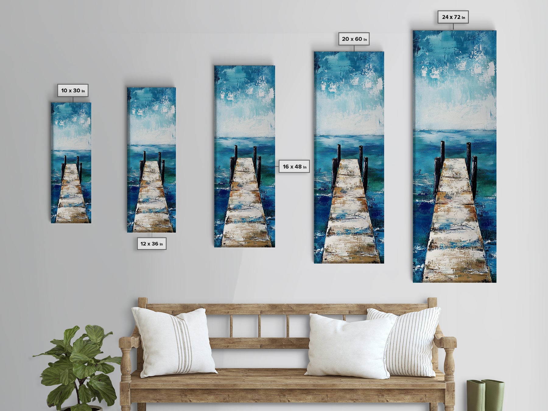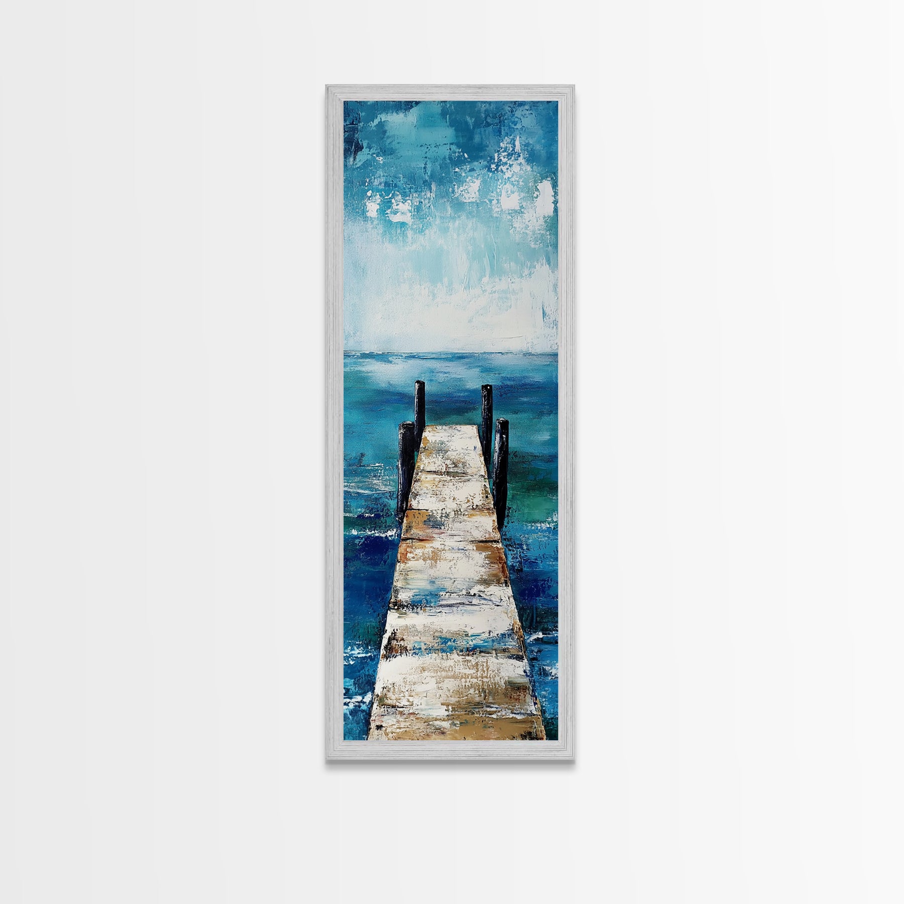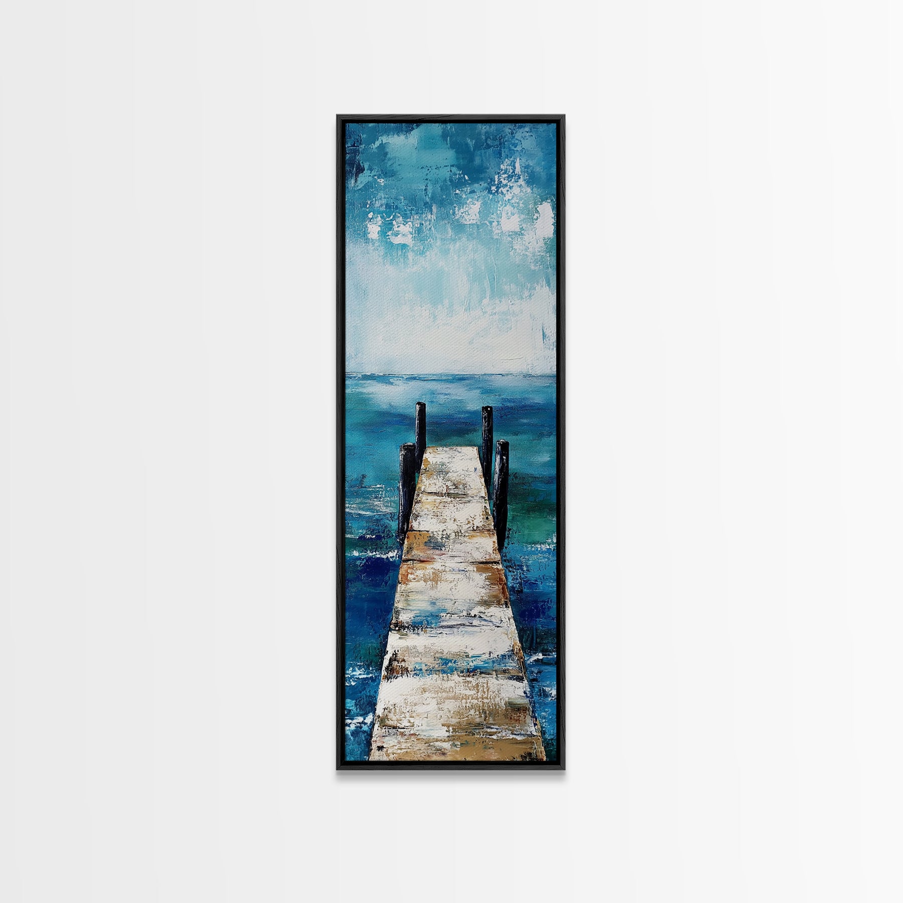 Dock on Water, Coastal Landscape Art, Nautical Wall Art, Seascape Painting, Rustic Decor, Tall Narrow Art, Canvas Print