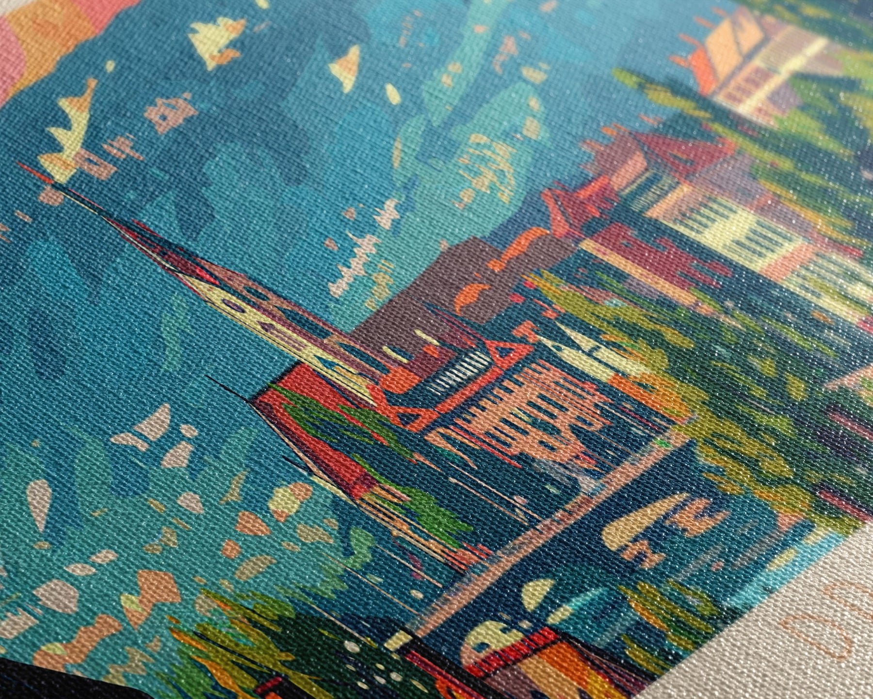 Most of our canvases are made in the USA, with the exception of canvases ordered with the light oak unstained frames, and any large canvases (24x48, 30x60, 16x48 and 20x60) ordered WITH a frame. These are temporarily made in and shipped from Europe, while we try to find a more consistent supplier in the USA.