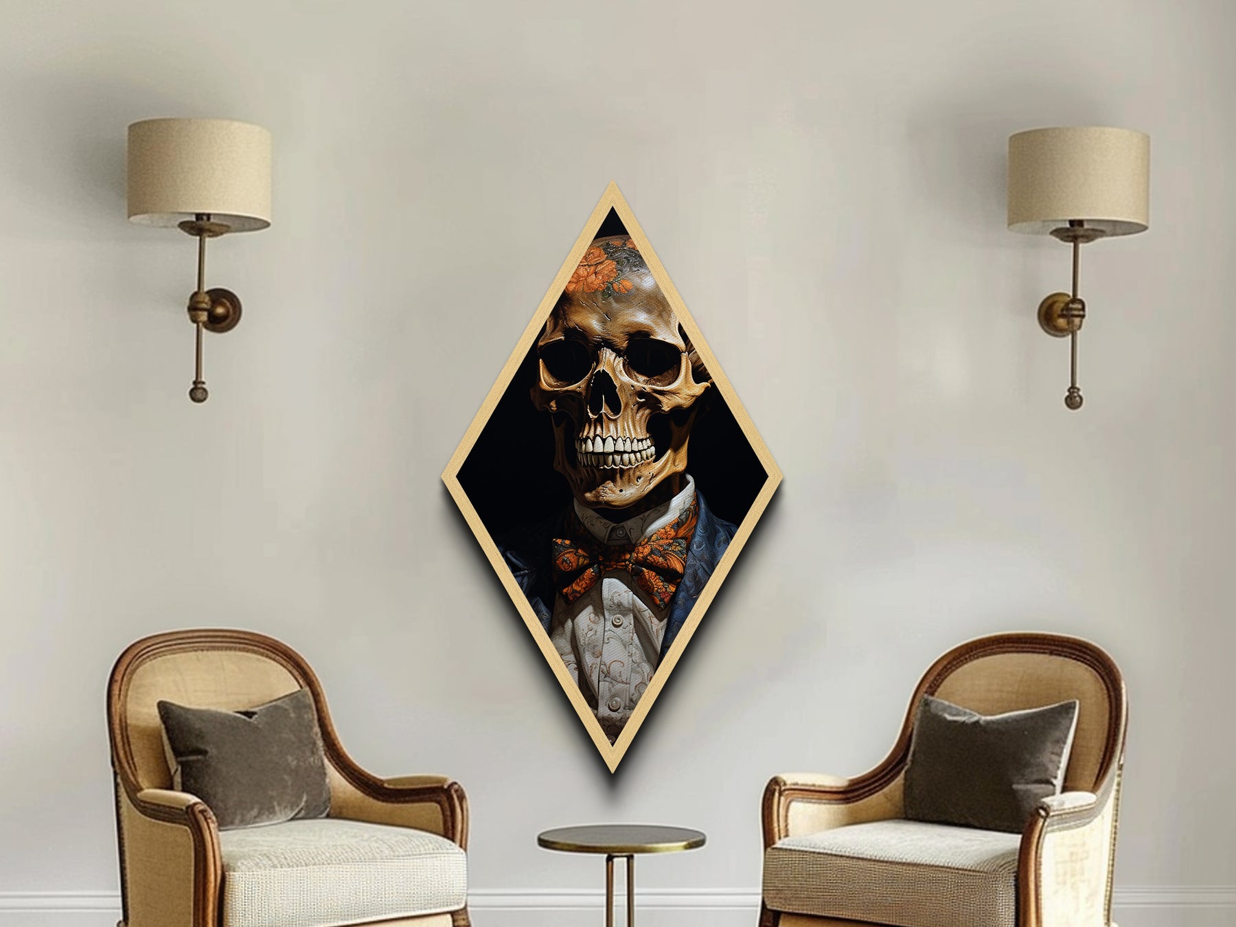 "Florals for the Dead" Skeleton with Flowered Skull and Pumpkin Bowtie Canvas Art Print, Diamond Shaped Halloween Decor in Gothic Baroque Style