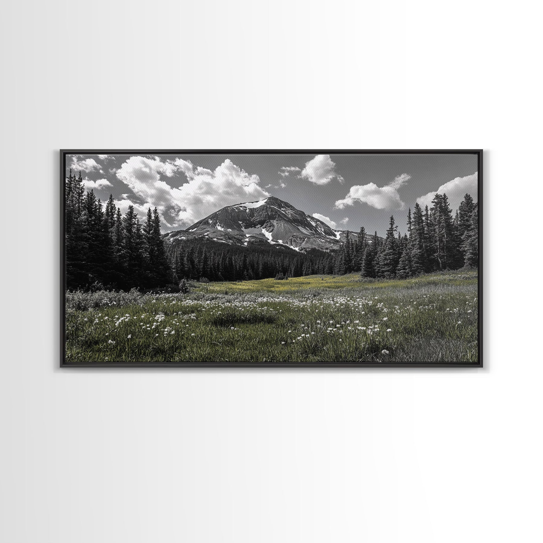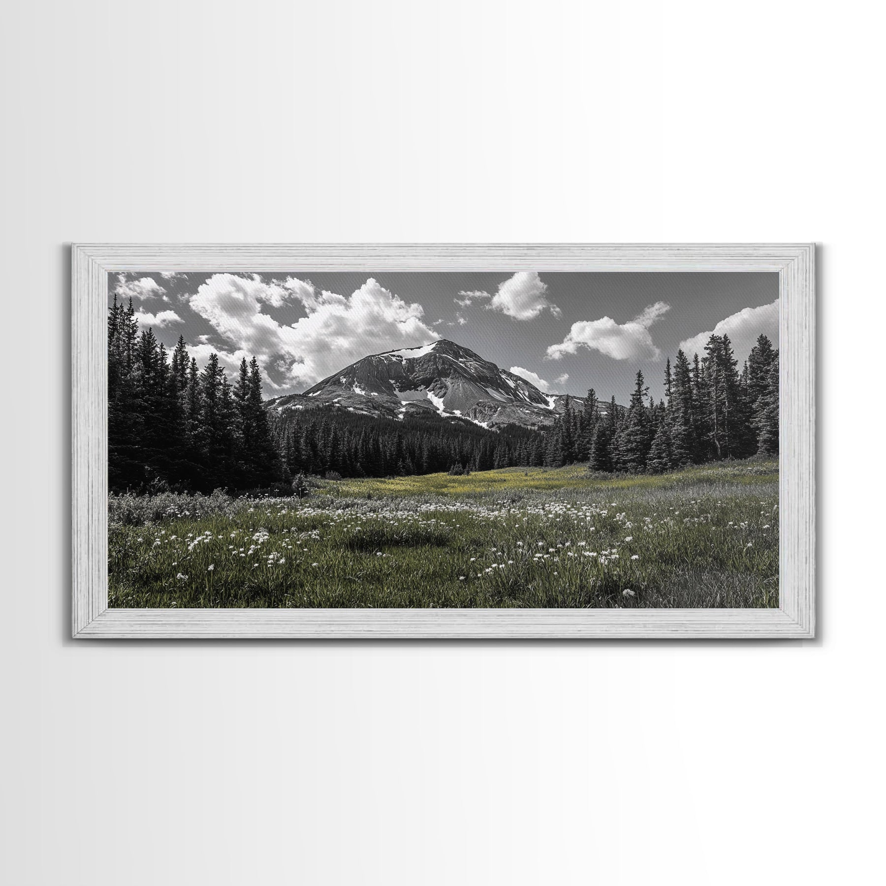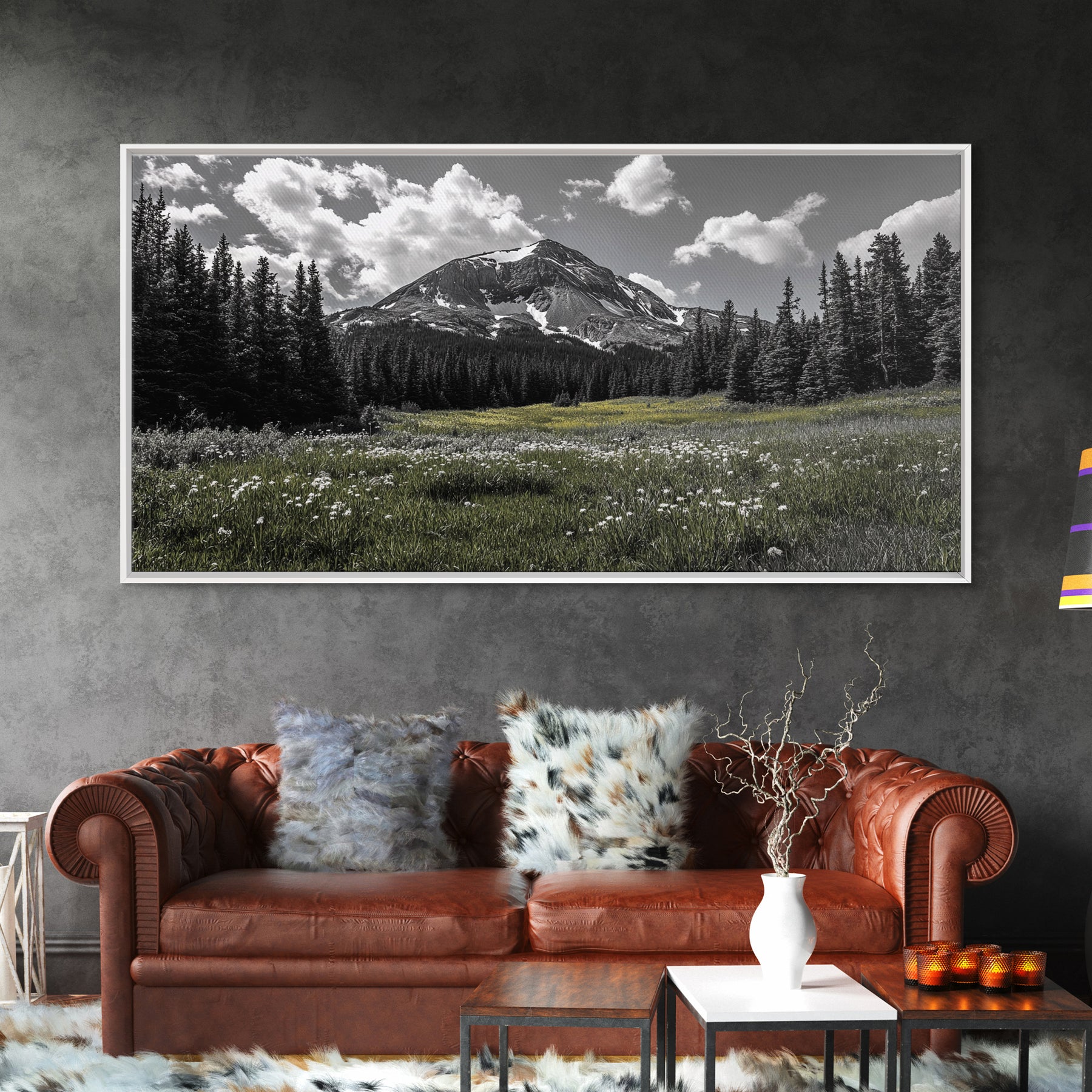 Mountain, Meadow, Wildflowers, Alpine meadow bloom and majestic peak on this Framed Canvas Print, serene Nature Wall Art for Entryway
