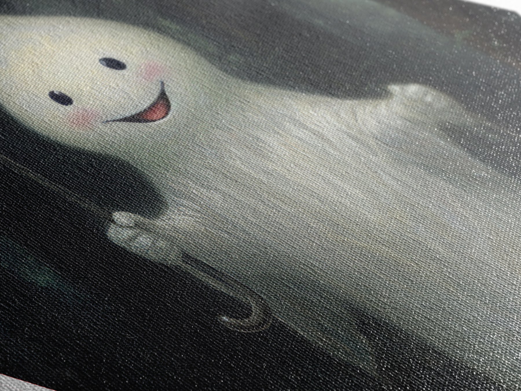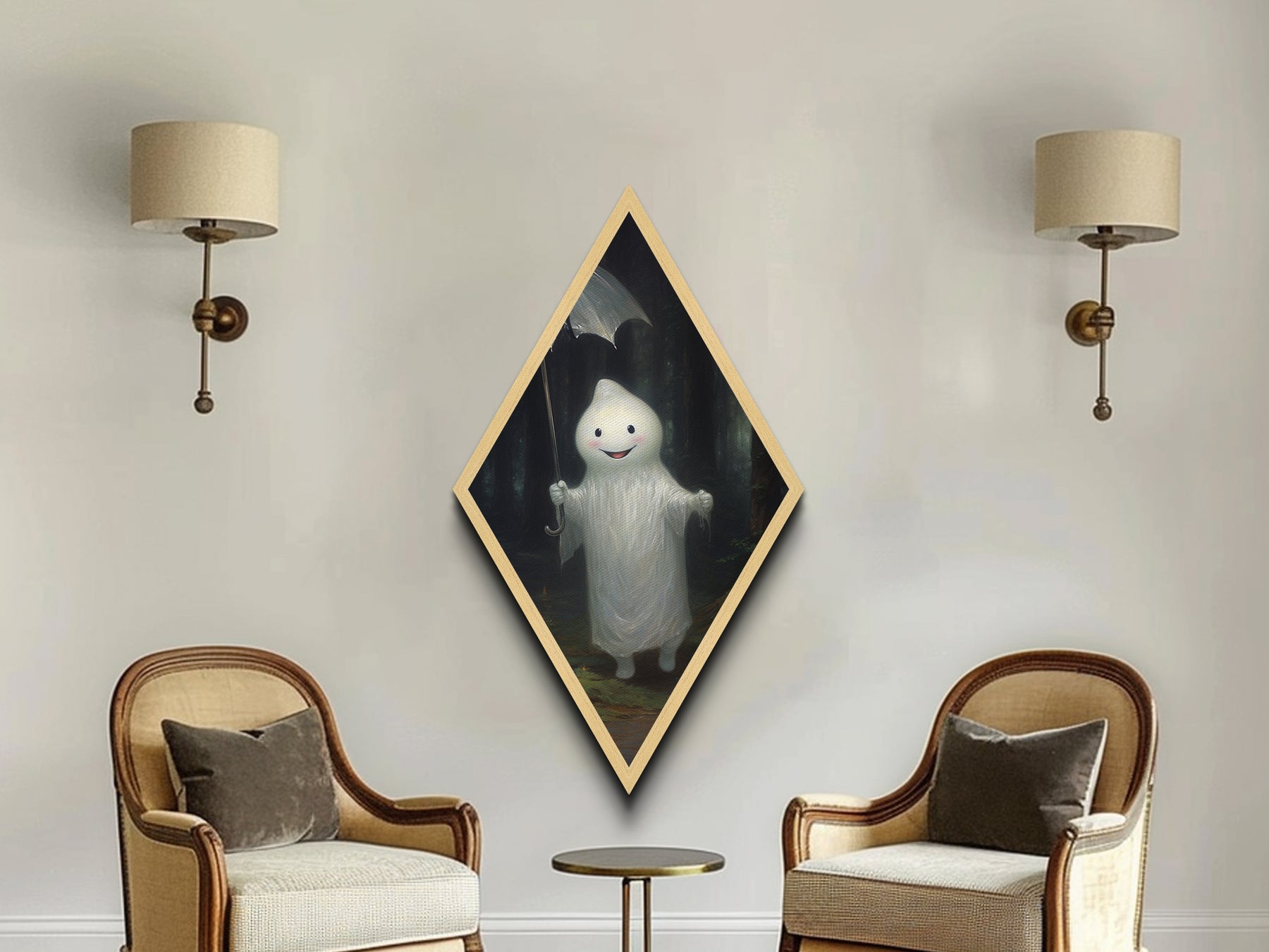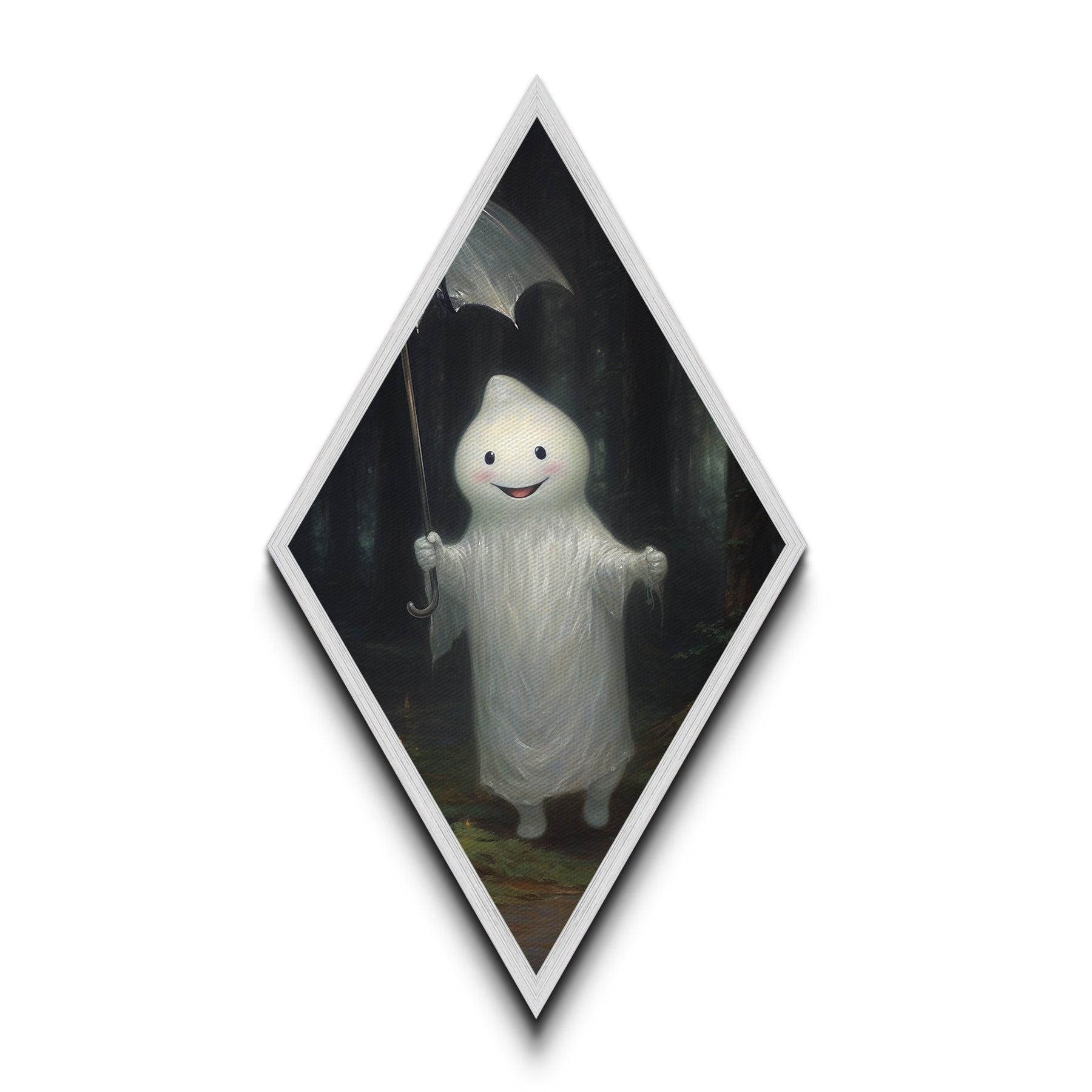 Mysterious Ghost with Umbrella Diamond Shaped Art in Pumpkin Patch Halloween Canvas Art Print Dark Academia Spooky Forest Theme