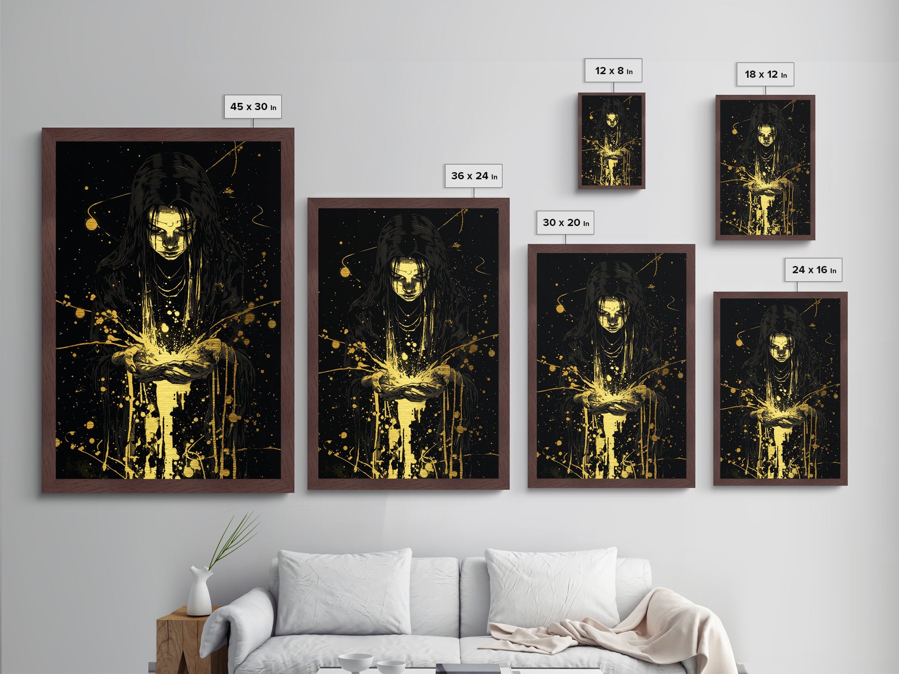 Hello and thank you for taking the time to view our modern high quality giclée artwork! Everything we sell is made in America. Our canvases are printed on museum grade 350 GSM canvas material with ECO friendly archival grade ink, then hand stretched and stapled over premium, FSC certified and shrink resistant frames. Designed and built to last a lifetime with proper care. *Metal Prints are printed on aluminum and framed with real wood frames. Not made with real gold, just gold colored metallic material. *Optional canvas frames add a total of 1.5 inches to each dimension, for example a 10x20 canvas with a frame will be 11.5 by 21.5 inches total. This excludes 30x60 and 24x72 framed canvases, those will be 30x60 and 24x72 respectively, including the frame. *Our awesome artwork makes the perfect gift for any occasion including Mother's Day, Christmas, or Birthdays, and suitable to decorate any space such as your living room, office, bedroom, kid's room, kitchen, anywhere with a wall! Artwork is made with the assistance of A I - I have been an artist for over 10 years and it really is a good tool for helping me with my workflow. If you have any questions regarding this please ask! *Every order placed in our shop comes with FREE ground shipping, and we typically take 1-2 days to make each order. After that, UPS/FedEx takes 1 to 3 days to deliver, so most orders typically arrive within 2 to 7 business days. *SHIPPING: Every canvas is carefully wrapped in bubble wrap and foam corner protectors, and shipped fully assembled and ready to hang with sawtooth hangers or wire hangers in a flat box. All you need is a hammer! *We take returns and exchanges, up to 4 weeks after delivery! Did the art you order not quite match your space? We will take it back or exchange for something else for up to 4 weeks after your order is delivered. We are art addicts too, and understand how sometimes a picture online can't give you the full picture.