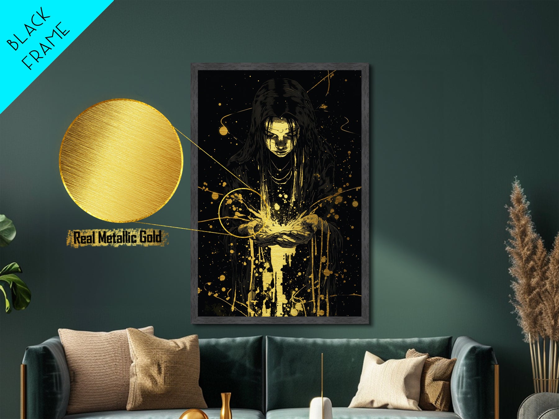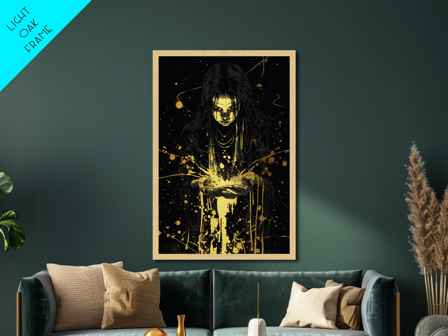 Mystic Sorceress Hands Metallic Gold Art – Halloween Metal Art Print with Glowing Magic, Spooky Wall Hanging in Wood Frame