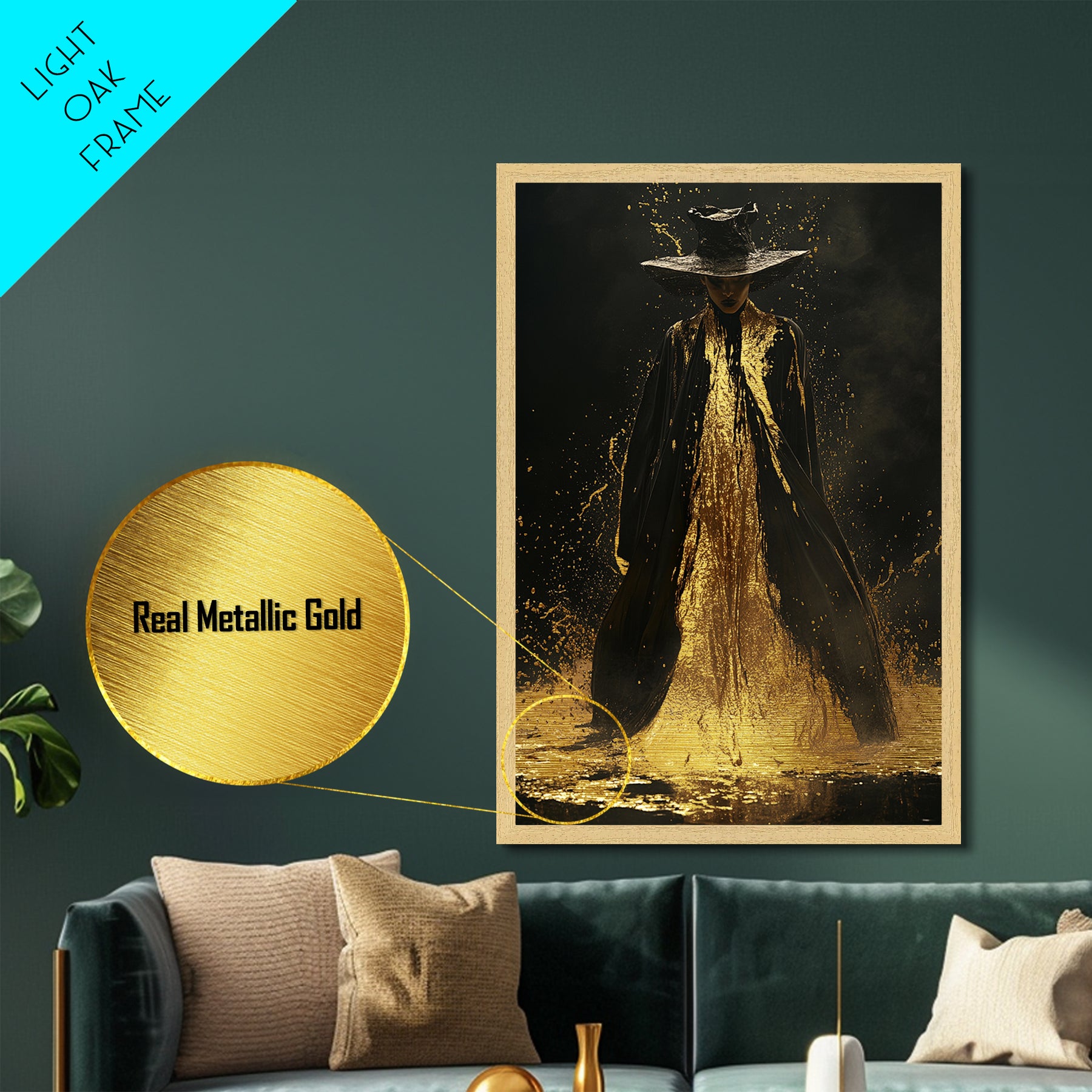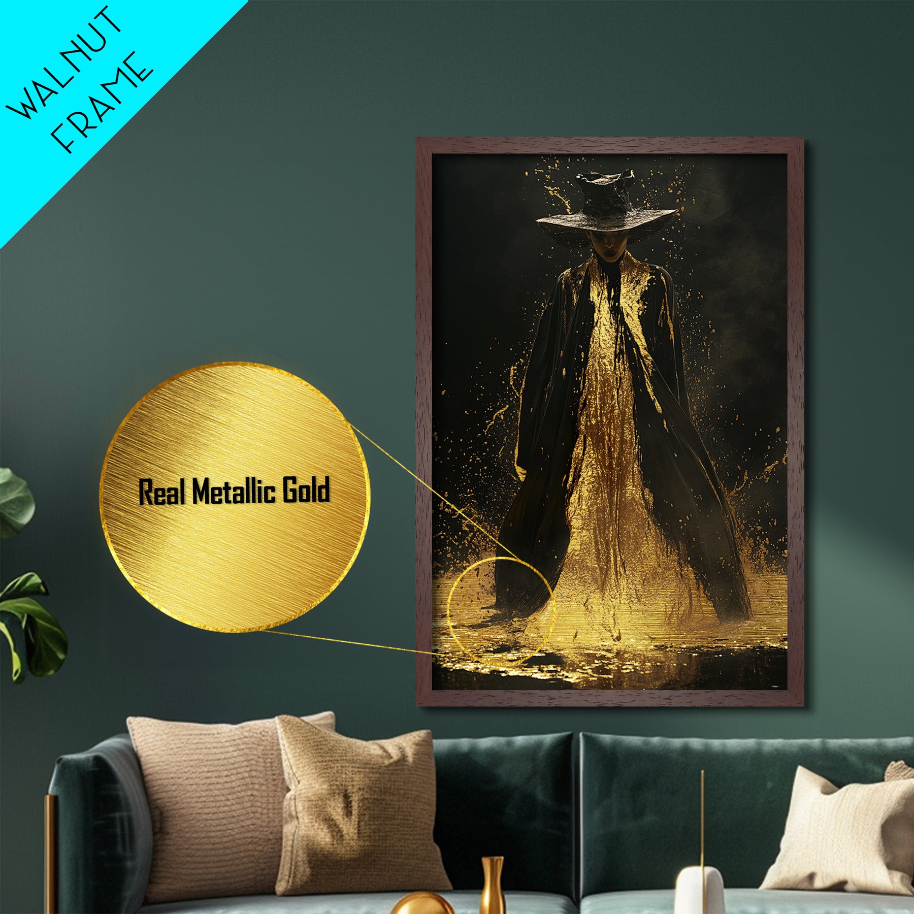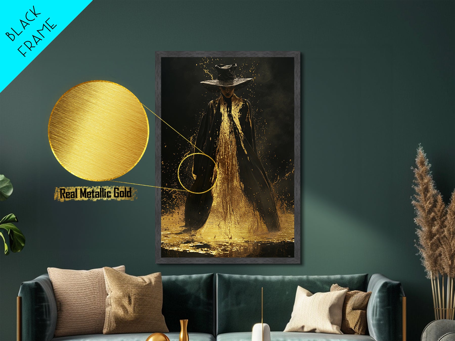 Mystic Witch Metallic Gold Art Wall Print, Gothic Spooky Metal Art, Halloween Enchanted Portrait with Solid Wood Frame