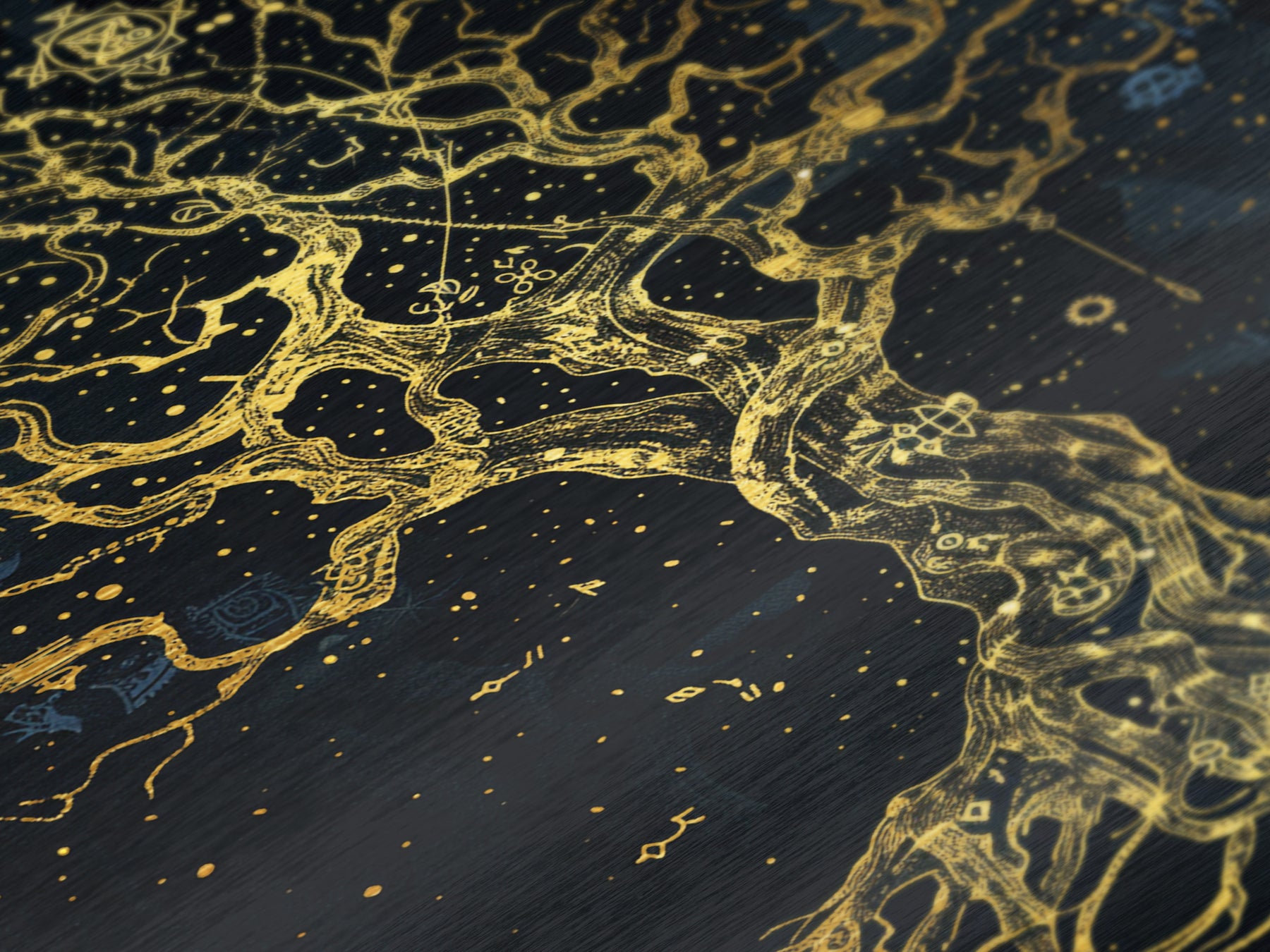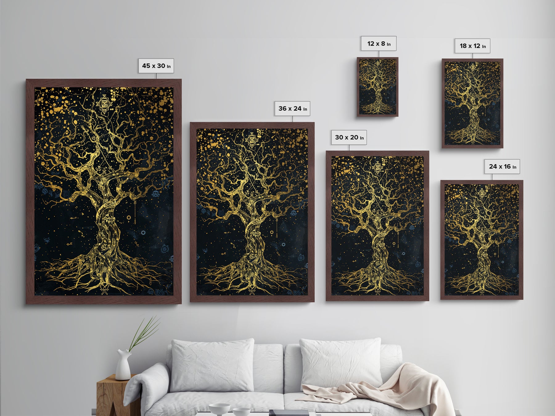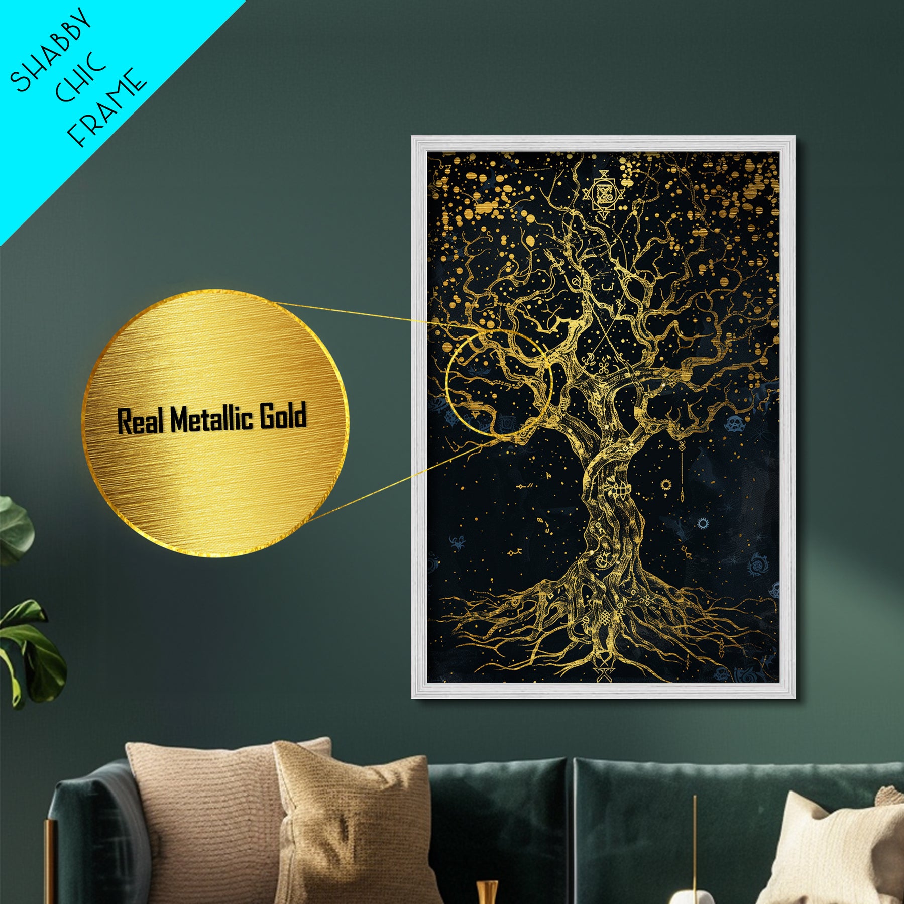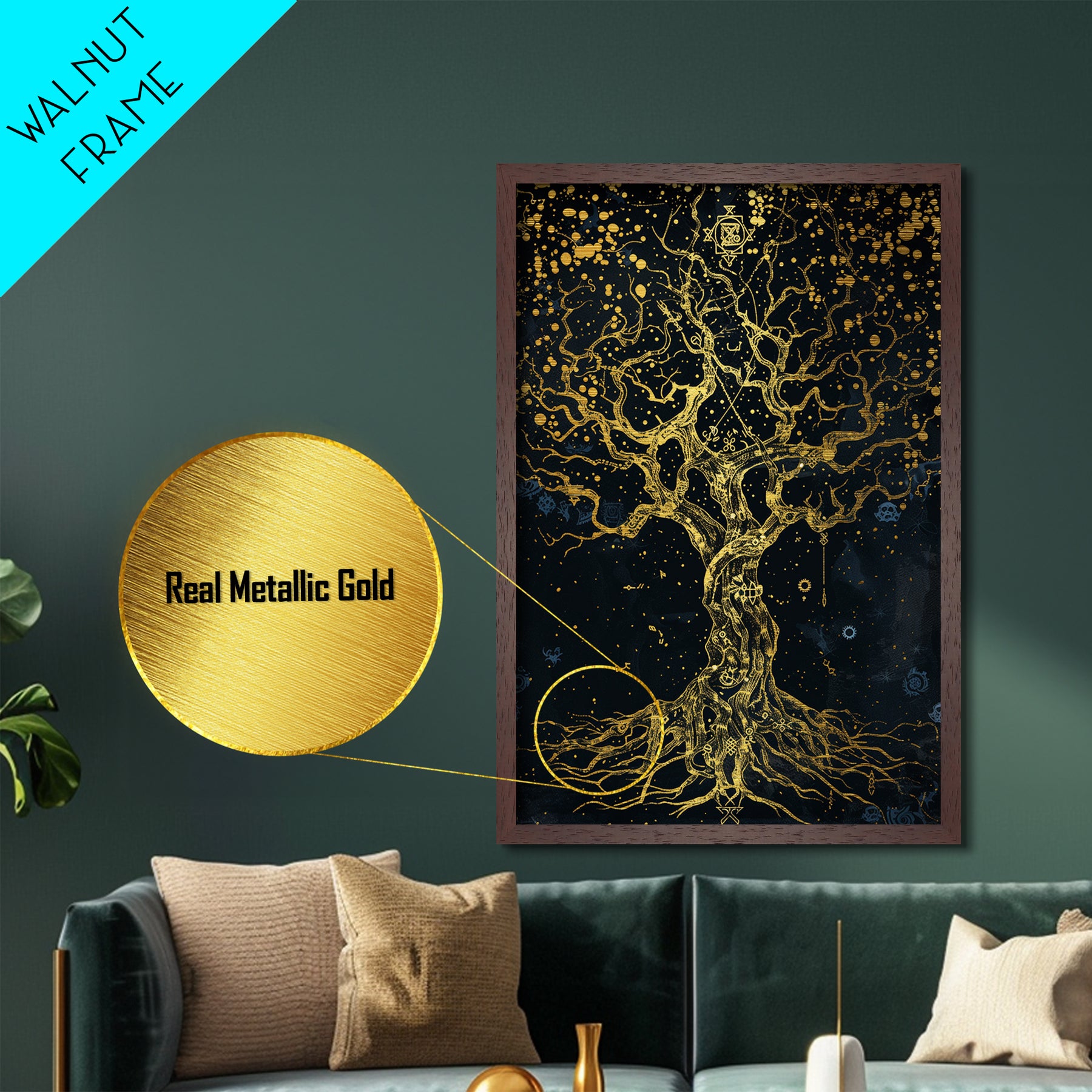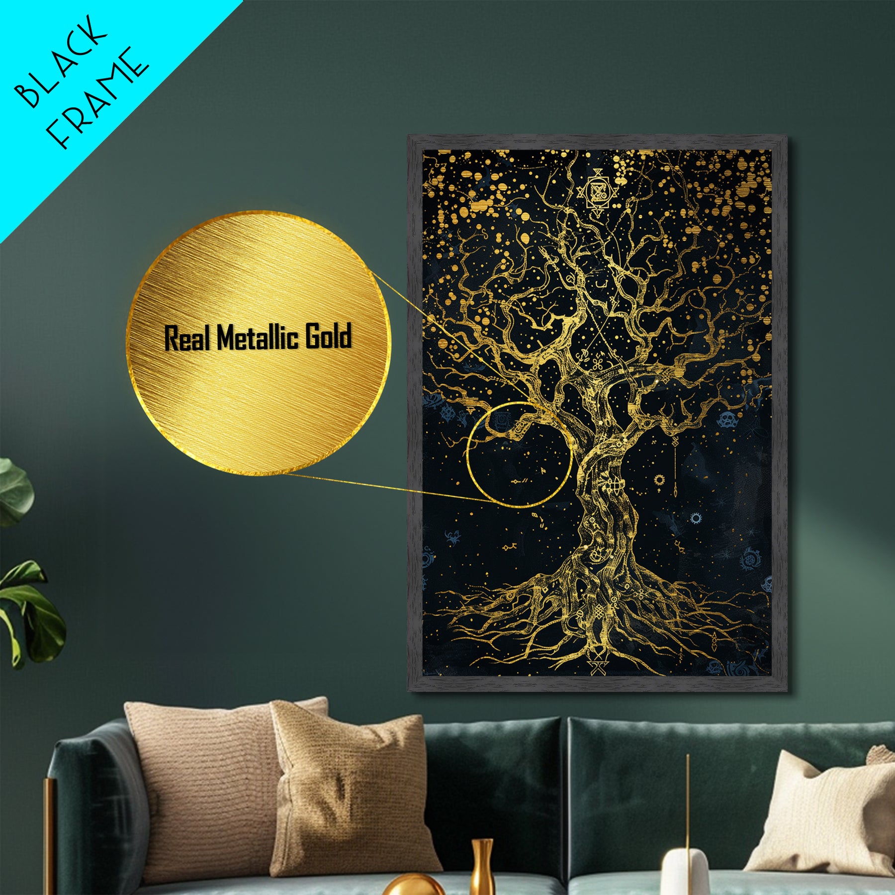 Mystical Tree Of Life Metallic Gold Art, Celestial Symbolic Nature Metal Print, Real Wood Frame Wall Décor, Sacred Mythology Fantasy Artwork