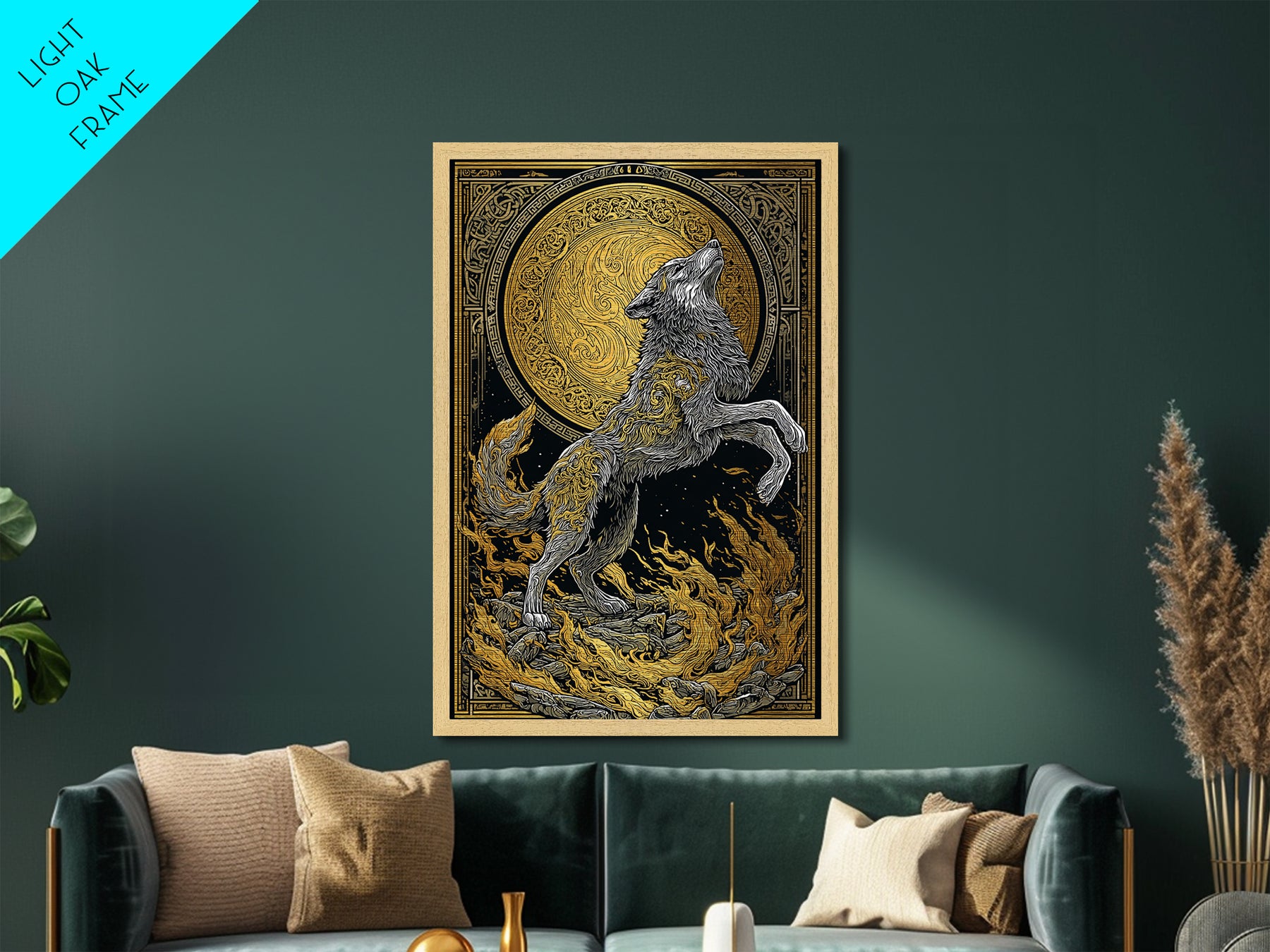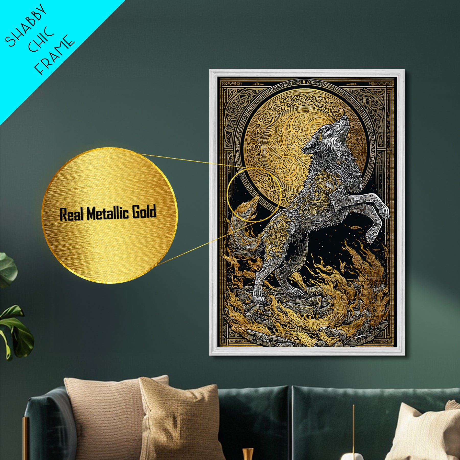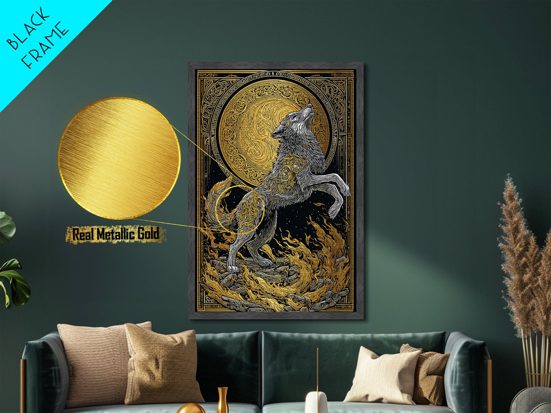 Mythic Wolf Spirit Metallic Gold Art Metal Art | Norse Viking Wall Art Pagan Symbol Decor for Man Cave | Set with Natural Wood Frame