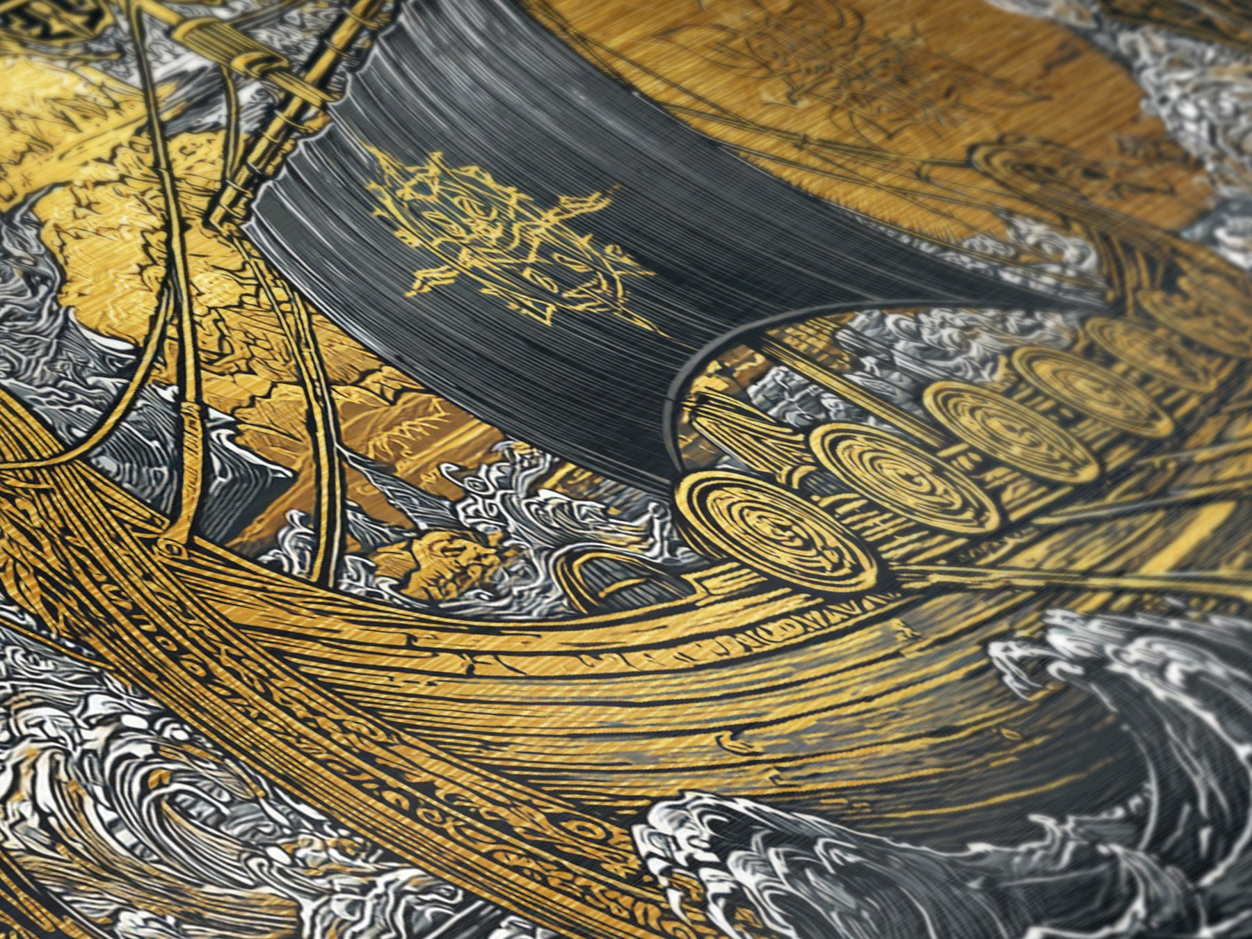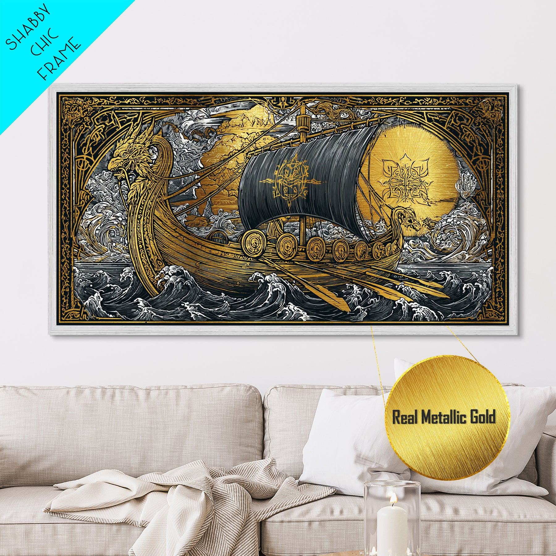 Naglfar Norse Longship Metallic Gold Art Metal Art Viking Ship Wall Decor Nordic Mythology Office or Dad Gift framed with natural wood