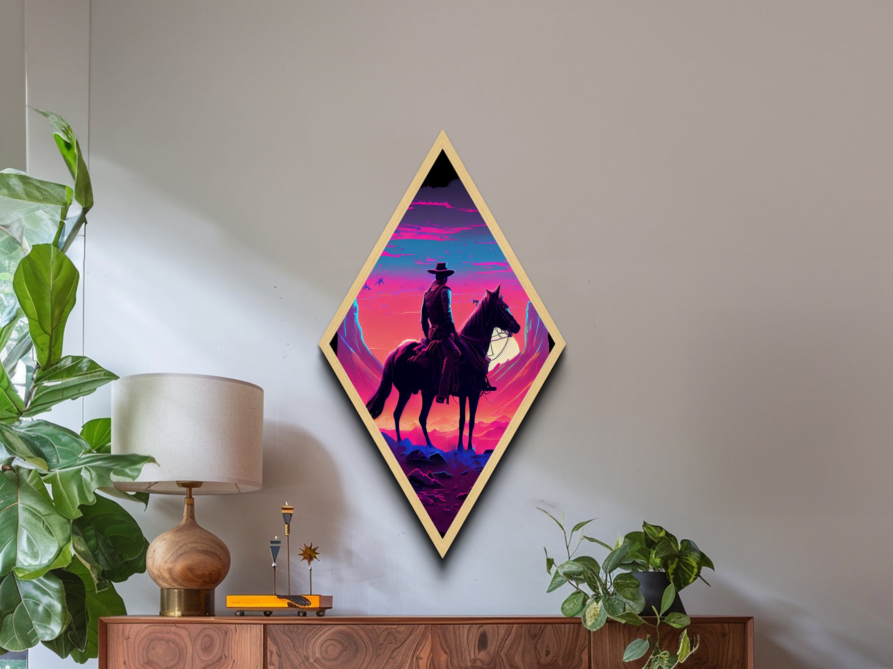 Neon Cowboy Sunset – Diamond Shaped Canvas Art Print with Western Landscape Scene, Vibrant Sky Wall Decor, Modern Desert Art