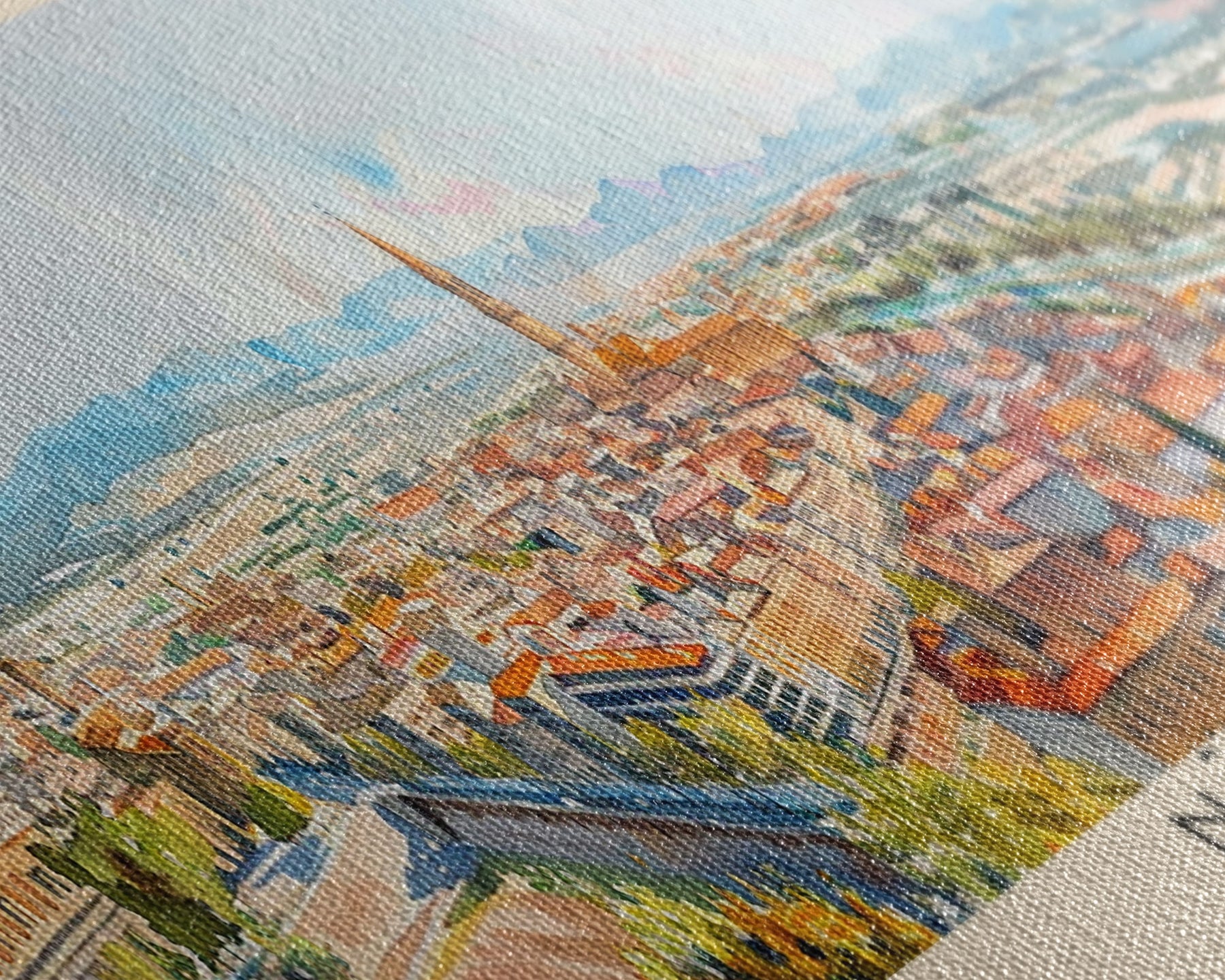 Most of our canvases are made in the USA, with the exception of canvases ordered with the light oak unstained frames, and any large canvases (24x48, 30x60, 16x48 and 20x60) ordered WITH a frame. These are temporarily made in and shipped from Europe, while we try to find a more consistent supplier in the USA.