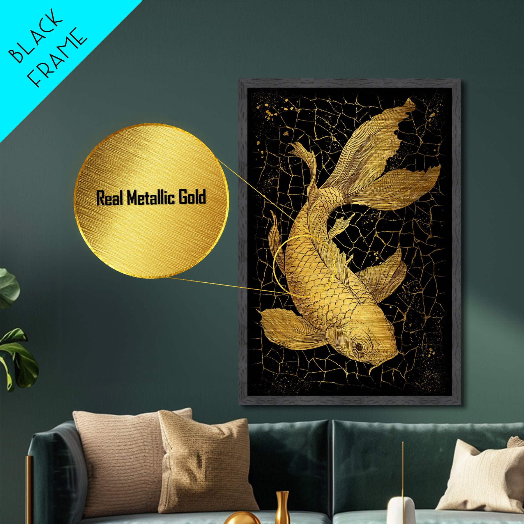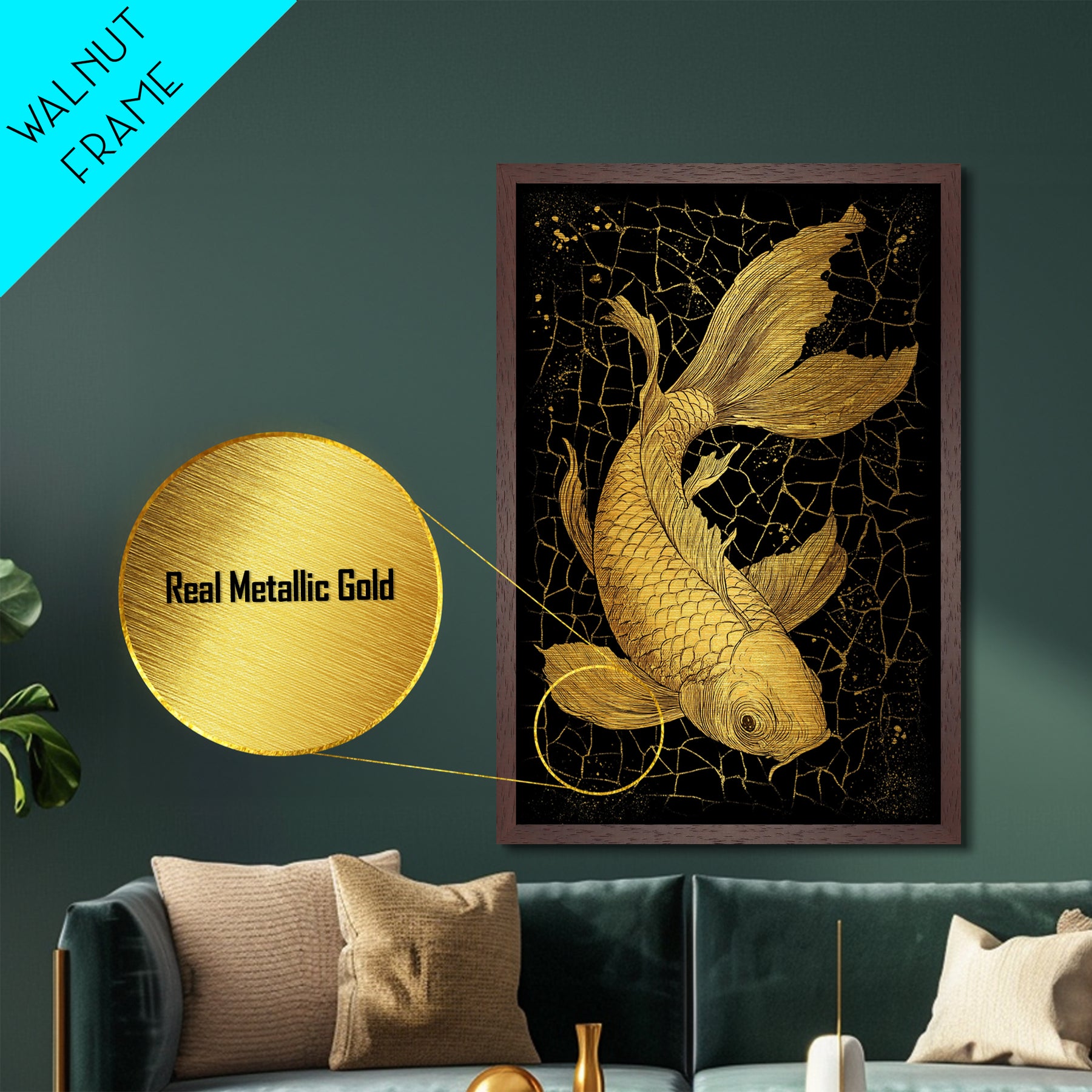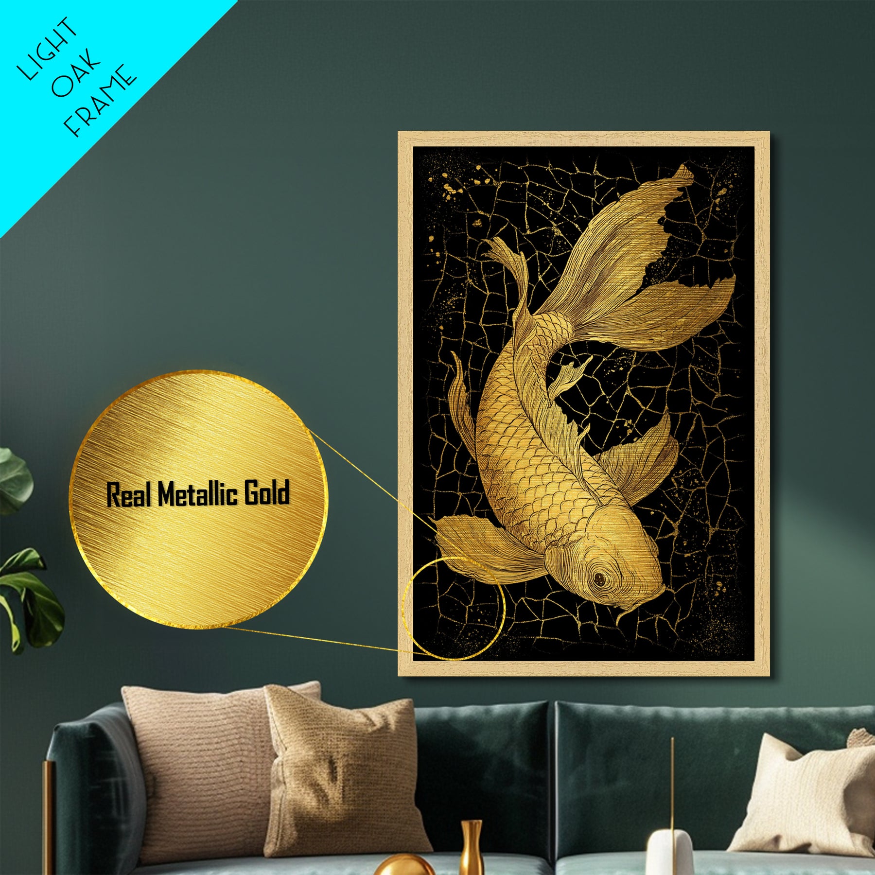 Nordic Mythology Metallic Gold Art Metal Art Koi Fish Wall Decor, Viking Inspired Gift for Men, Framed in Real Wood