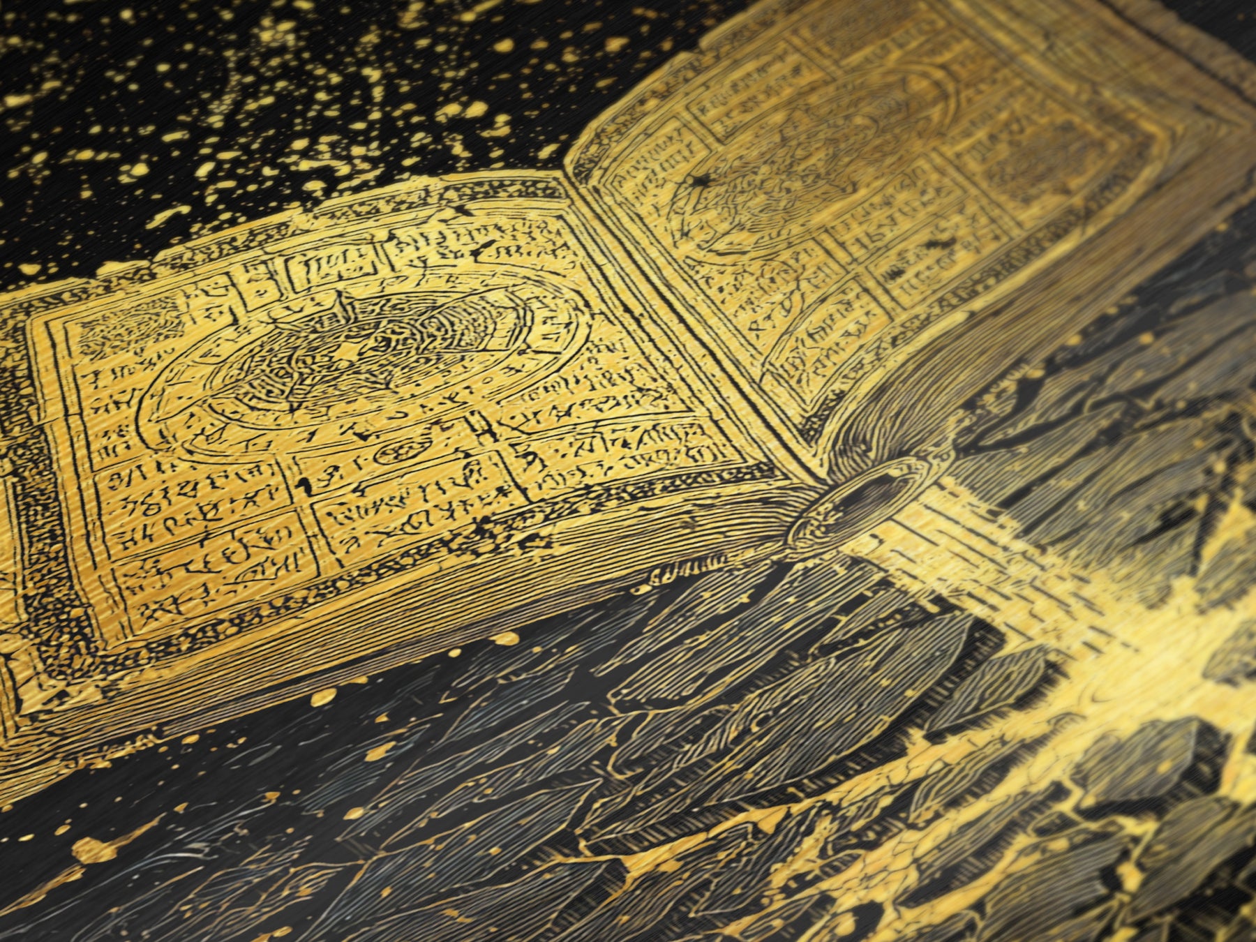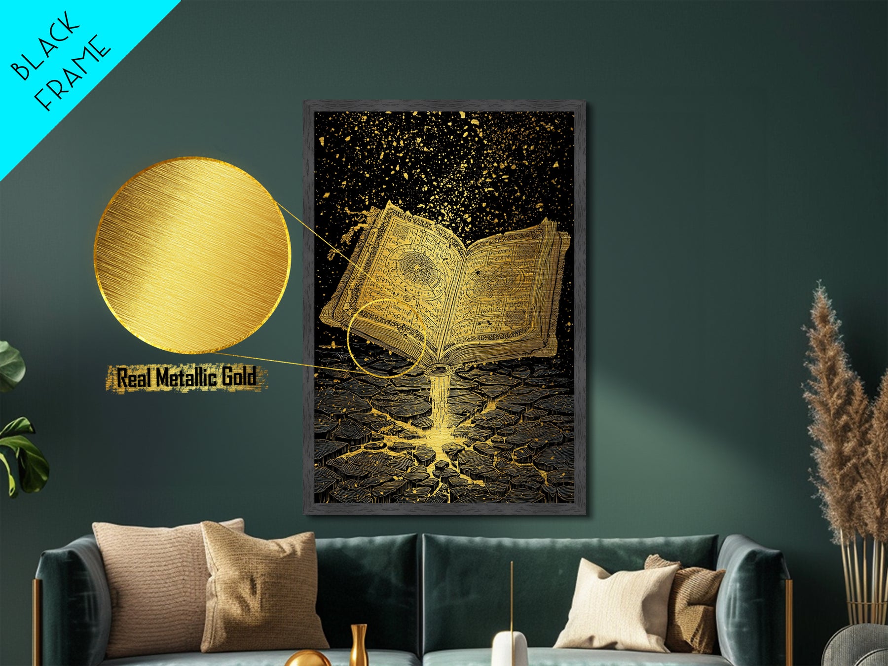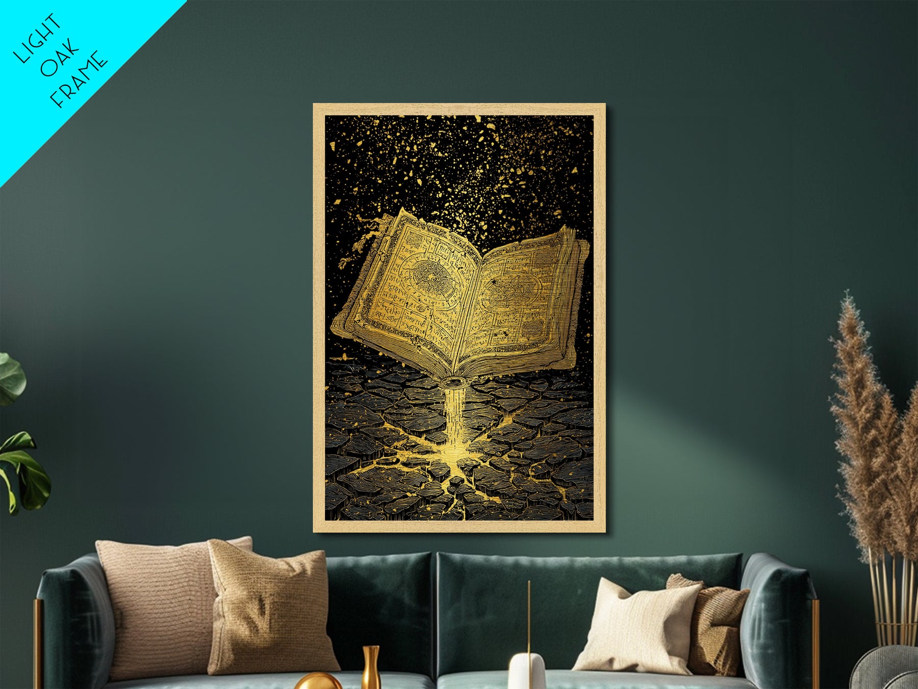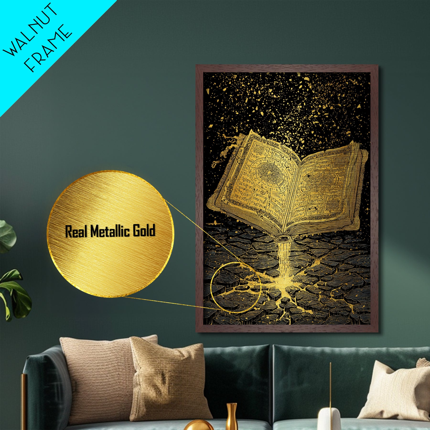 Nordic Spellbook Metallic Gold Art Metal Art | Viking Runes Mythology Wall Decor for Man Cave or Office | Framed with Wood