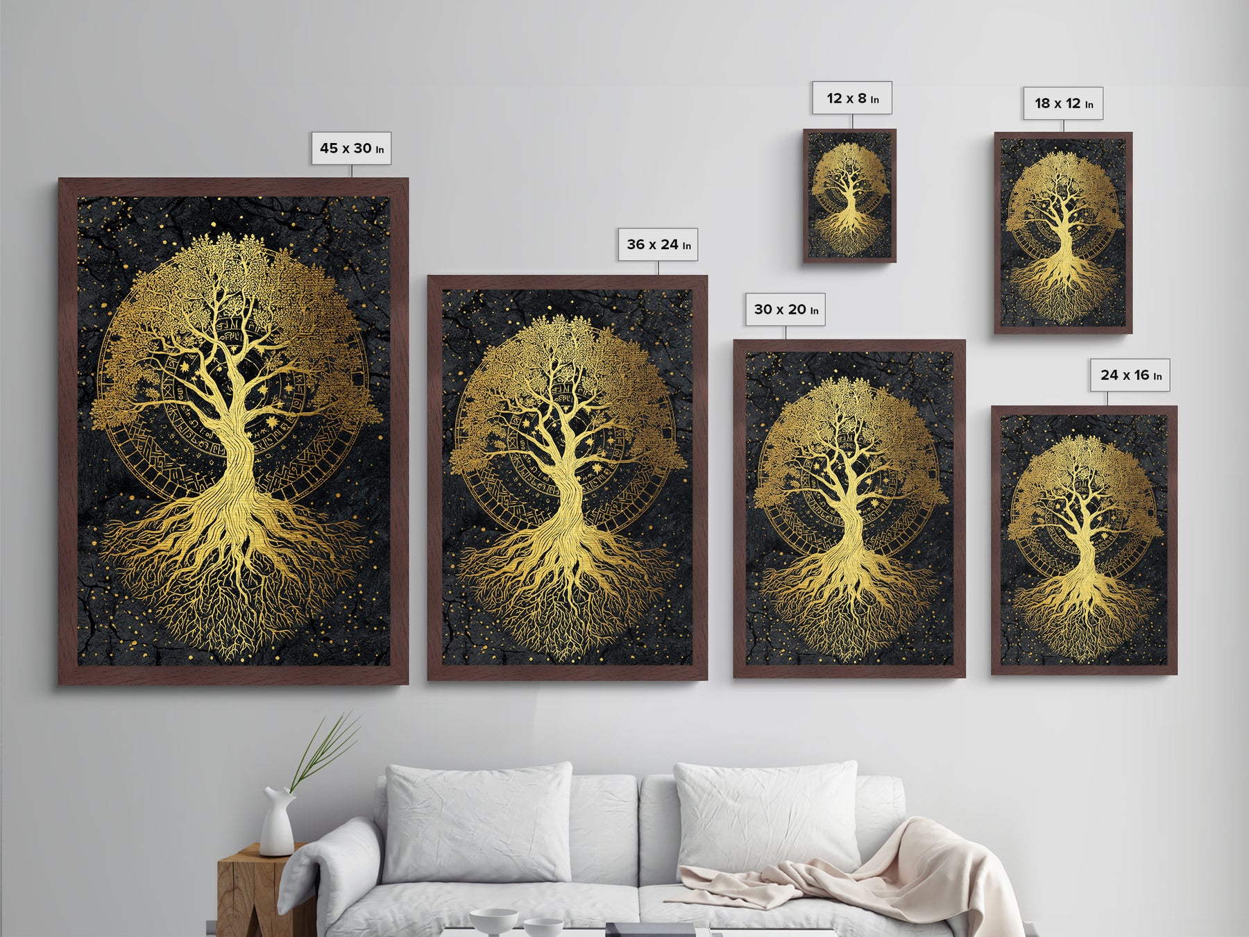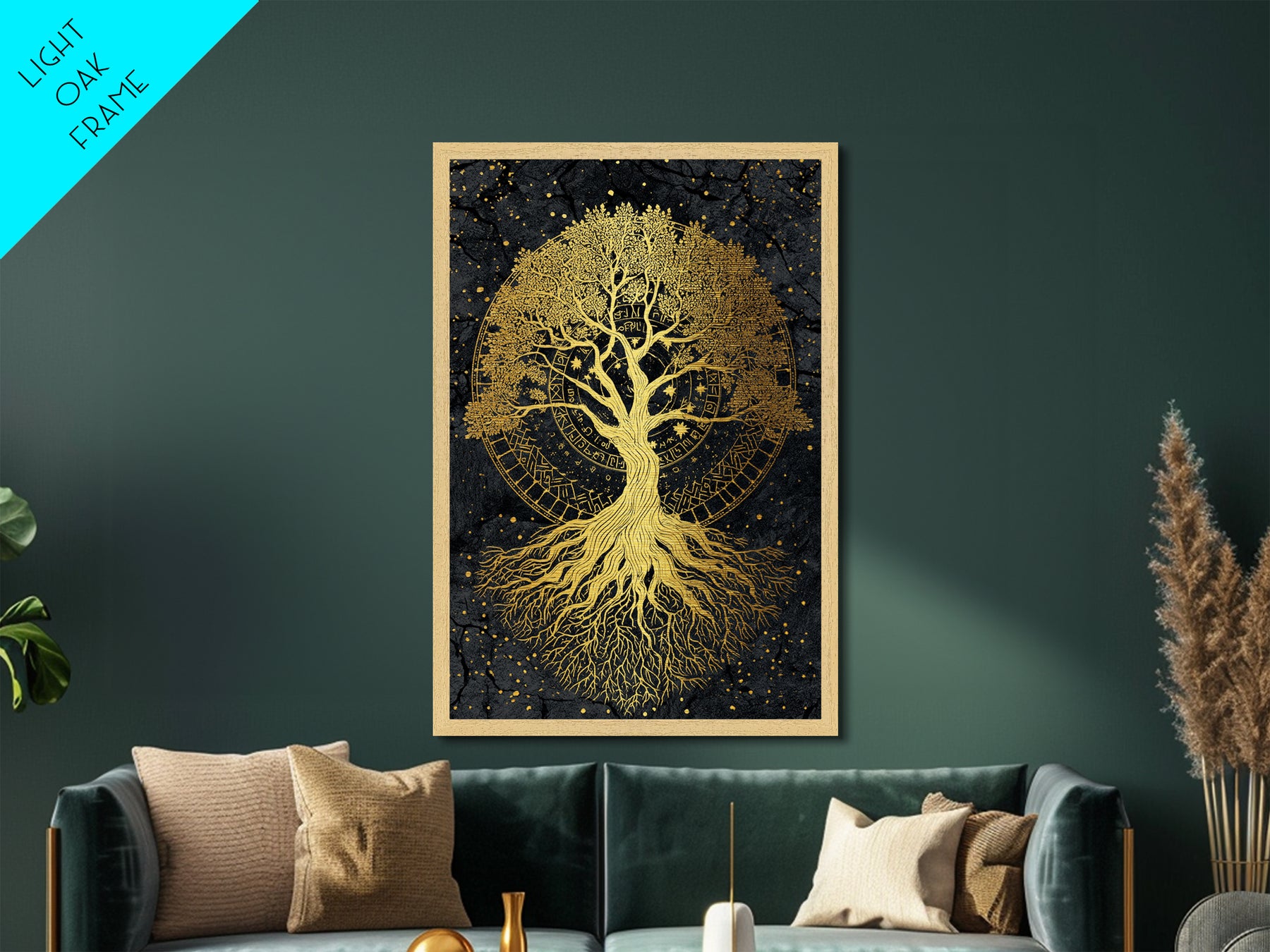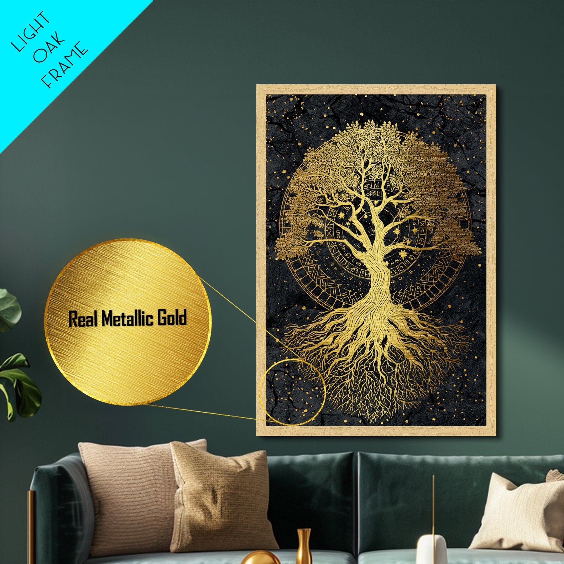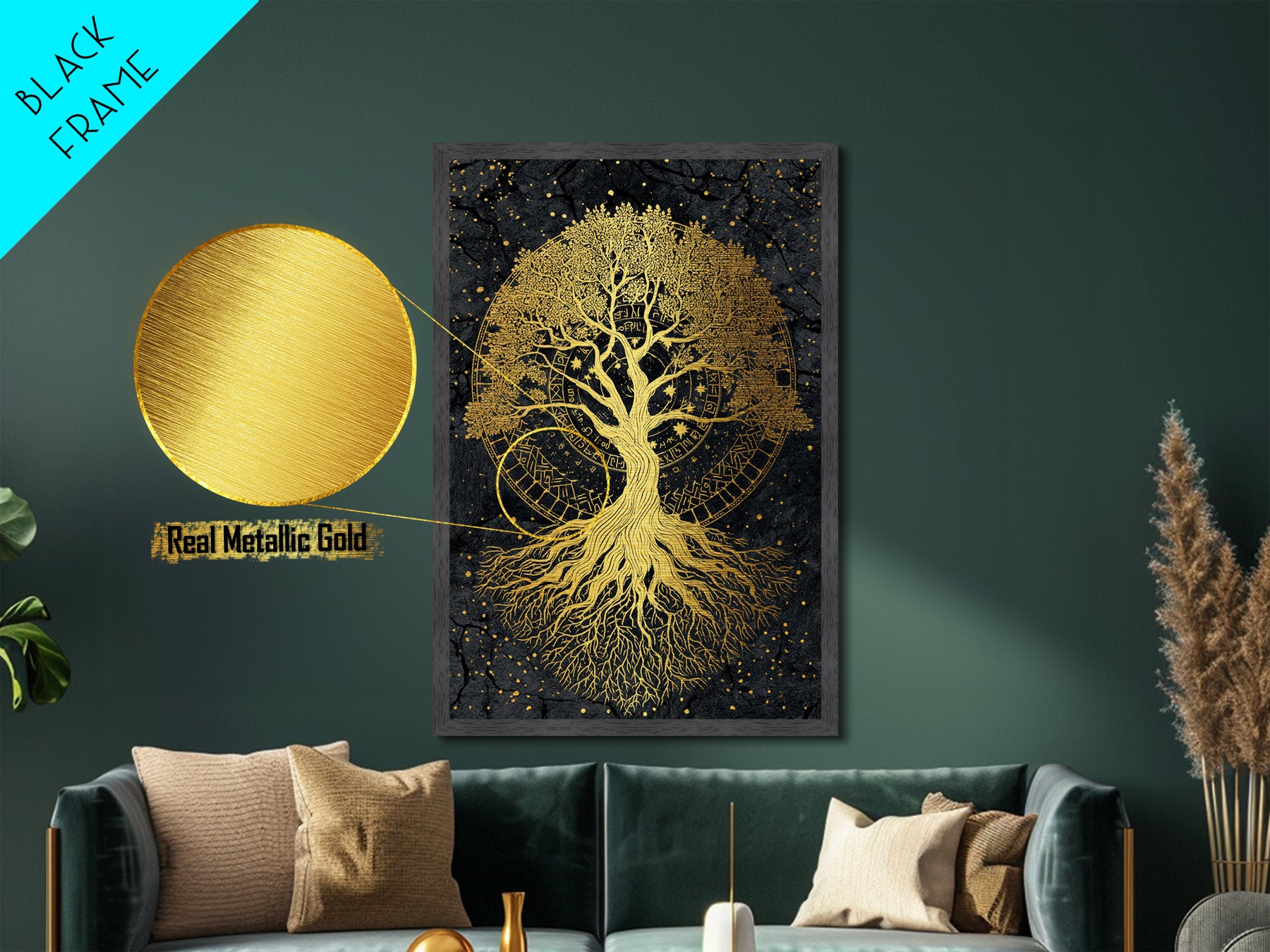 Nordic Yggdrasil Tree of Life Metallic Gold Art Metal Art with real wood frame, Norse Mythology Office Decor and Dad Gift Idea