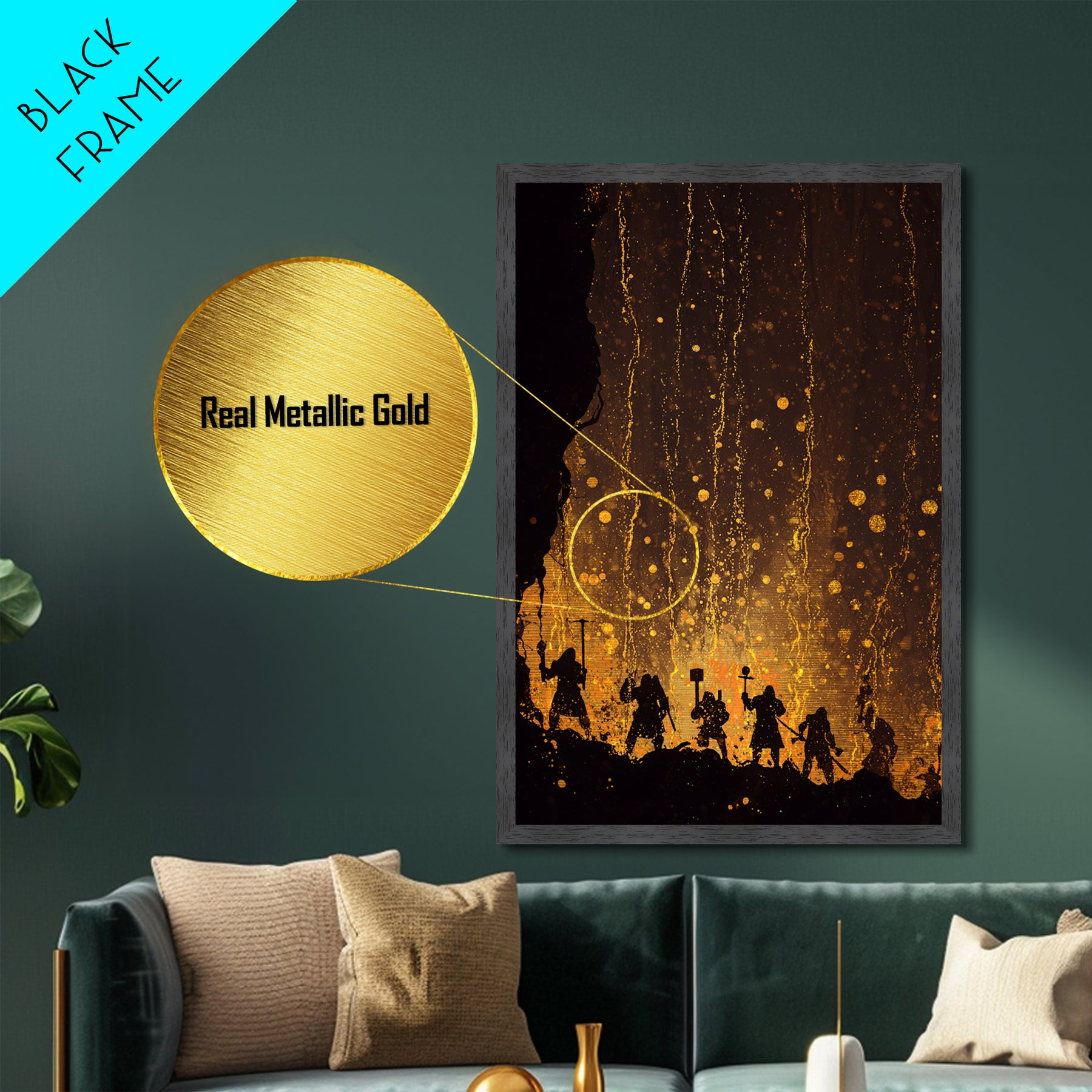 Norse Dwarves Warrior Silhouette Metallic Gold Art Metal Art Nordic Mythology Man Cave Wall Decor framed in natural wood
