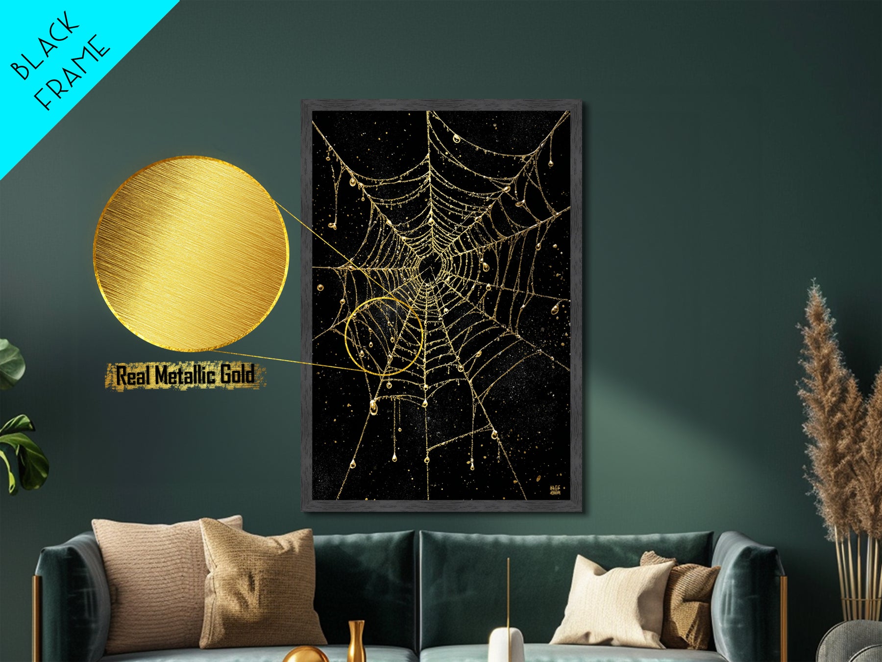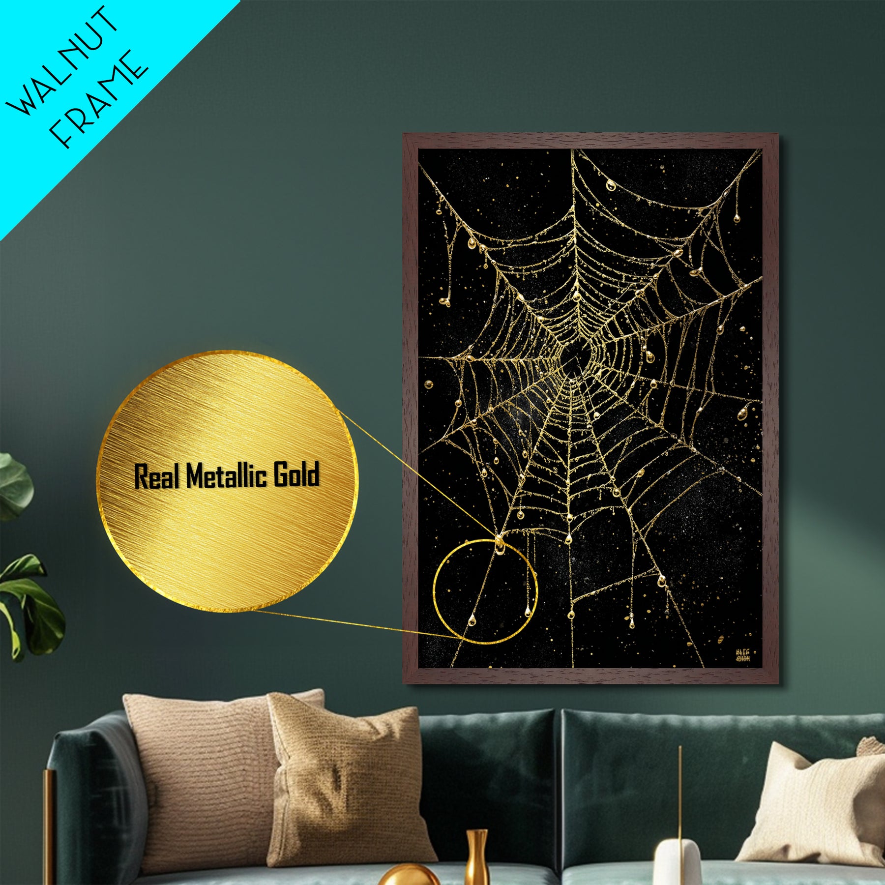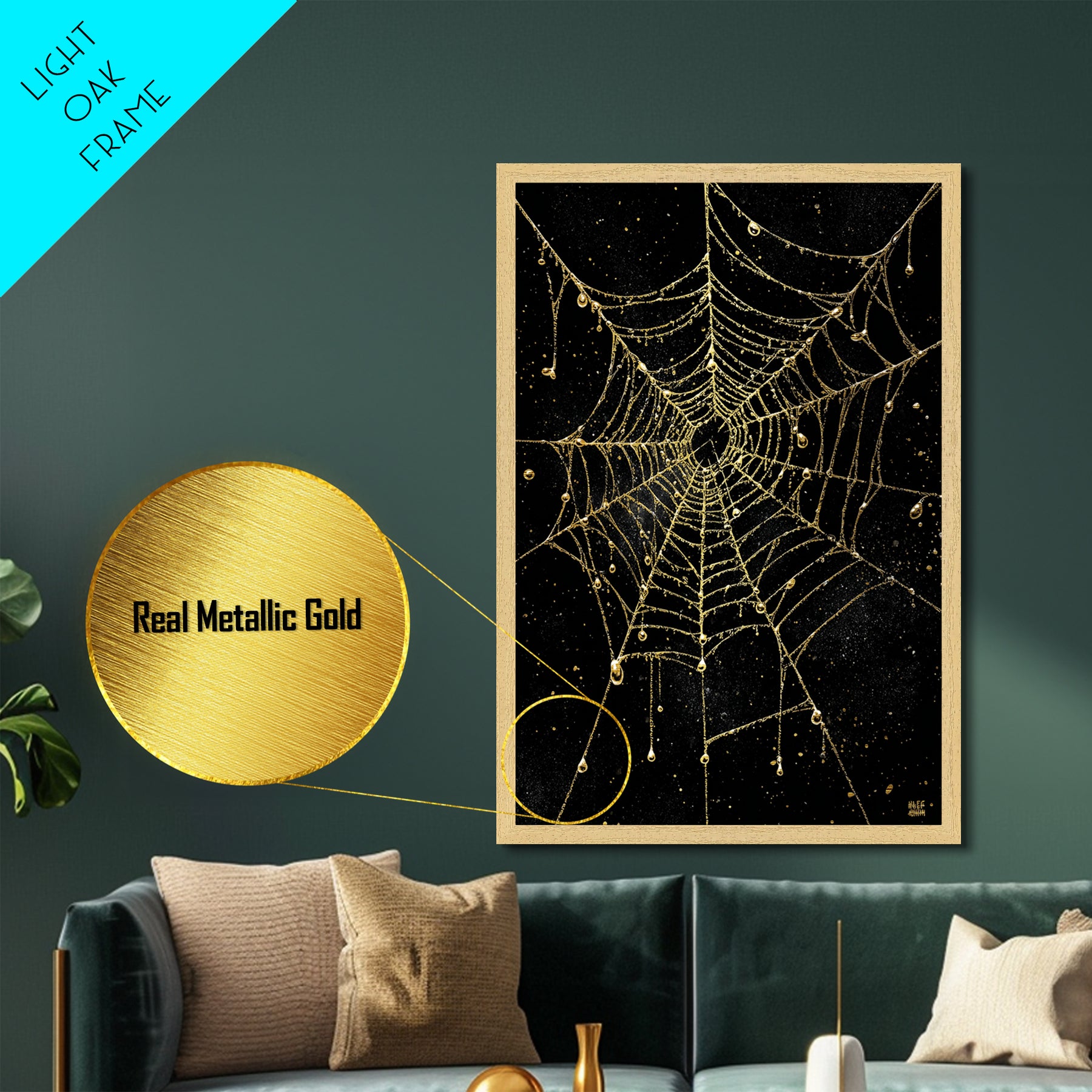 Norse Fate Web Metallic Gold Art, Nordic Metal Art of Urd’s Threads, Viking Office Wall Decor framed in authentic natural wood