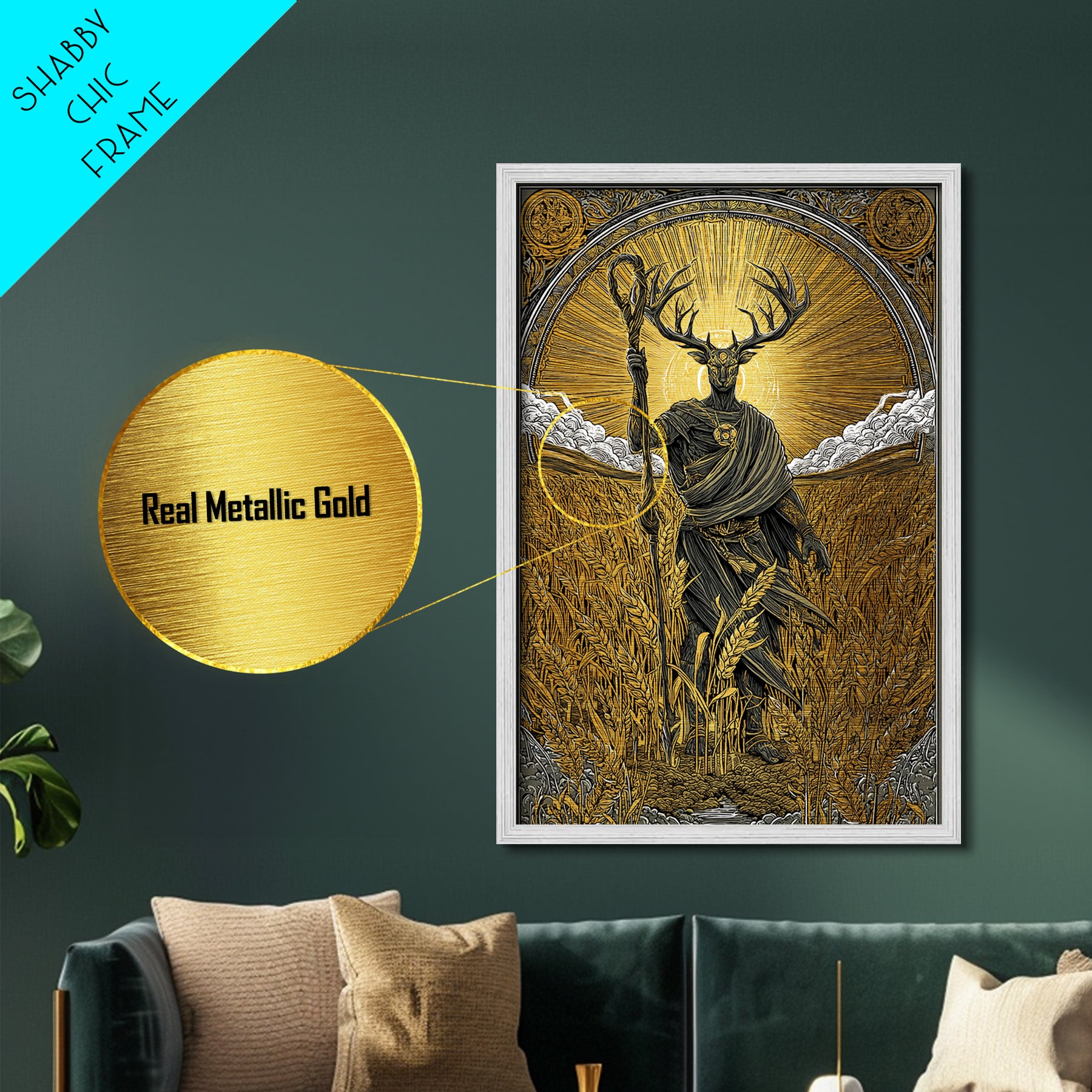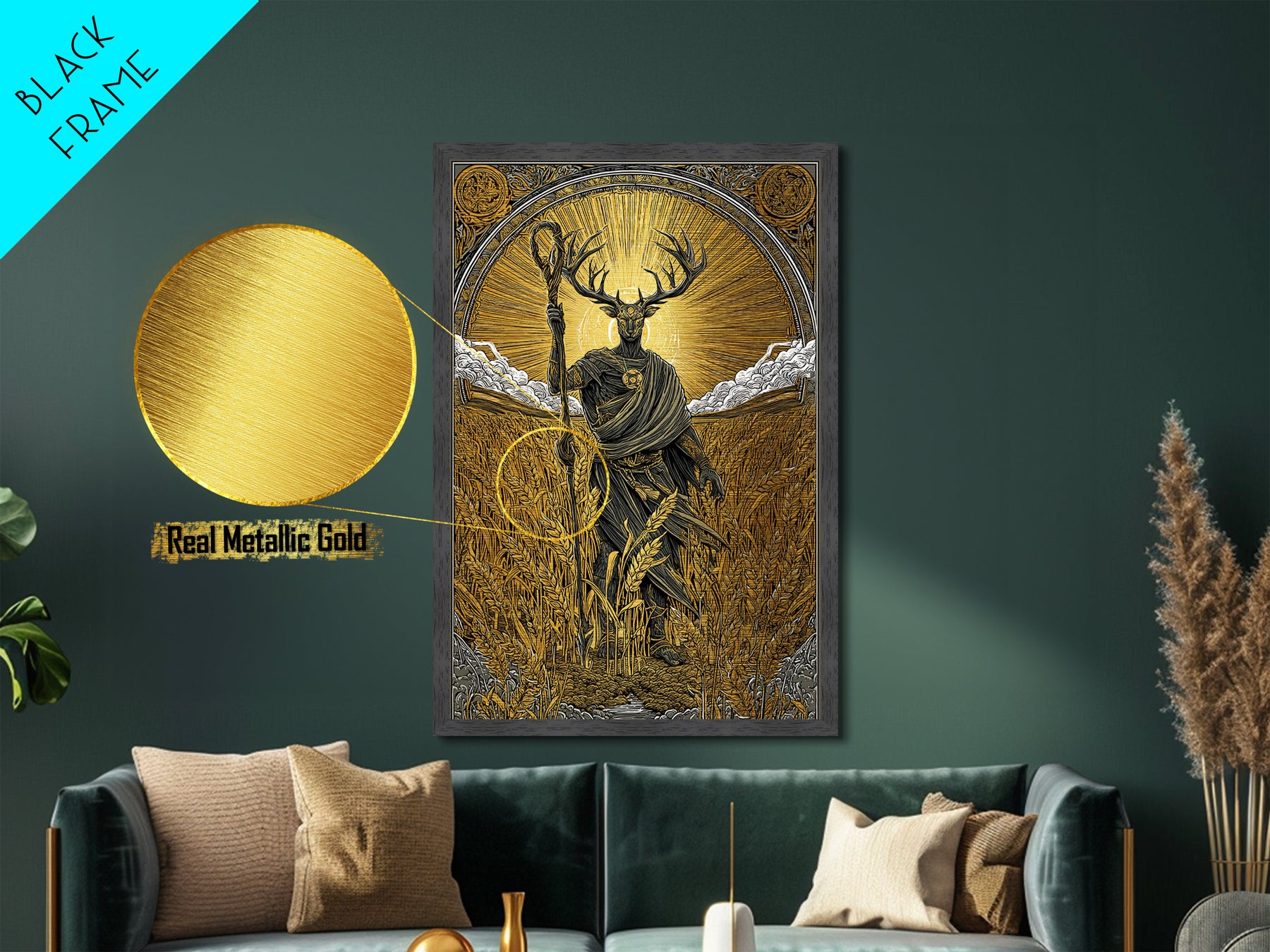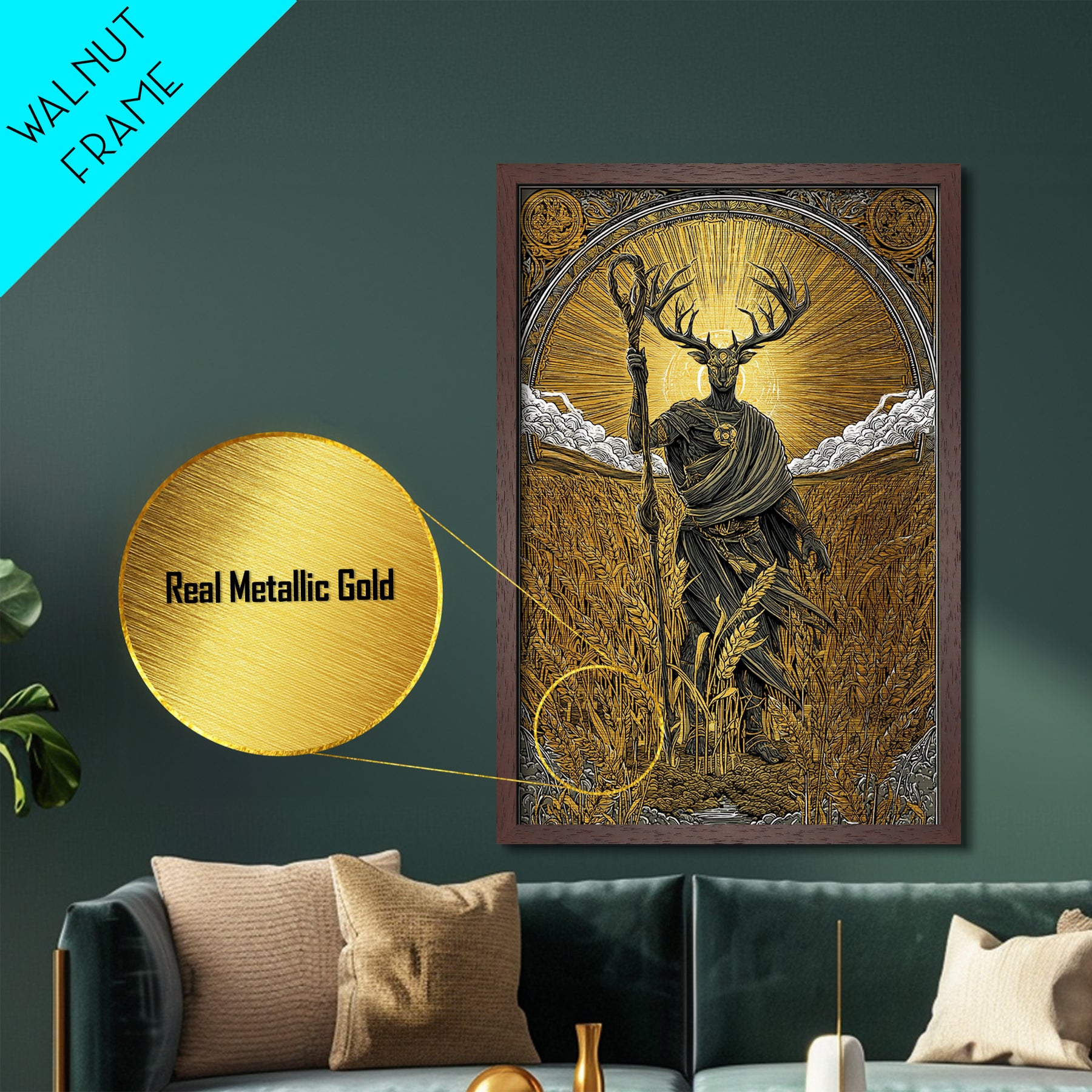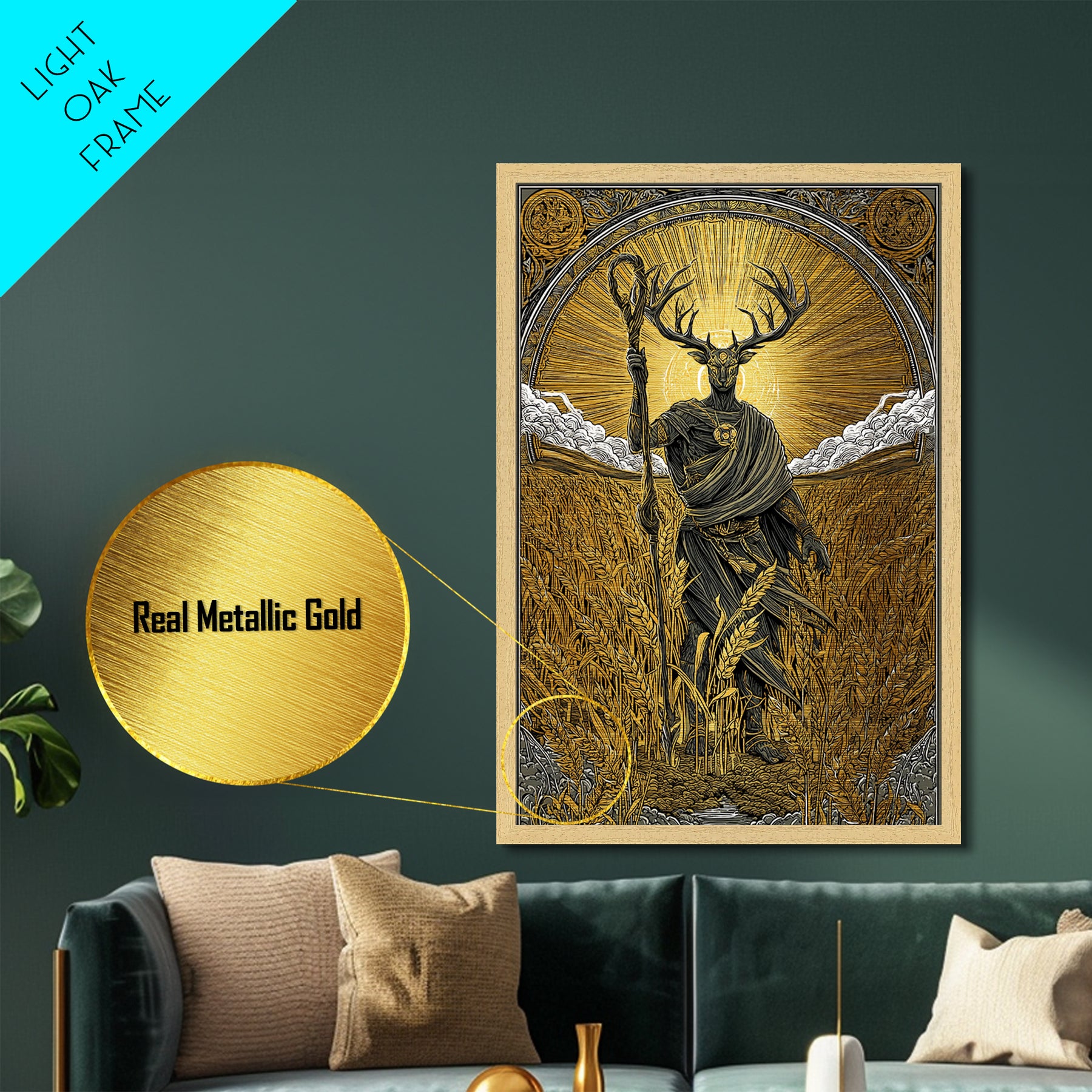Norse God Frey Metallic Gold Art Metal Art, Nordic Mythology Wall Decor, framed in real wood, Viking Office Wall Art, Unique Dad Gift