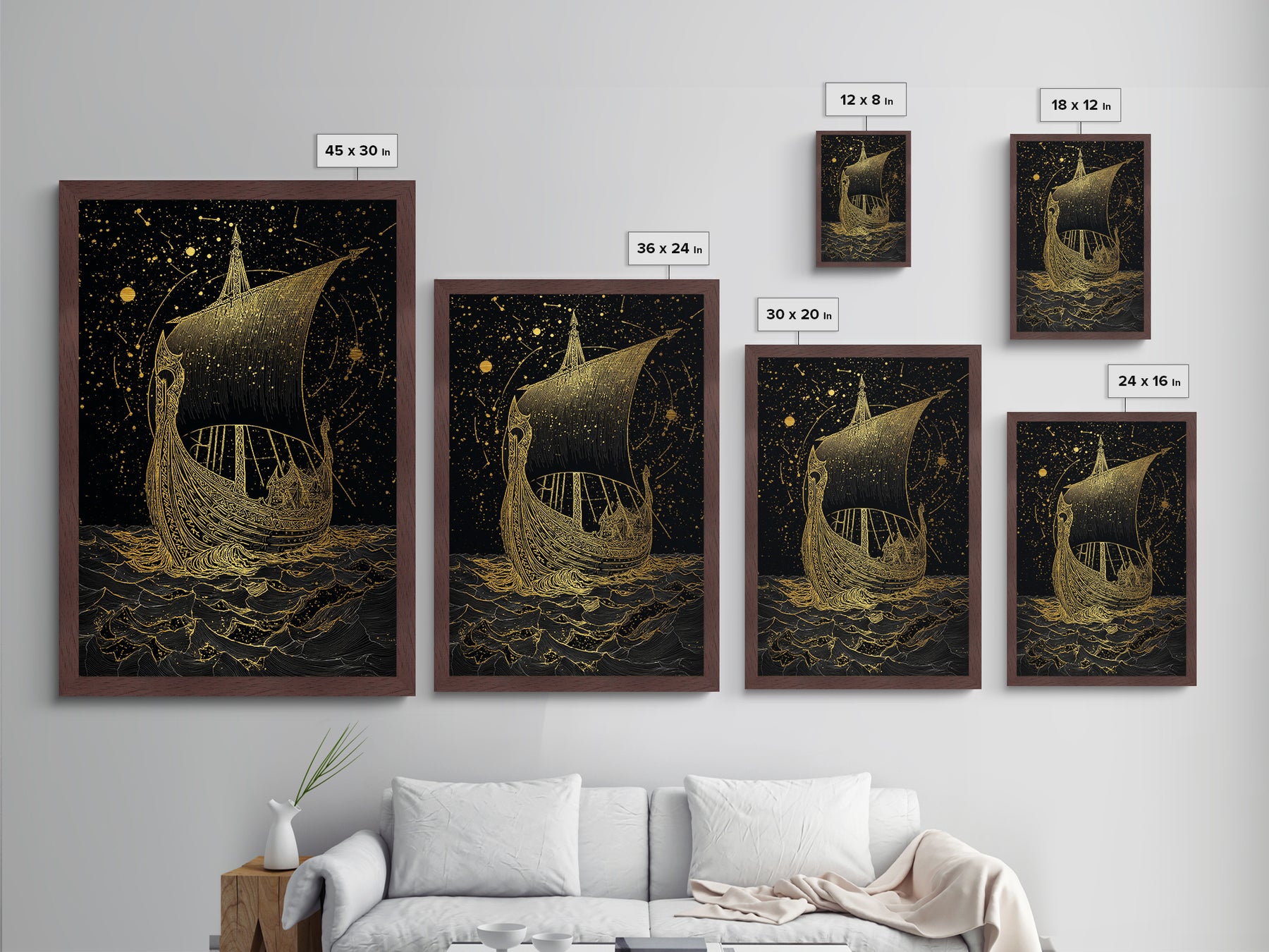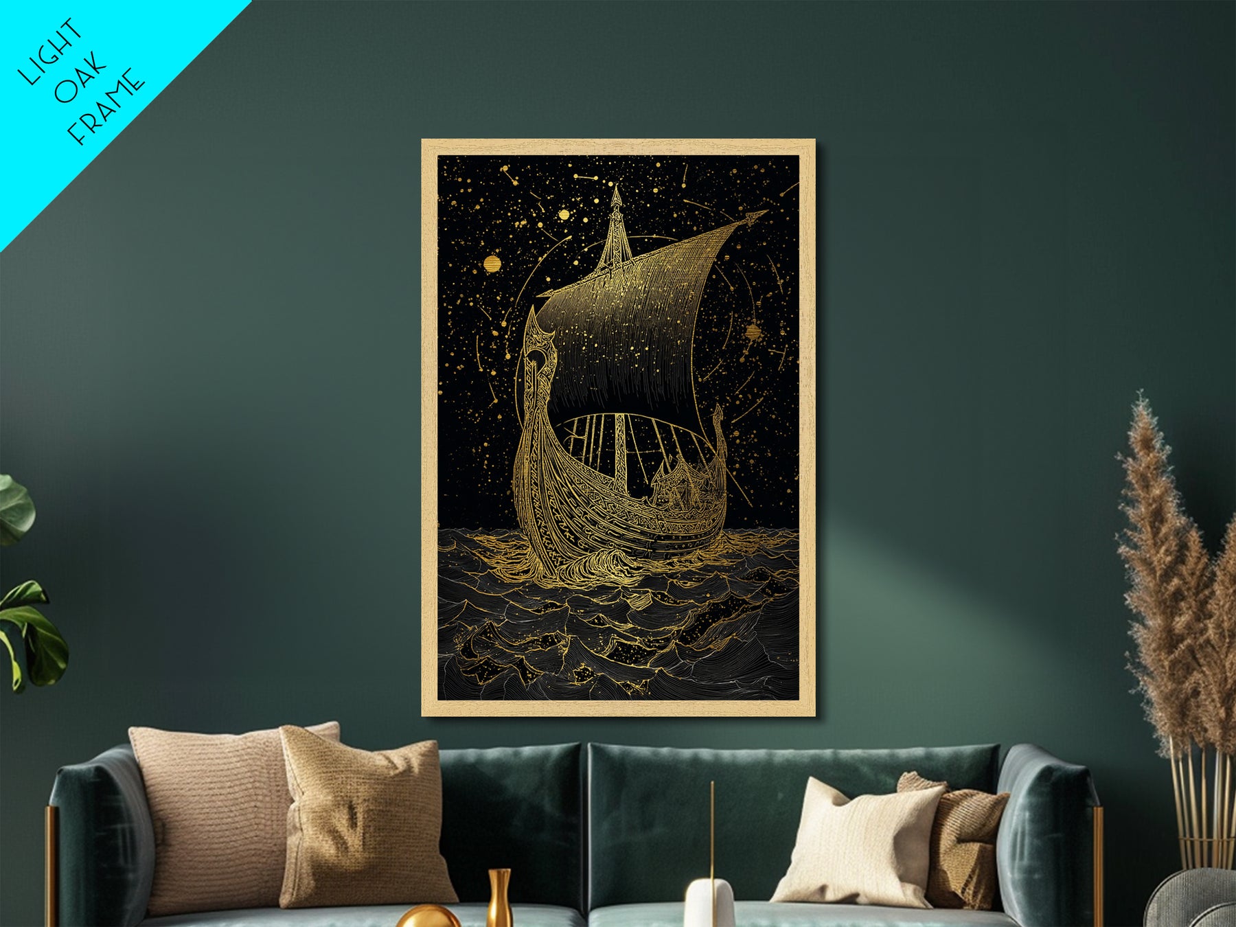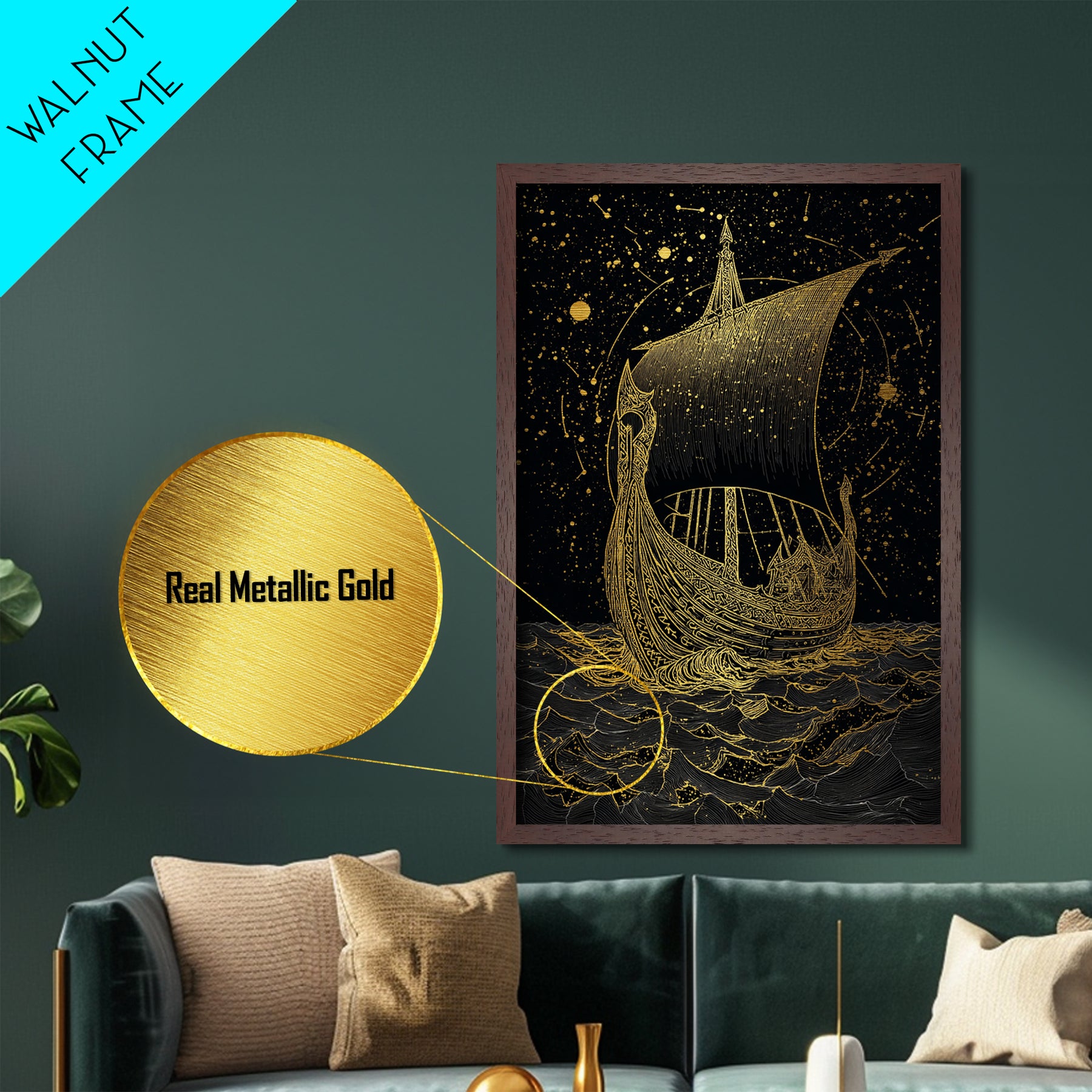 Norse Naglfar Viking Ship Artwork, Metallic Gold Art and Metal Art, Nordic Mythology wall décor framed in real wood, unique dad gift