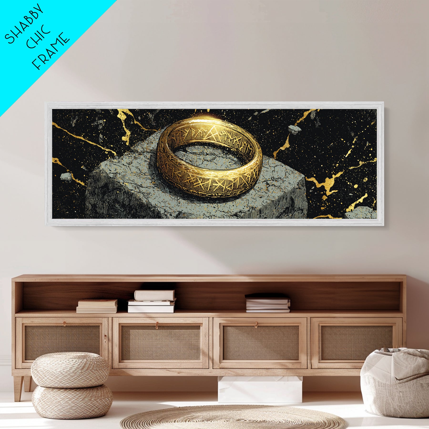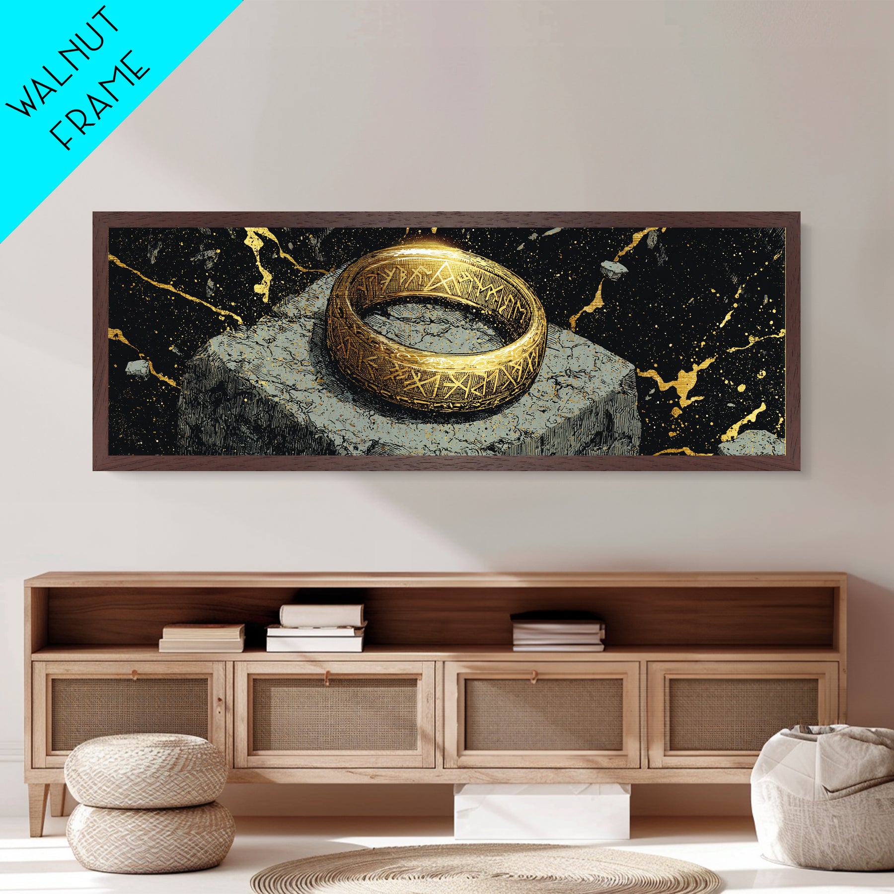 Norse Ring Metallic Gold Art Metal Art – Nordic Mythology Jewelry Symbol, Viking Inspired Wall Decor Office Gift, natural wood frame