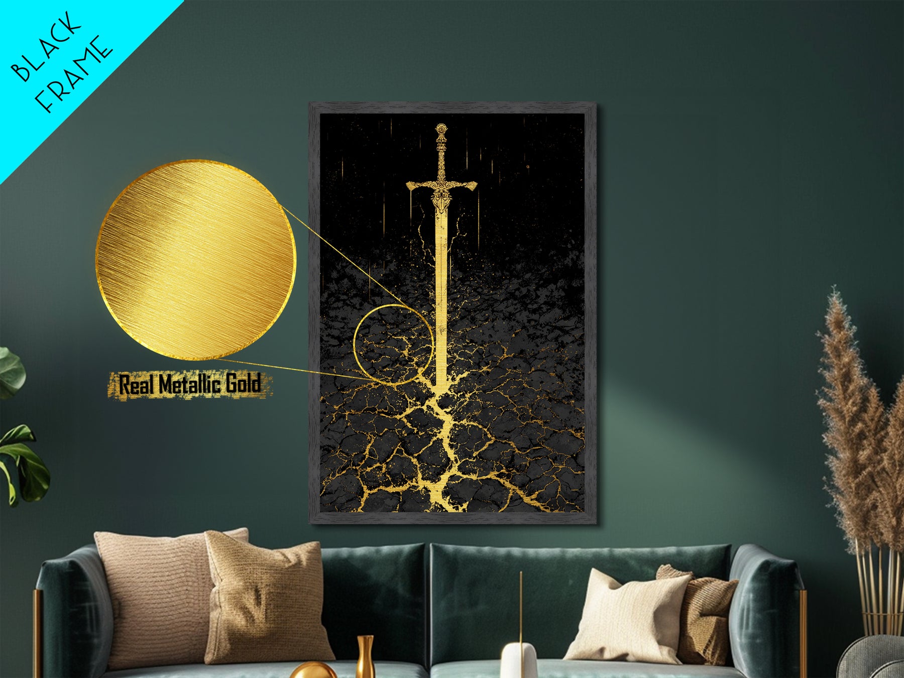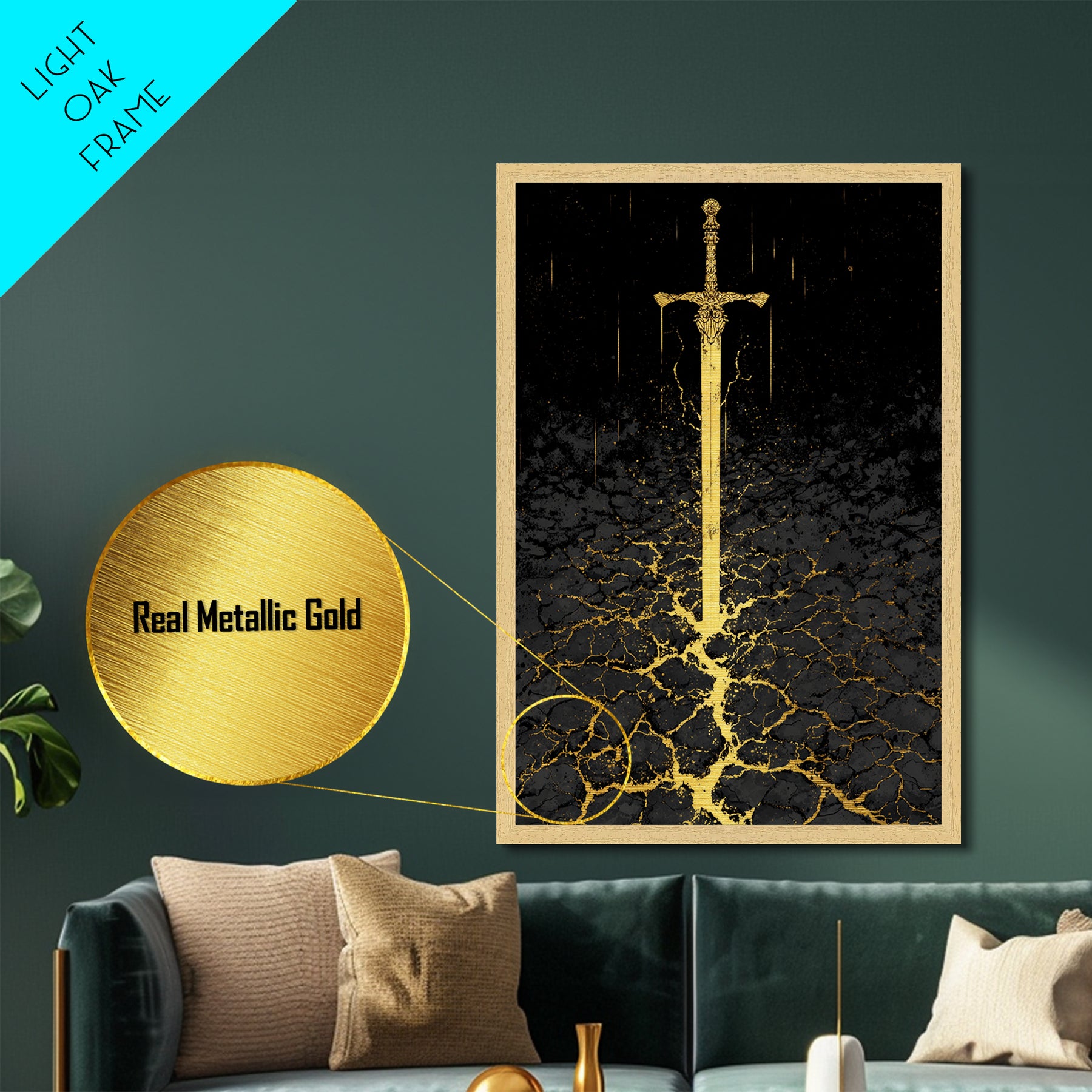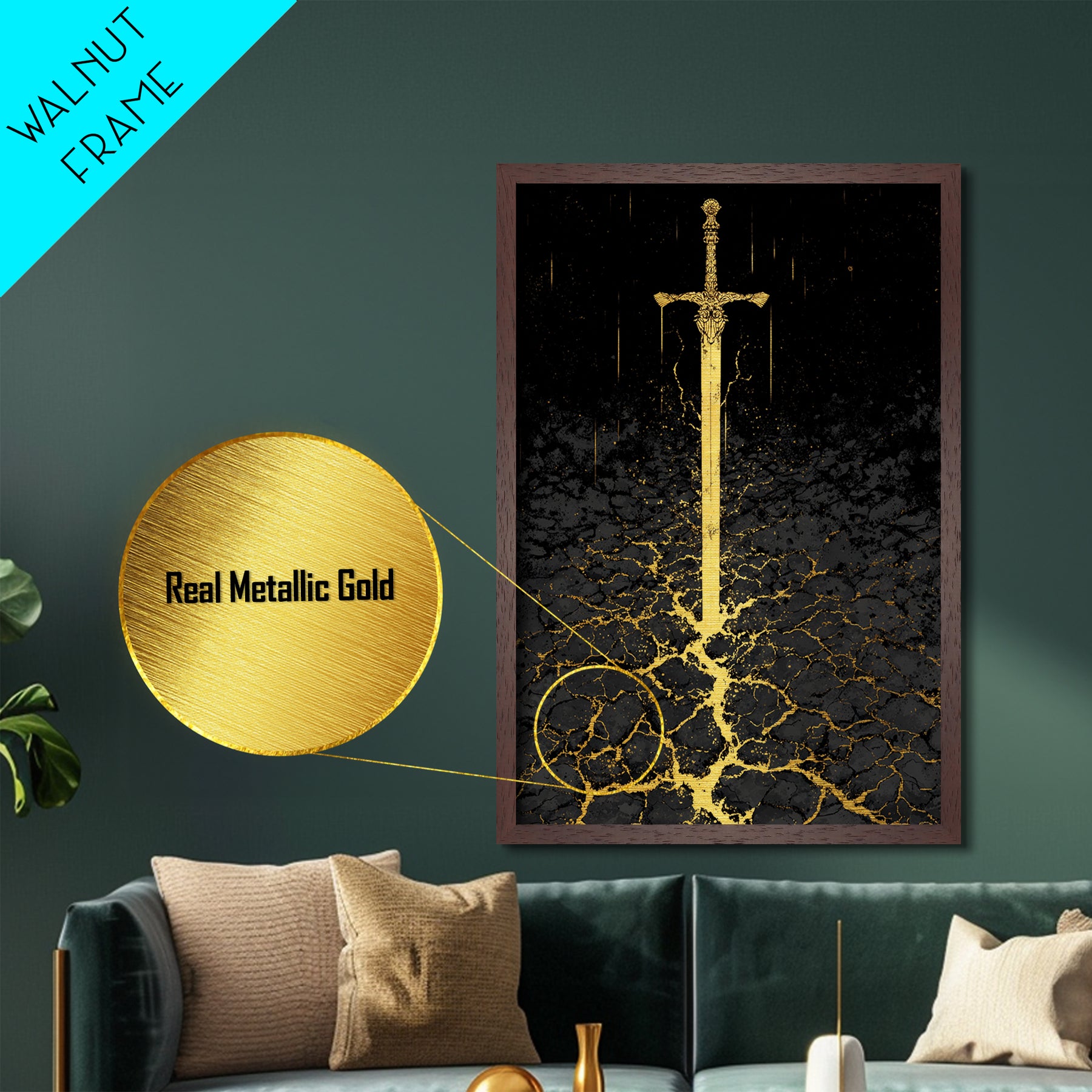 Norse Warrior Sword Metallic Gold Art Metal Art | Viking Mythology Weapon Wall Decor Dad Gift | Office Art with Natural Wood Frame